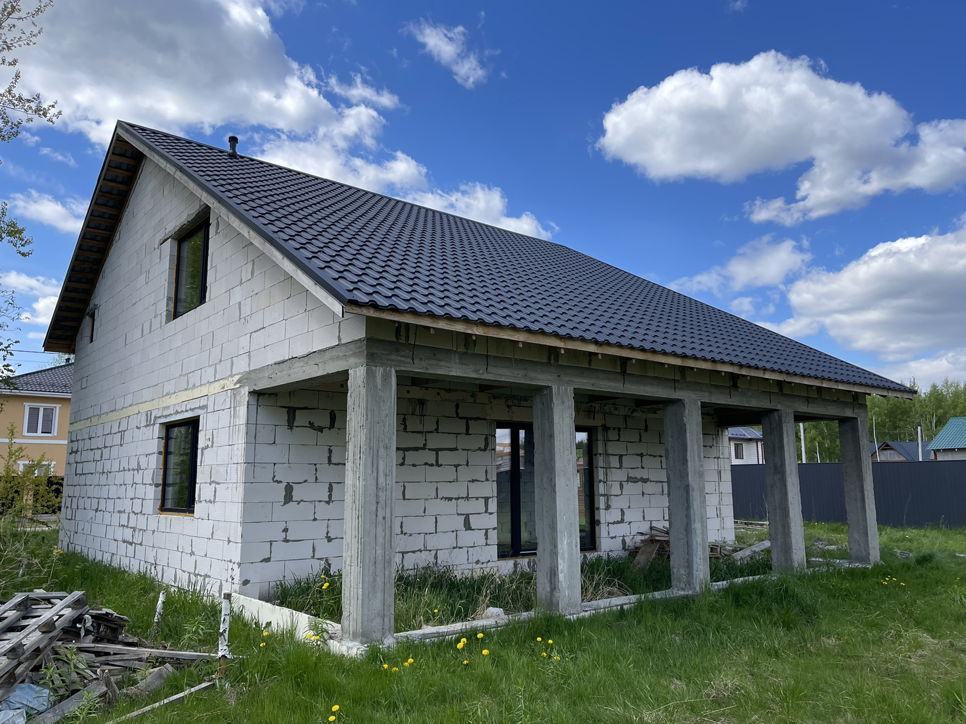 - Просторная открытая веранда с видом на внутренний двор по периметру монлитный армопояс с полнотелыми бетонными опорными колоннами (5шт.)