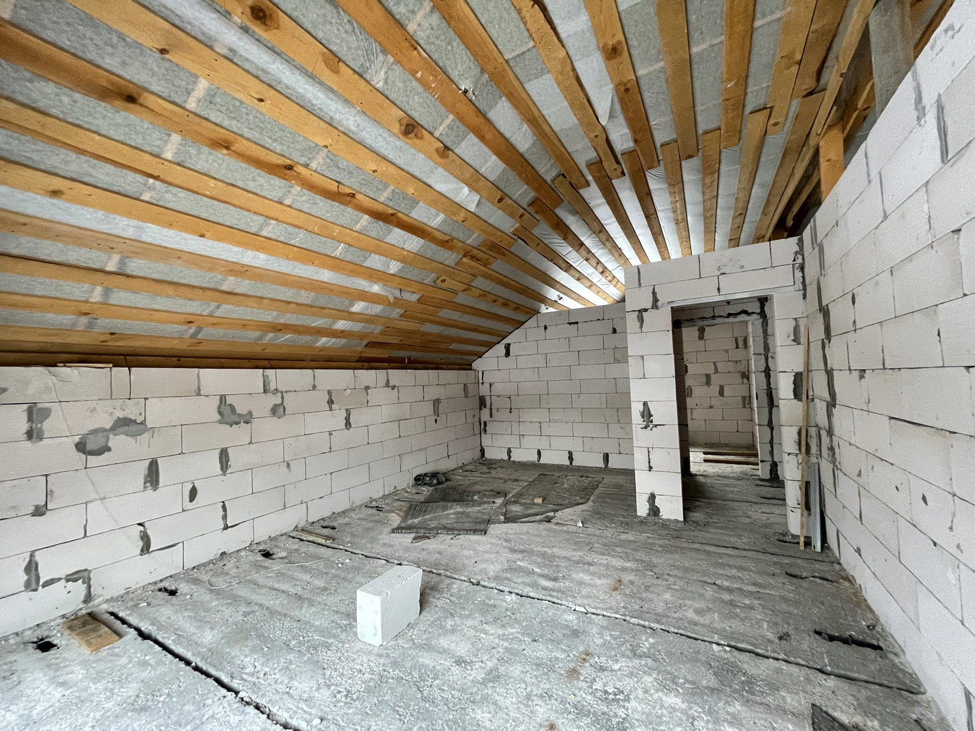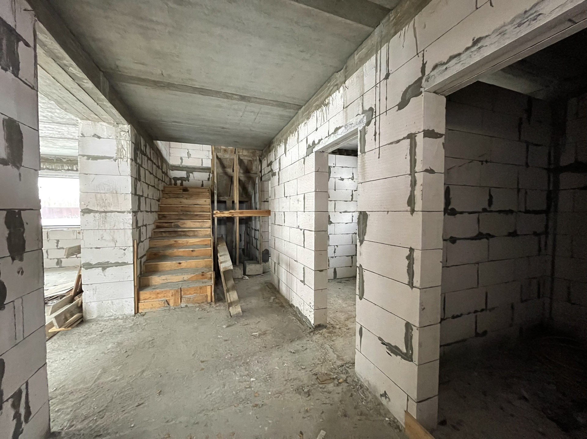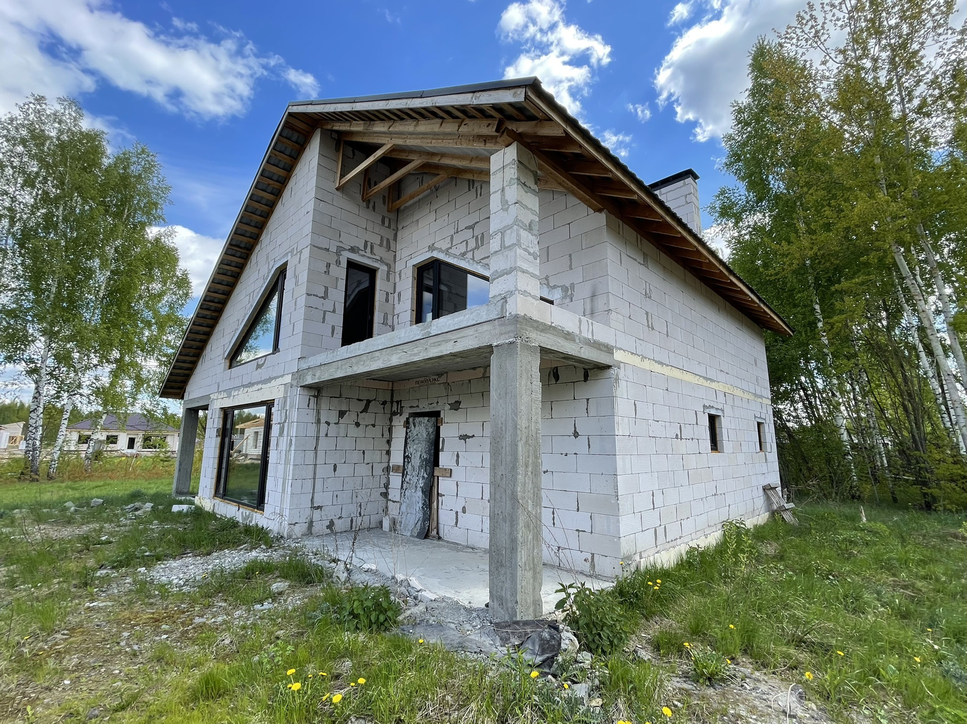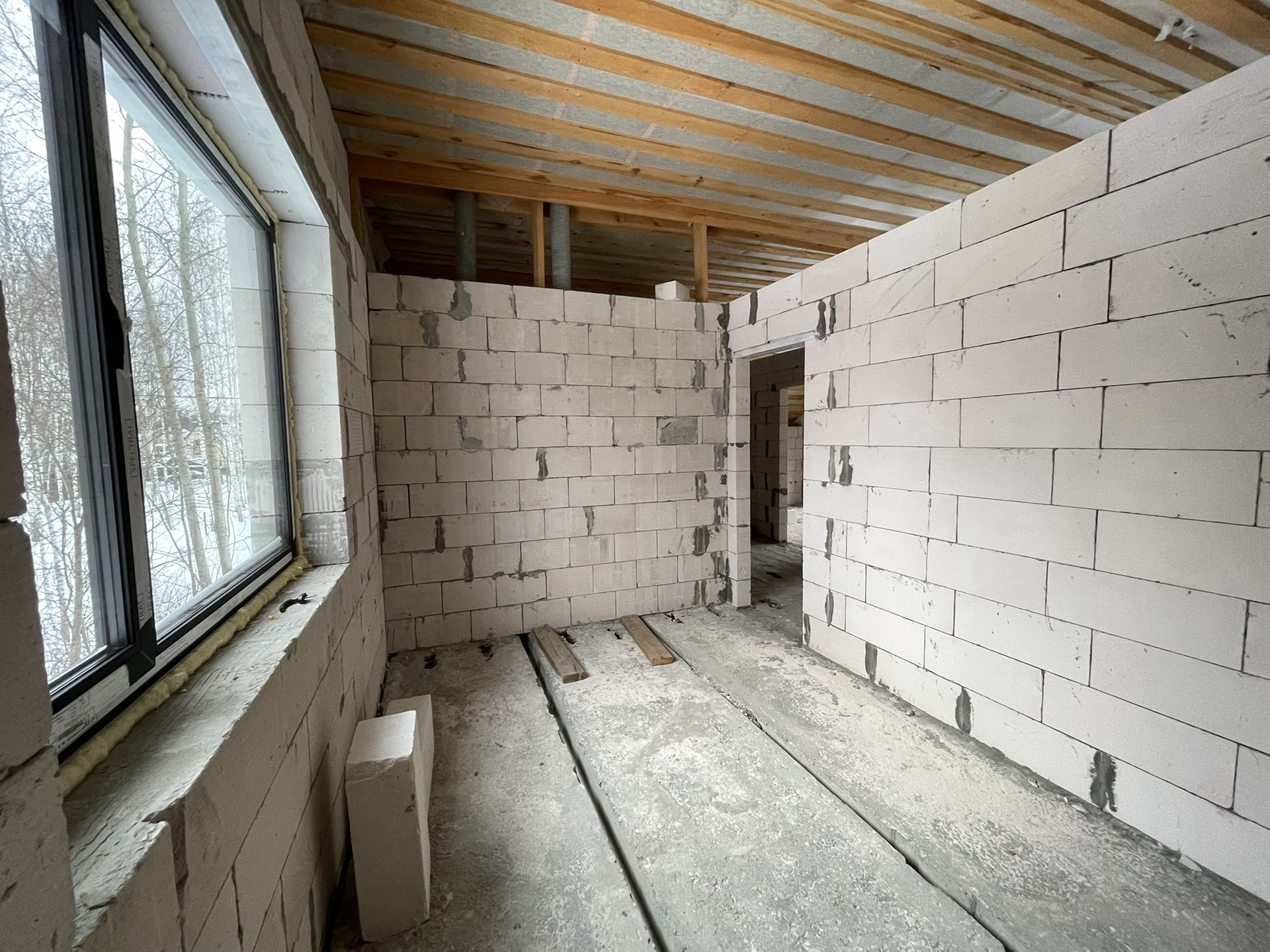 - Стены - стеновой блок (газобетон) Bonolit Projects, плотность D500, размер 600*400*200 мм, отличается очень хорошей теплоизоляцией, звукоизоляцией и морозостойкостью. Каждые 3 слоя идёт армирование прутком для большей прочности и надежности конструкции. Армированный монолитный пояс связки 1 и 2 этажей.