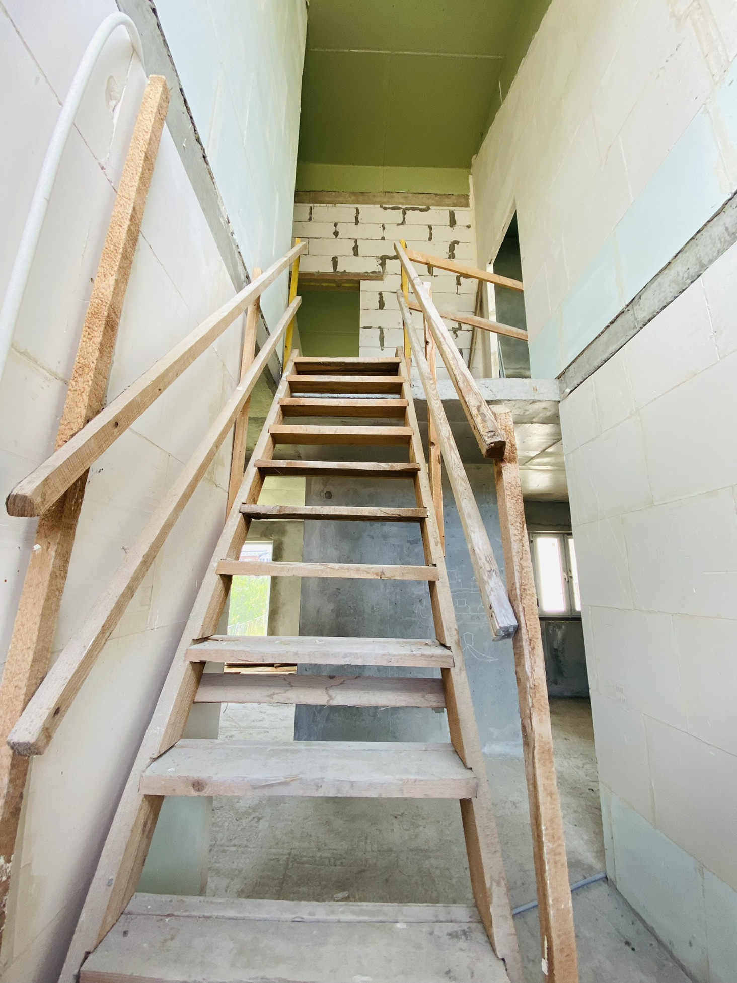 Высота первого этажа - 3,2 метра. На втором этаже потолок по кромке крыши, в самом верхней части - около 6 метров (многие соседи сделали 3й этаж).