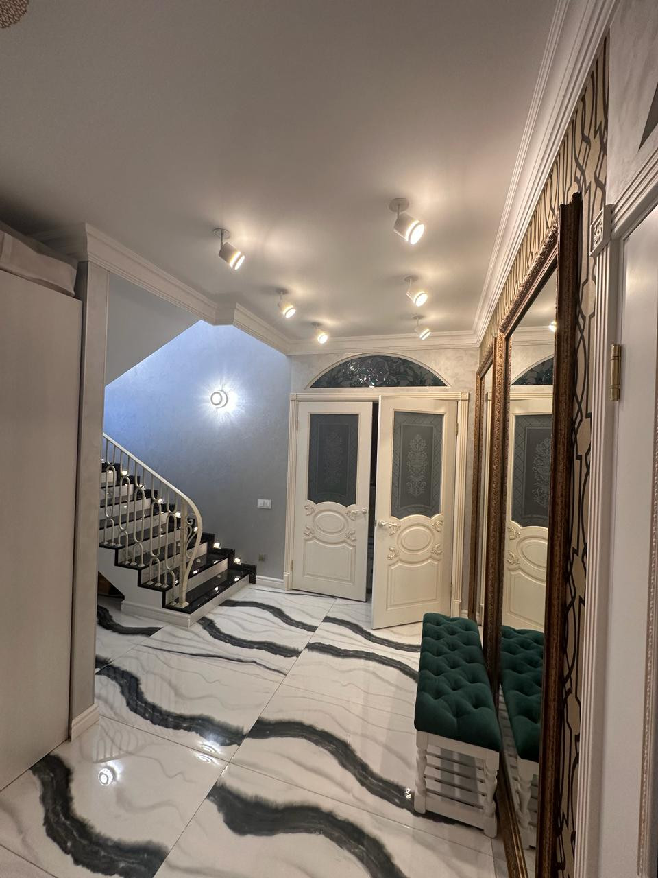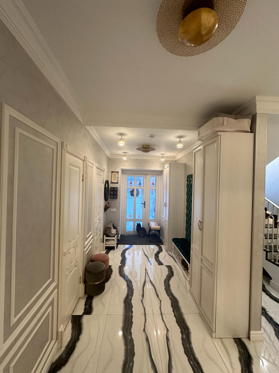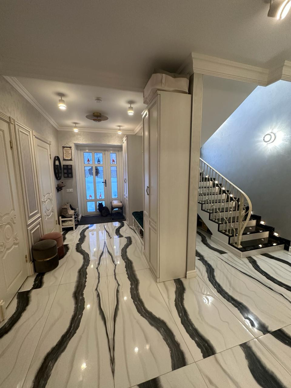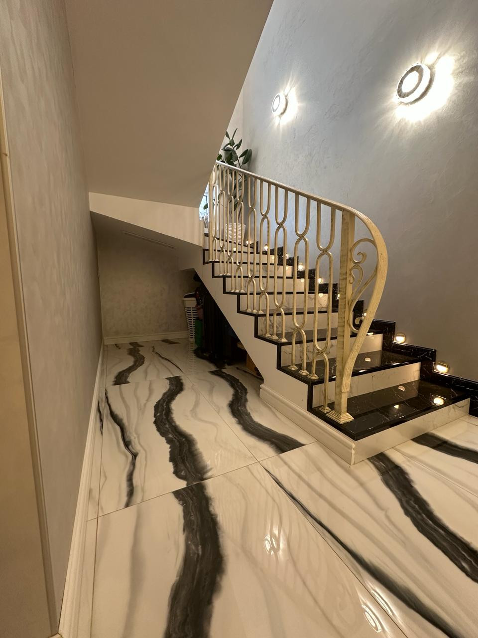 На первом этаже покрытие керамогранит с полированной поверхностью, фактура под мрамор. Выразительный рисунок. На стенах декоративная штукатурка.
