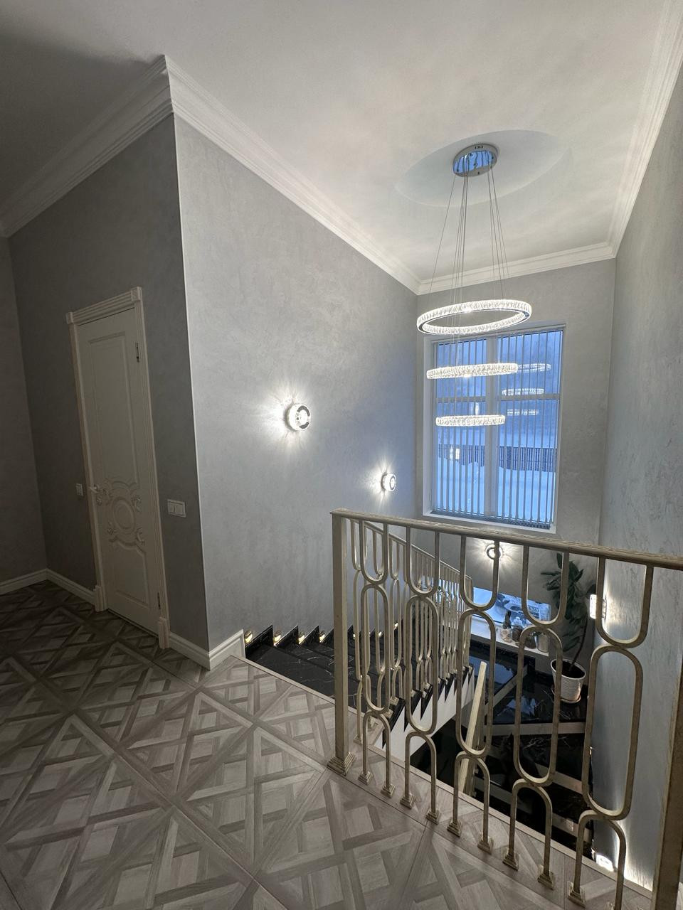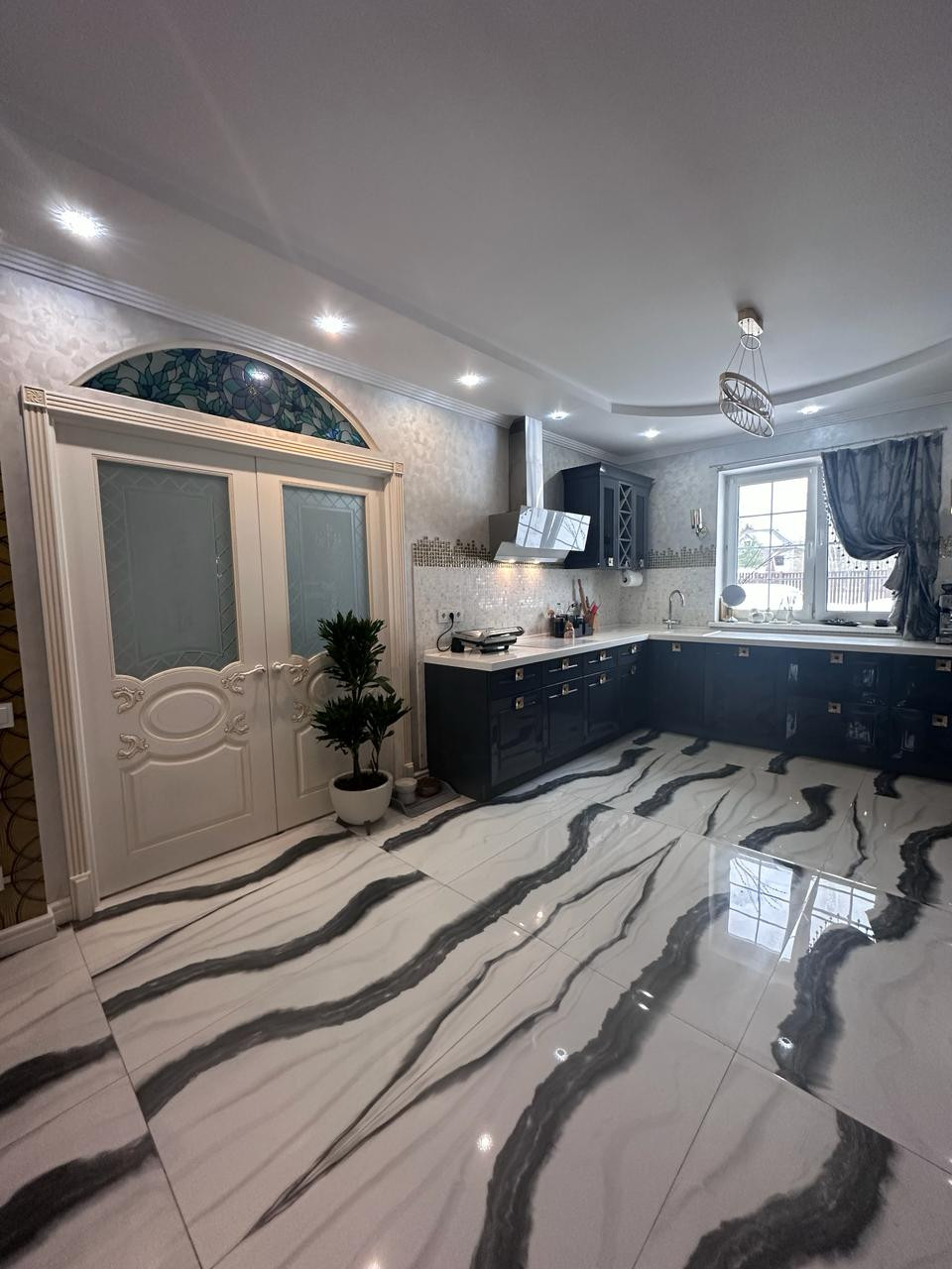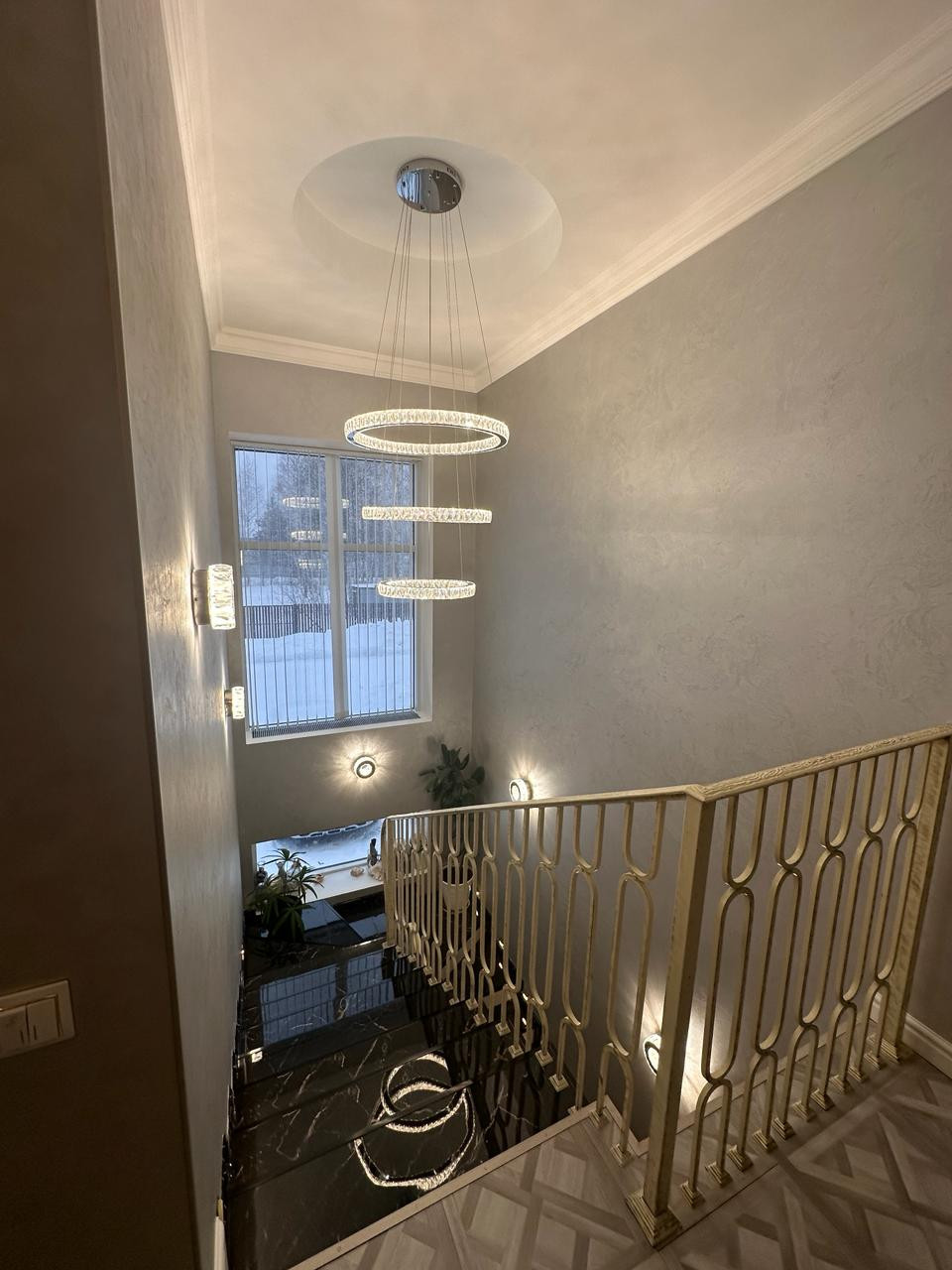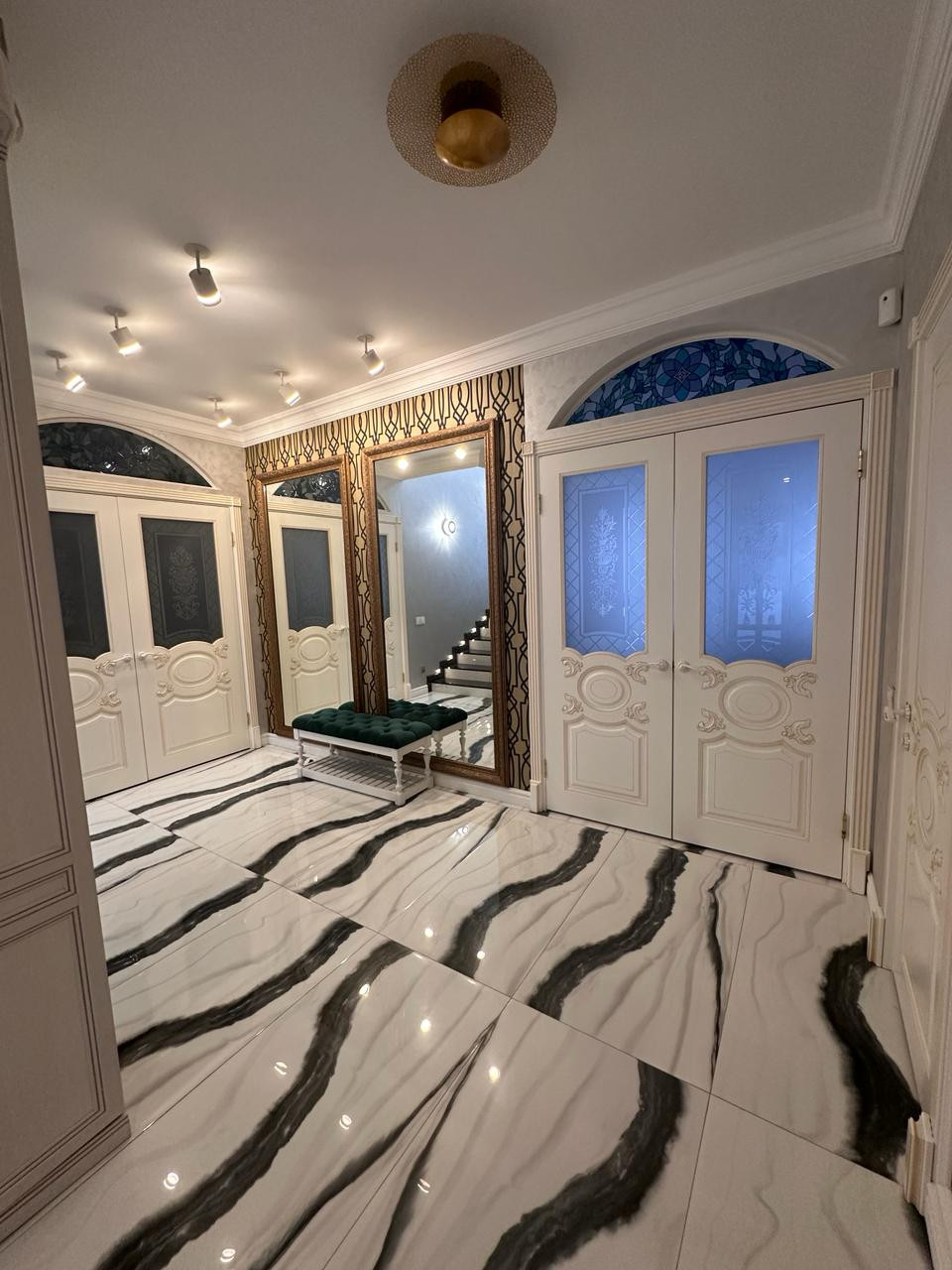 На первом этаже покрытие керамогранит с полированной поверхностью, фактура под мрамор. Выразительный рисунок. На стенах декоративная штукатурка.