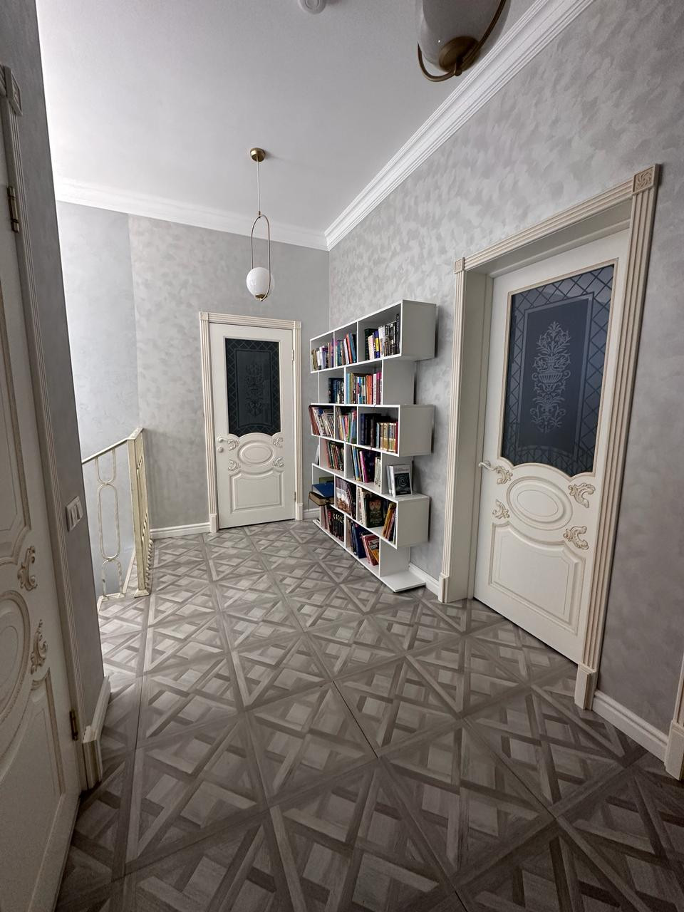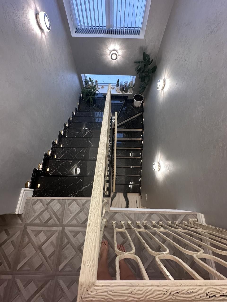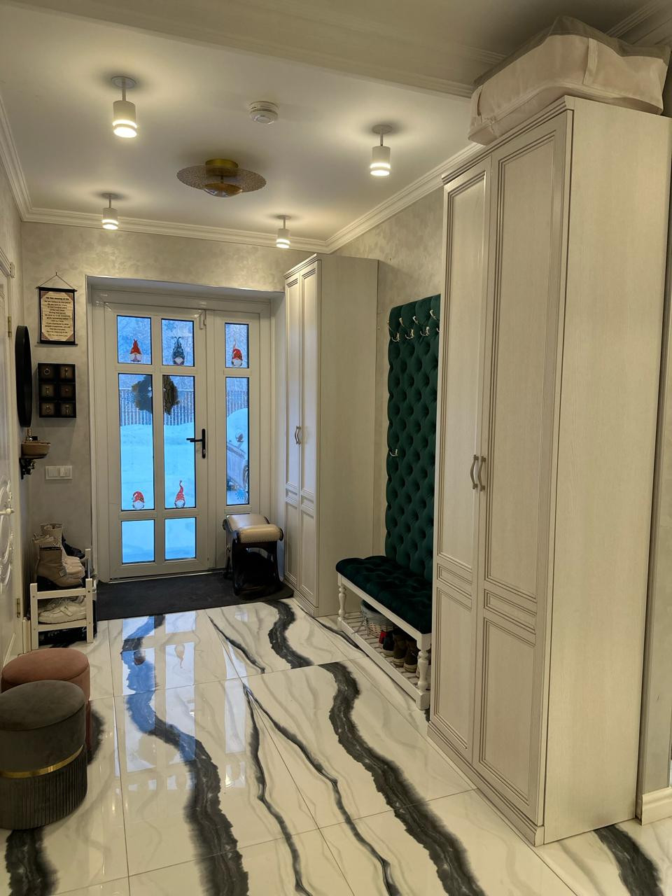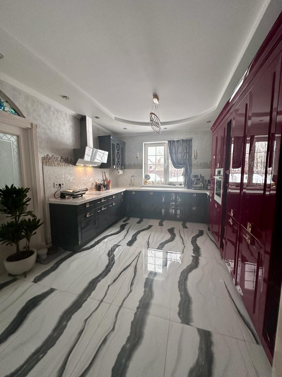 На первом этаже покрытие керамогранит с полированной поверхностью, фактура под мрамор. Выразительный рисунок. На стенах декоративная штукатурка.