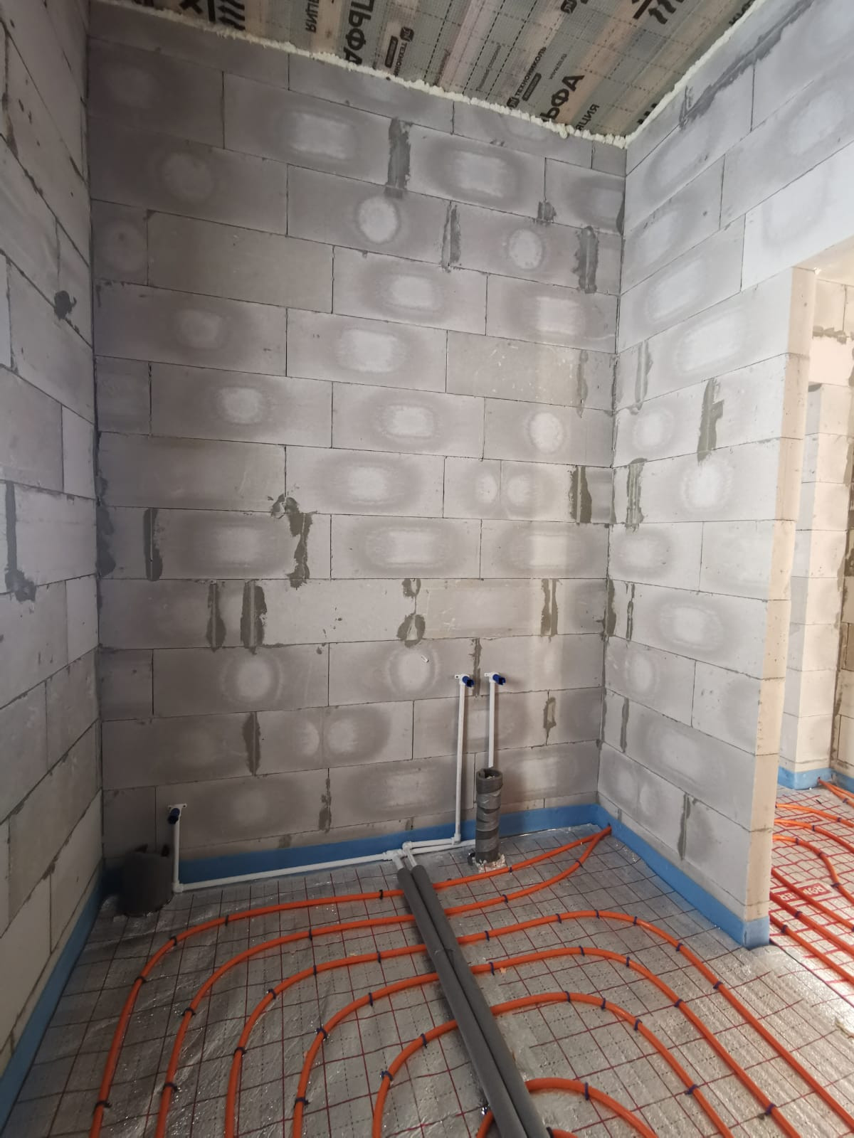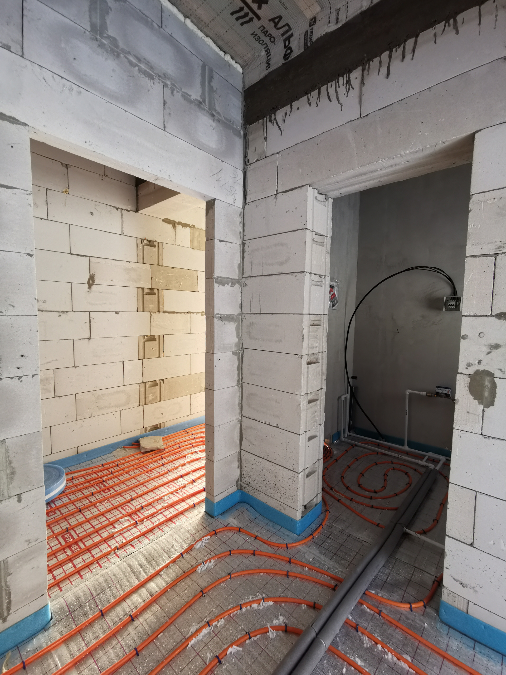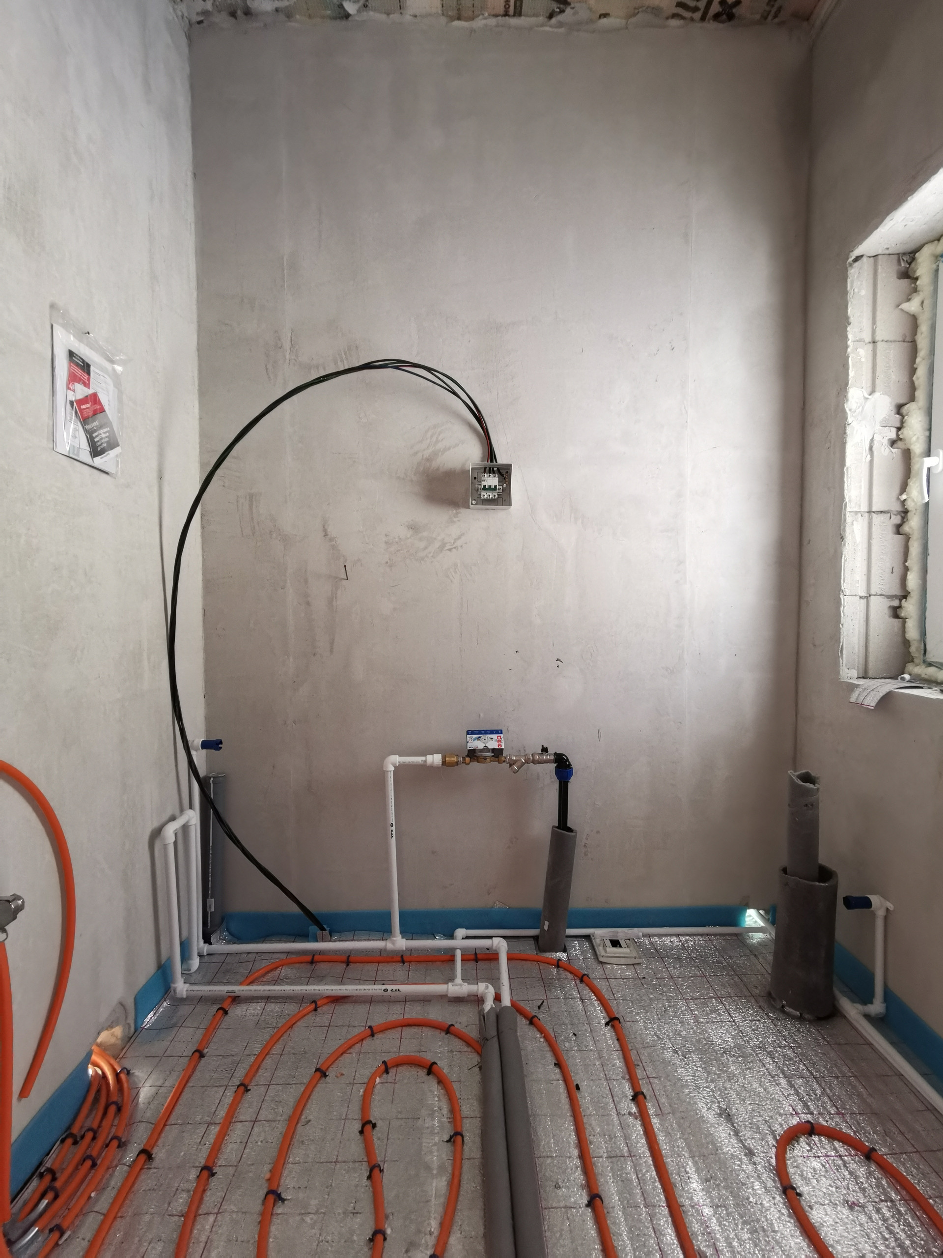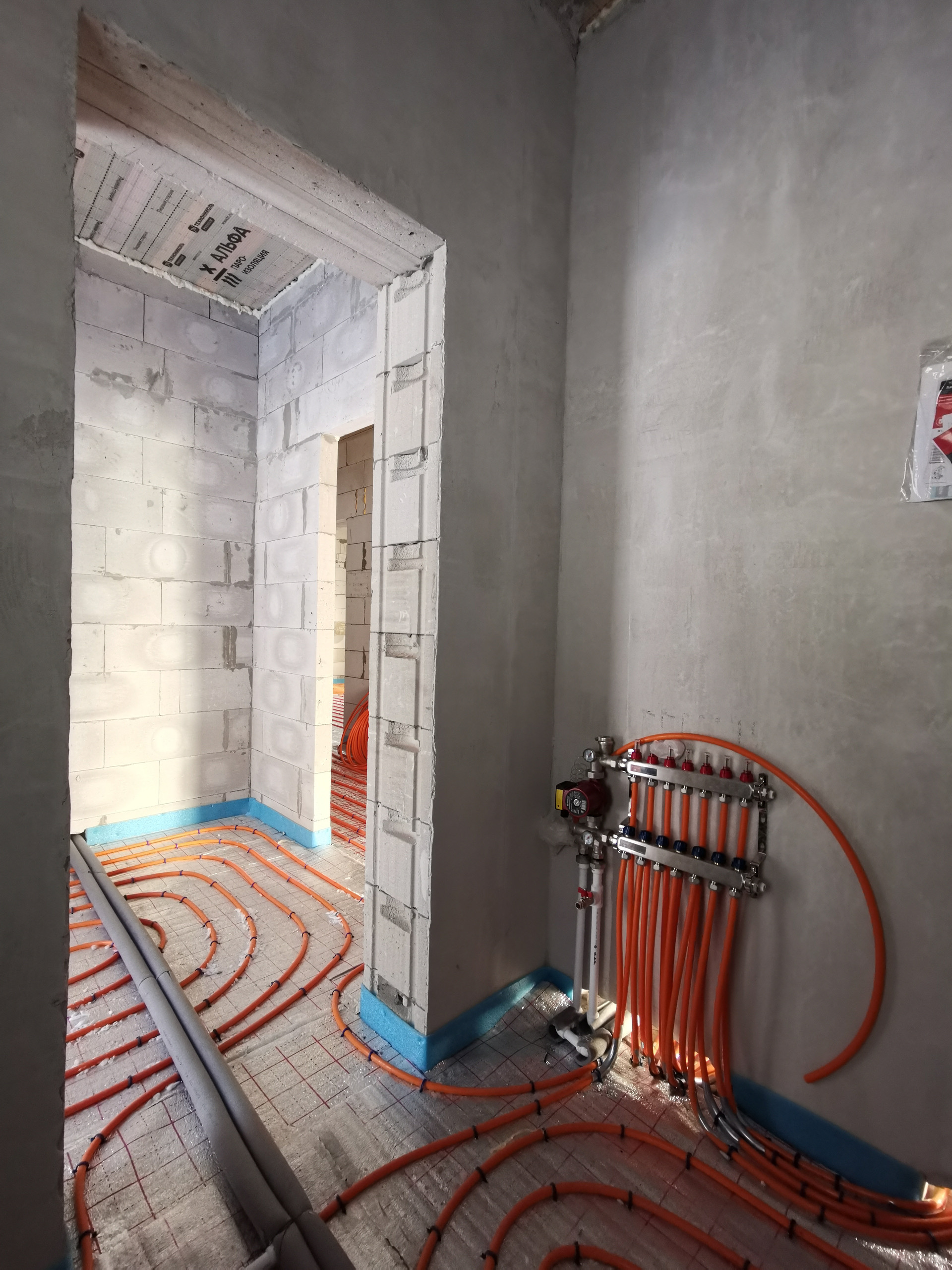 - Разводка труб холодной и горячей воды по дому, теплый водяной пол, чистовая стяжка, газовый котел с обвязкой, электрическая распределительная коробка, радиатор на мансардном этаже.