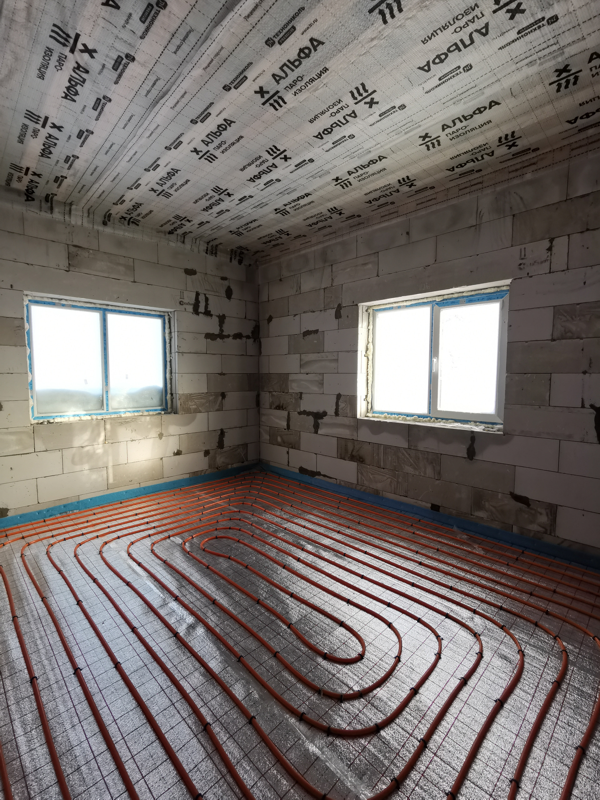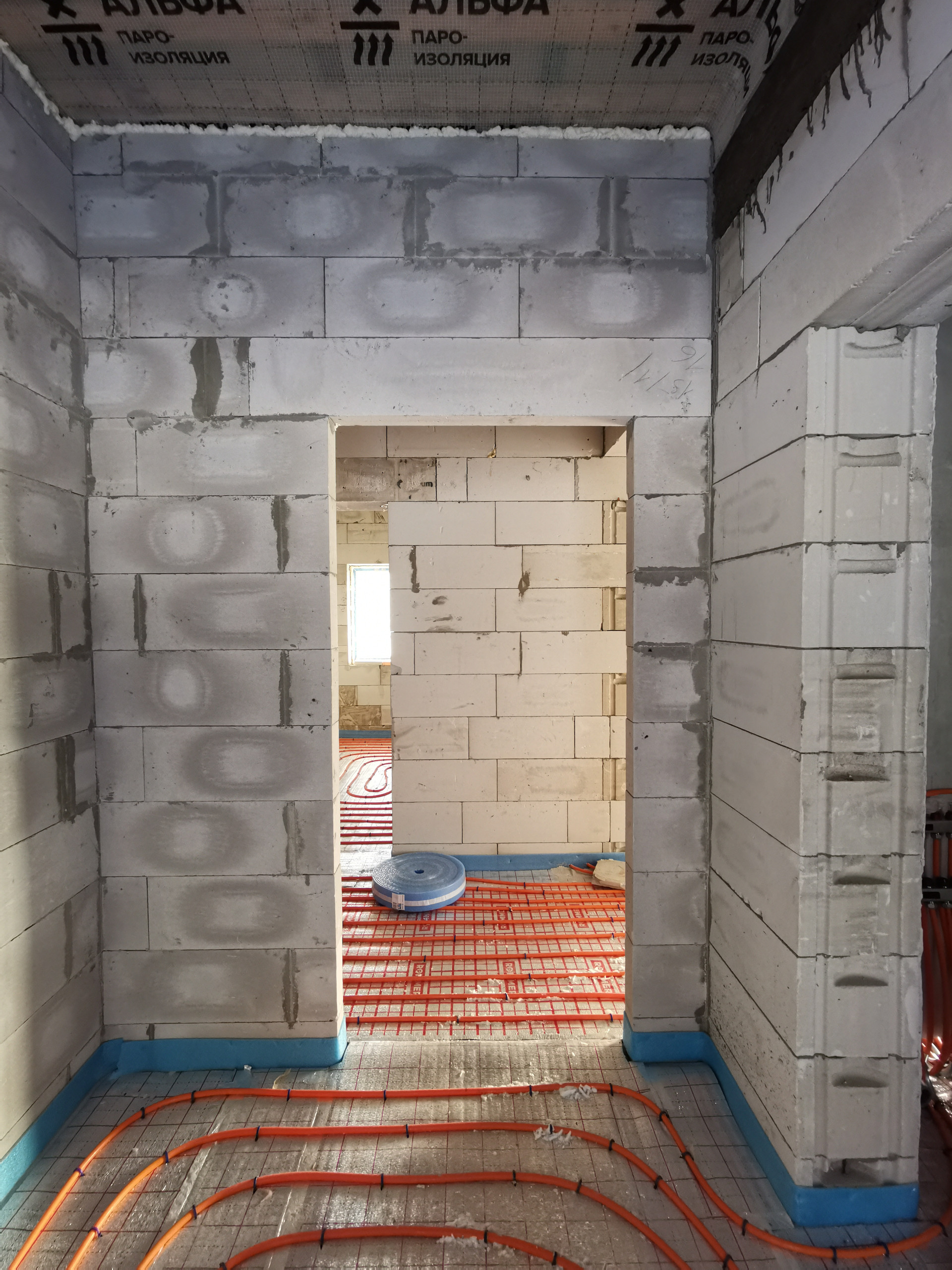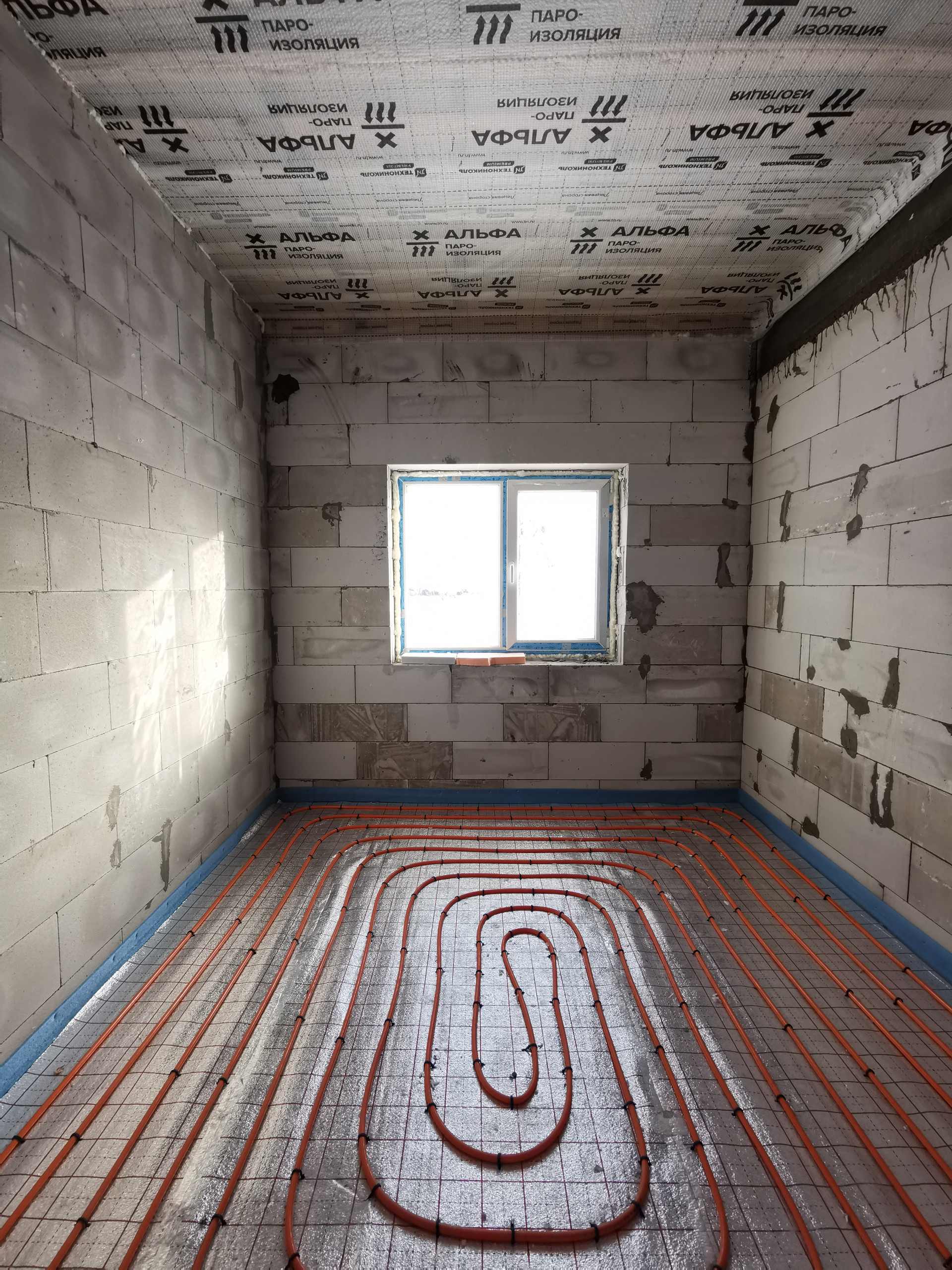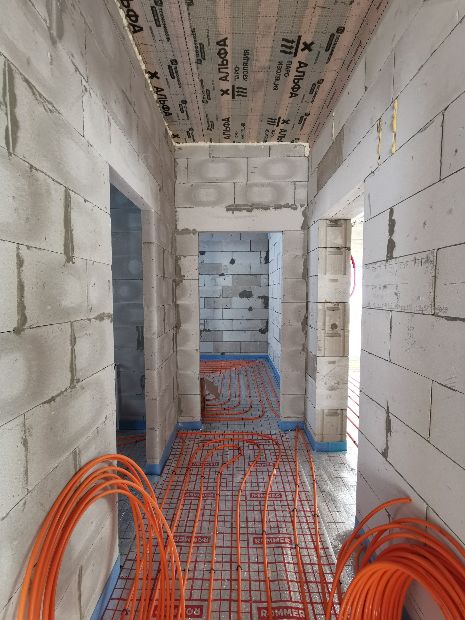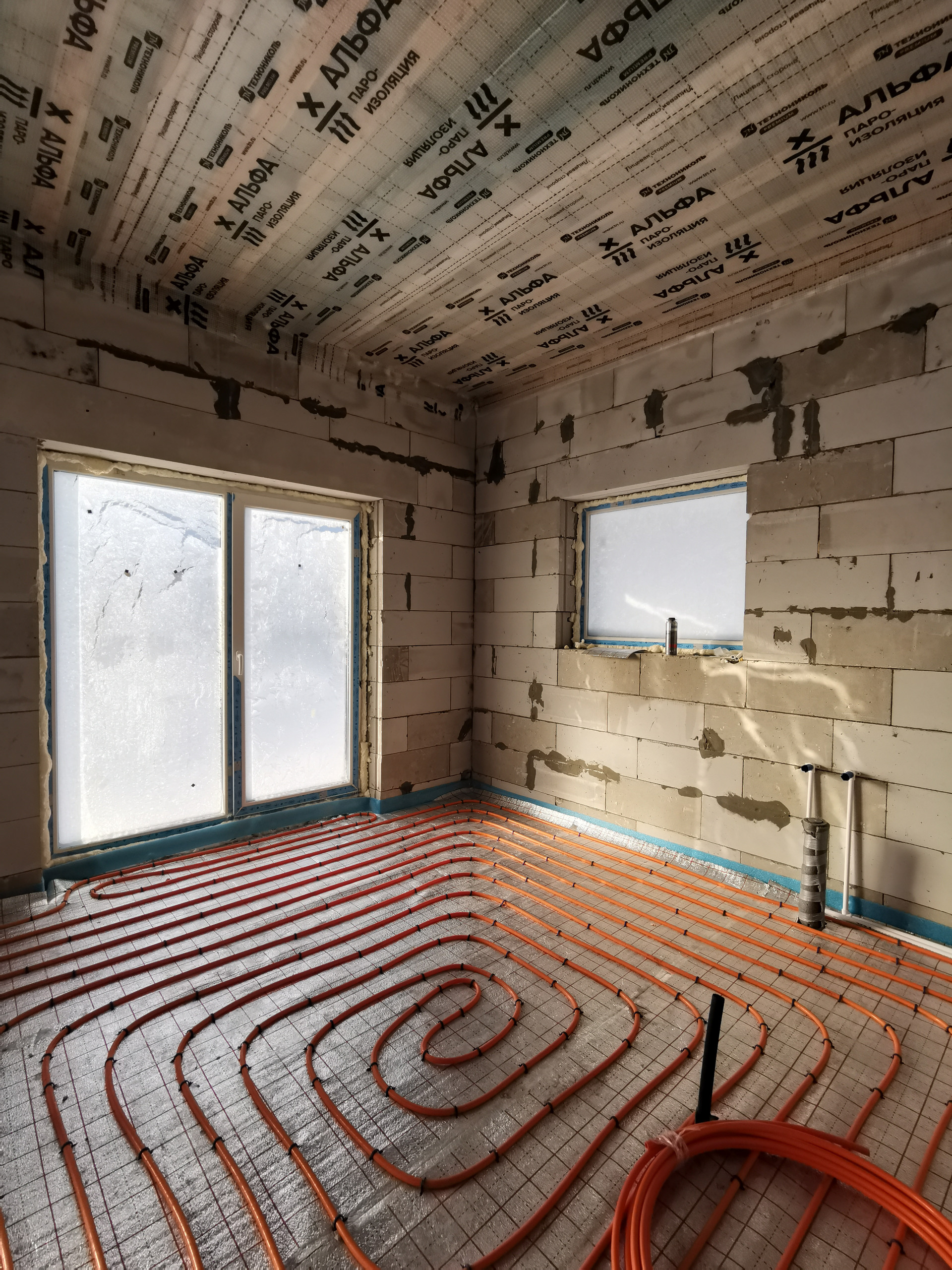- Разводка труб холодной и горячей воды по дому, теплый водяной пол, чистовая стяжка, газовый котел с обвязкой, электрическая распределительная коробка, радиатор на мансардном этаже.