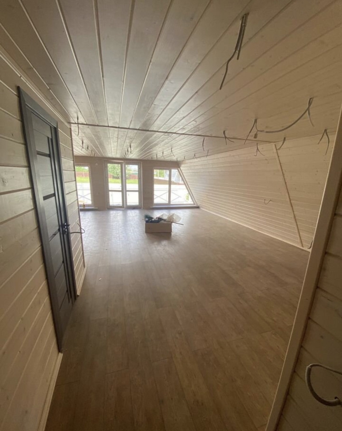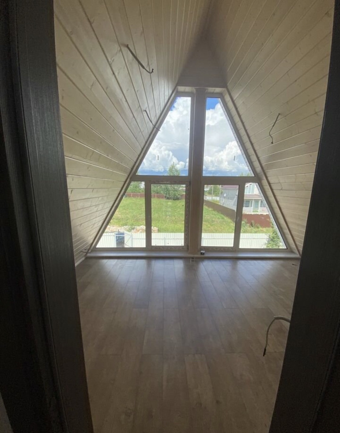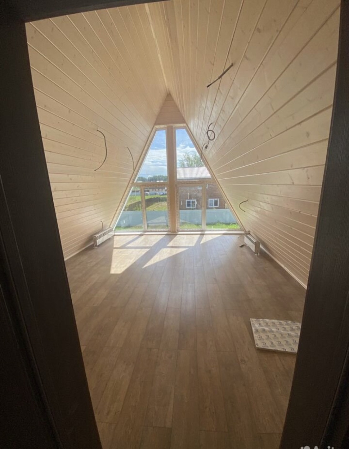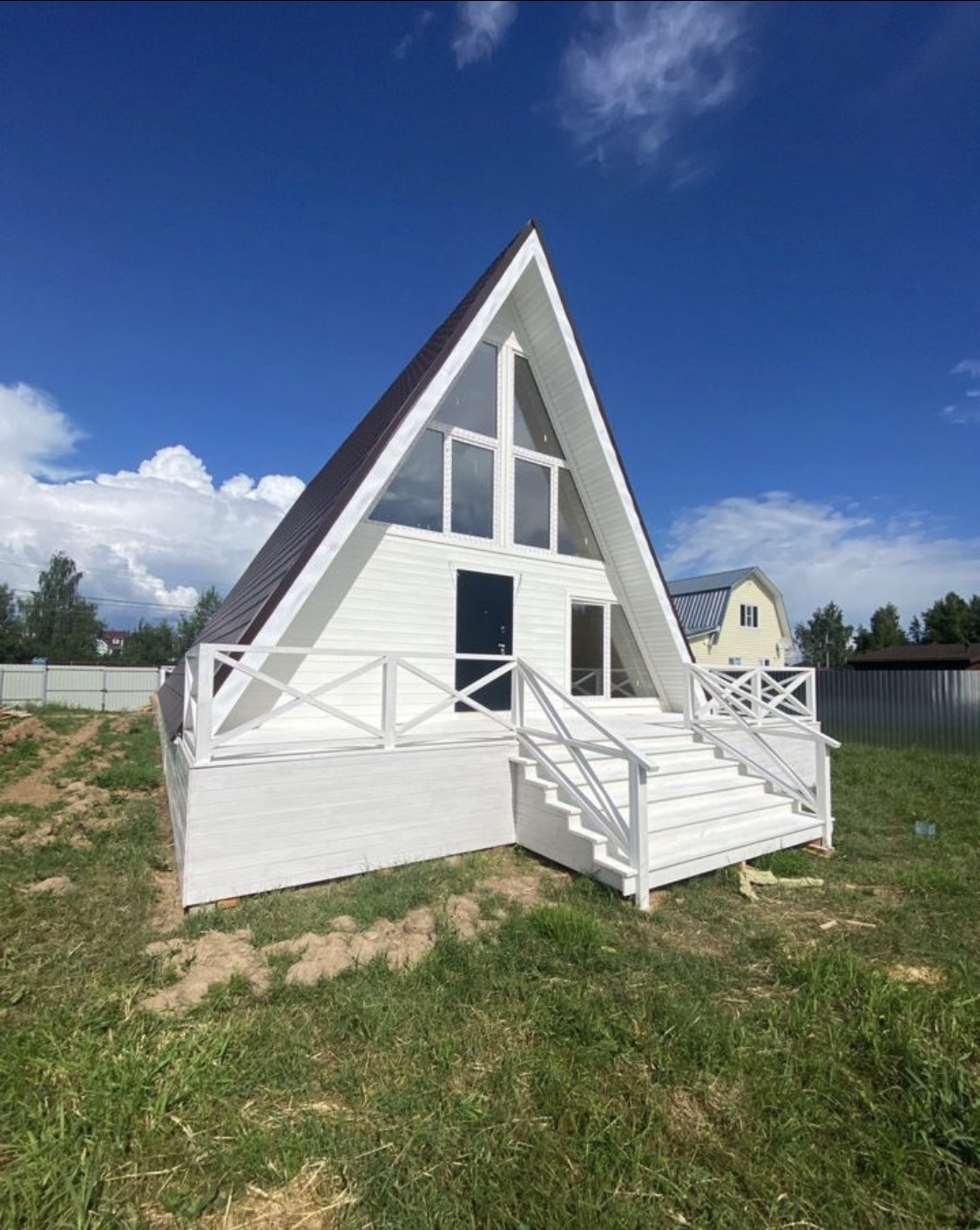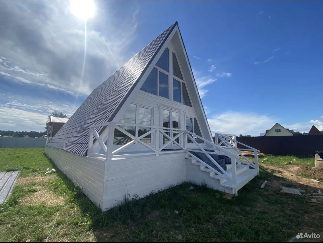 А - фрейм, дом полностью готов, осталось наполнить уютом, смехом и конечно мебелью. КП полностью готов, ни каких строек больше не будет, КП под охраной, на территории большой пруд плавают лебеди, детские площадки, дорожки заасфальтированы.