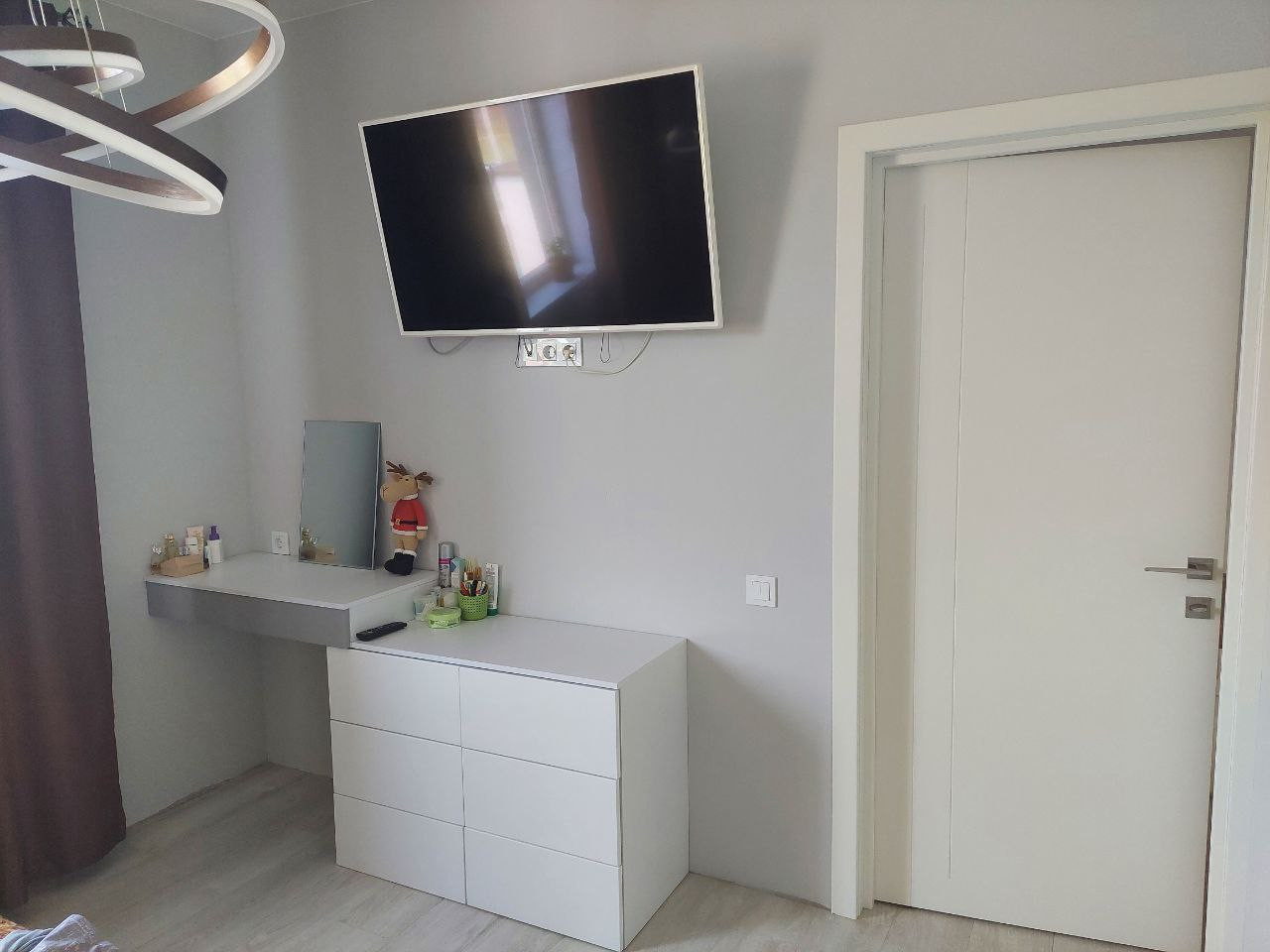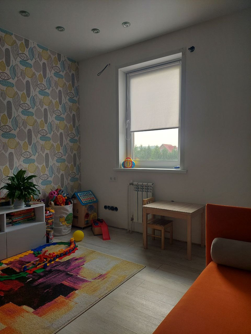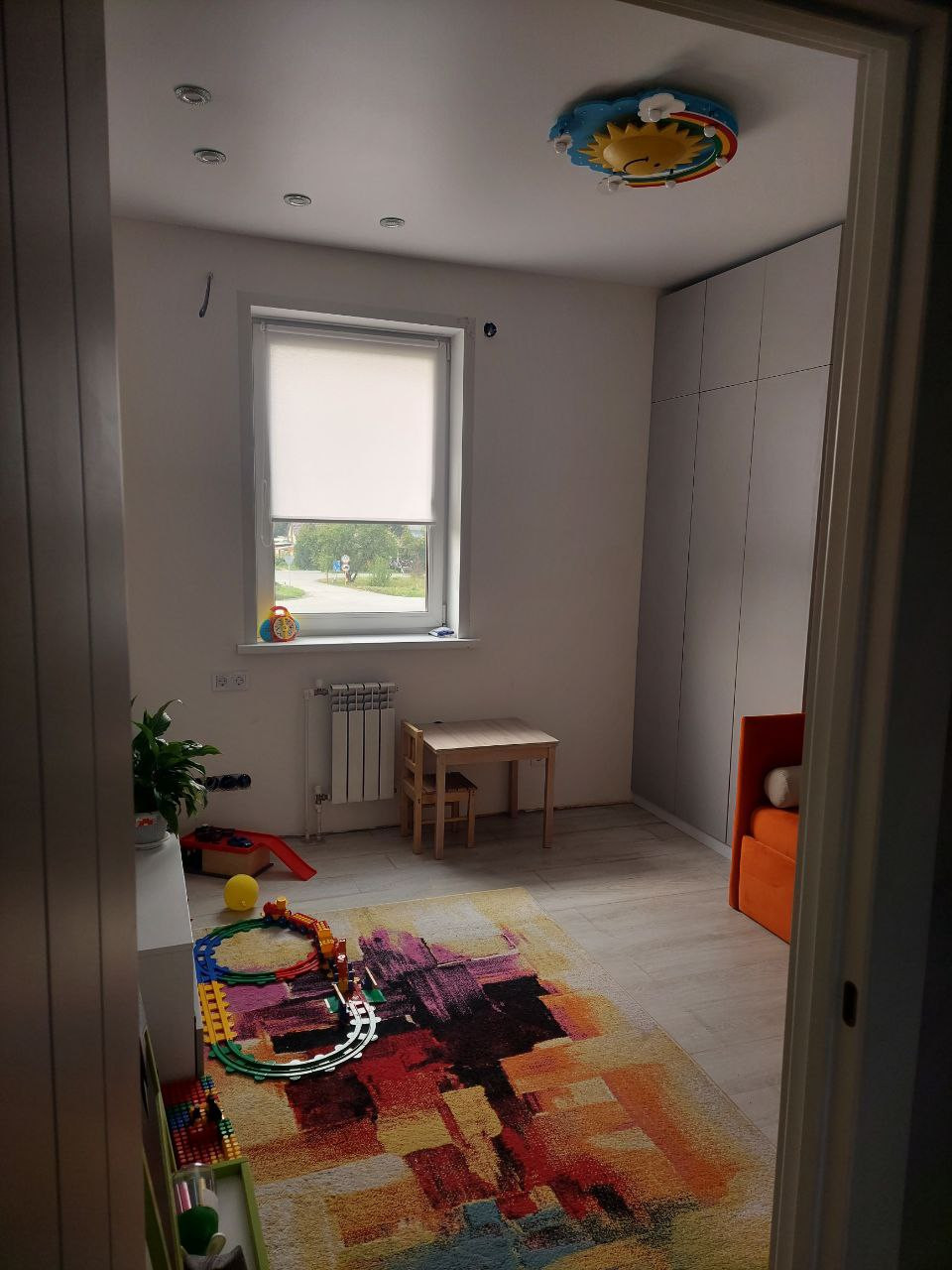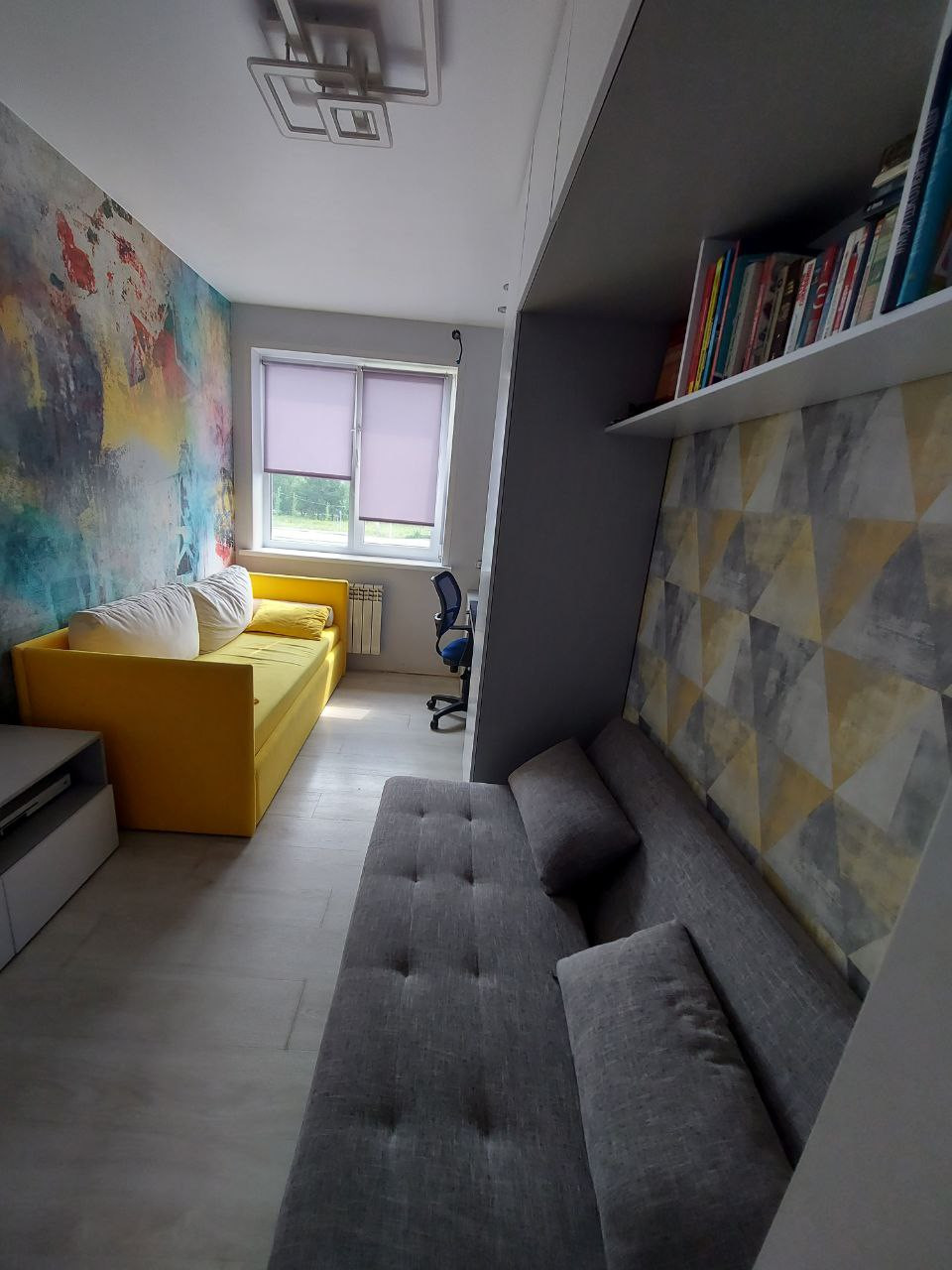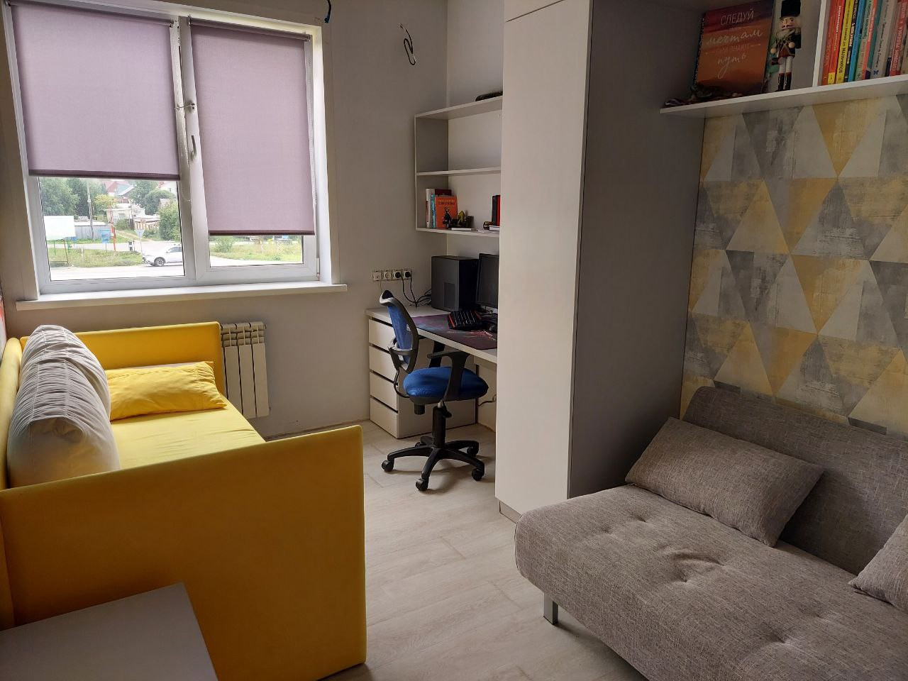 Первый этаж 51,5 м2: Прихожая 5м2, Кабинет 10м2, Гостиная 25,6 м2 (остается всё), С/У 2,8 м2. Второй этаж 51,5 м2: Детская N°1 10,5м2 (остается всё, кроме серого дивана), Детская N°2 11,1 м2 (остается всё), Спальня с гардеробом 13м2 (остаётся всё, кроме телевизора), С/У 4,6м2.