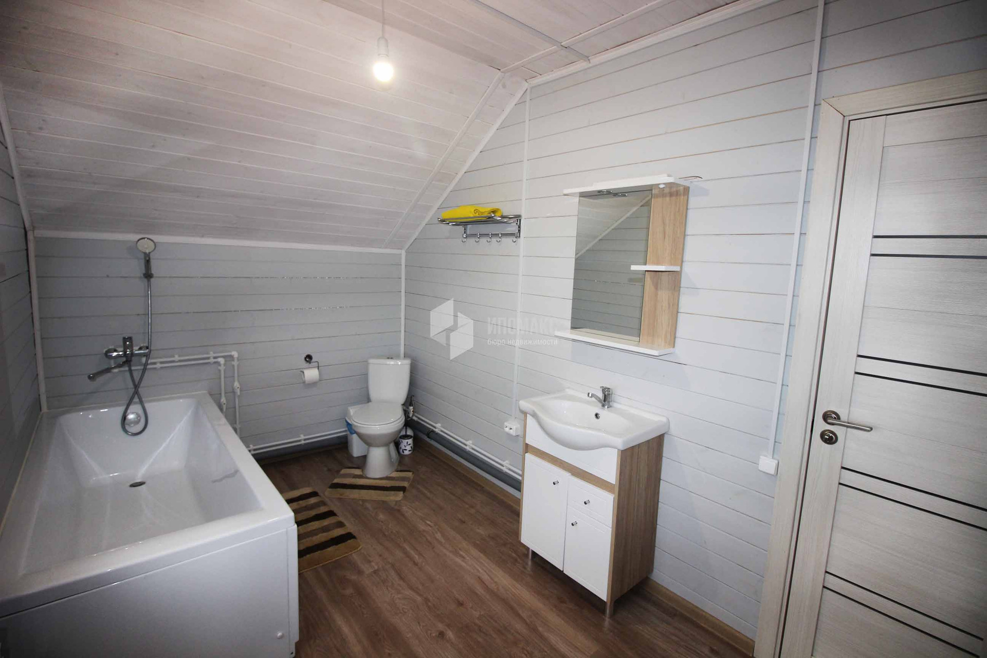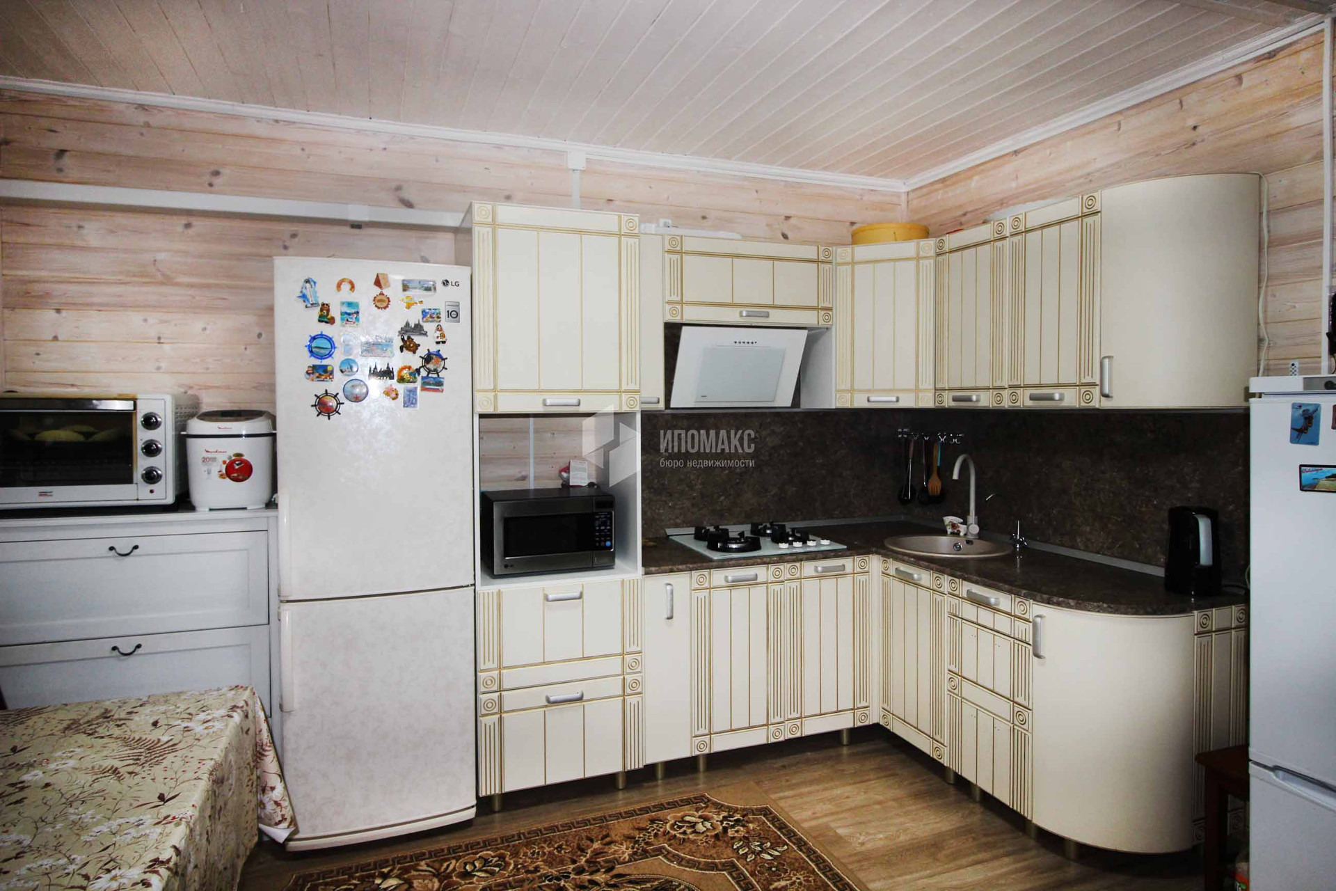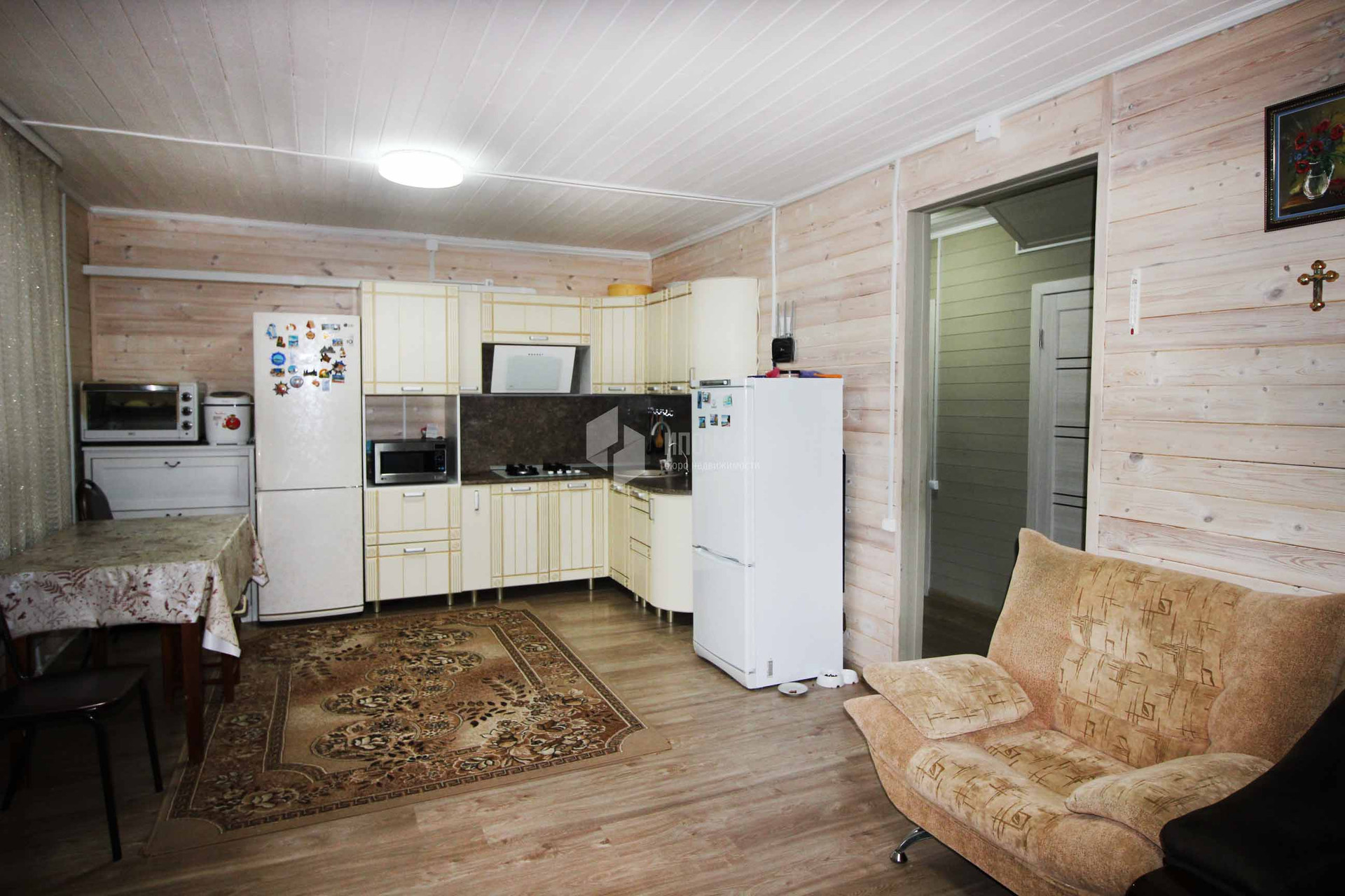 На первом этаже просторная, светлая кухня-гостиная с выходом на летнюю веранду. Спальня ,санузел и кладовка.