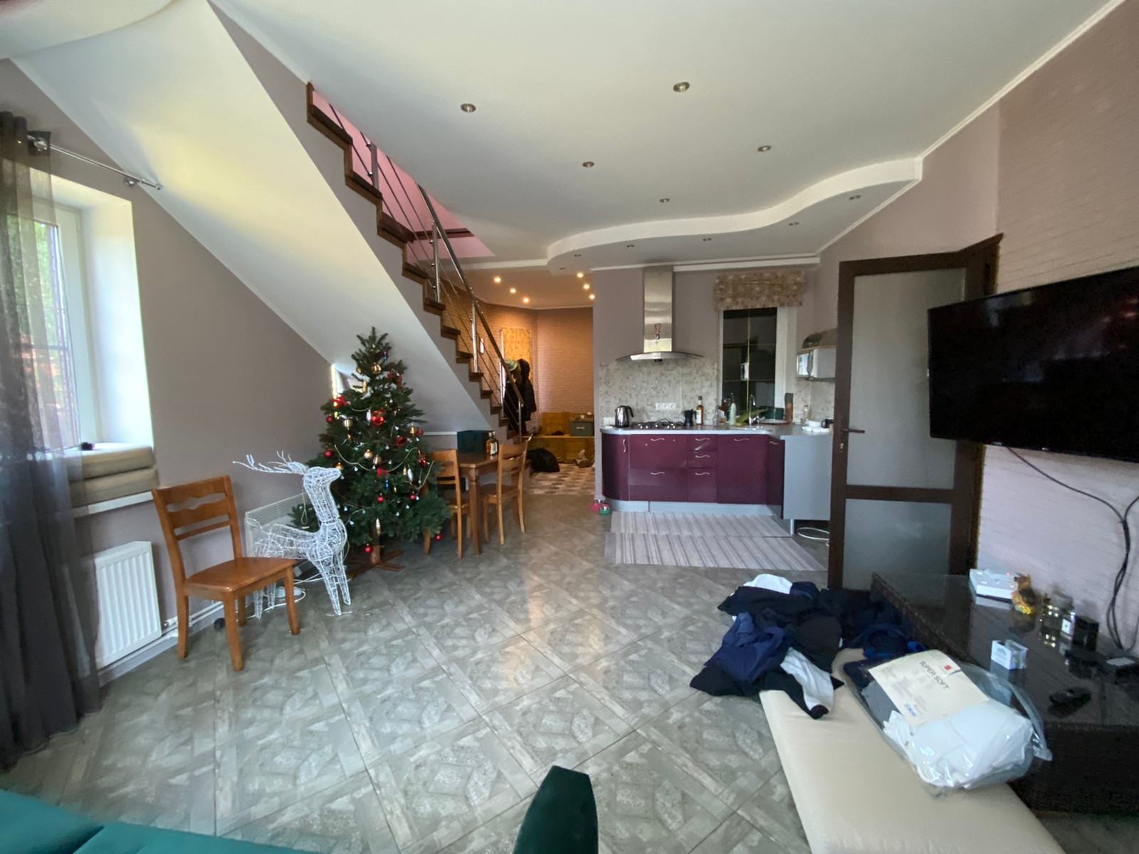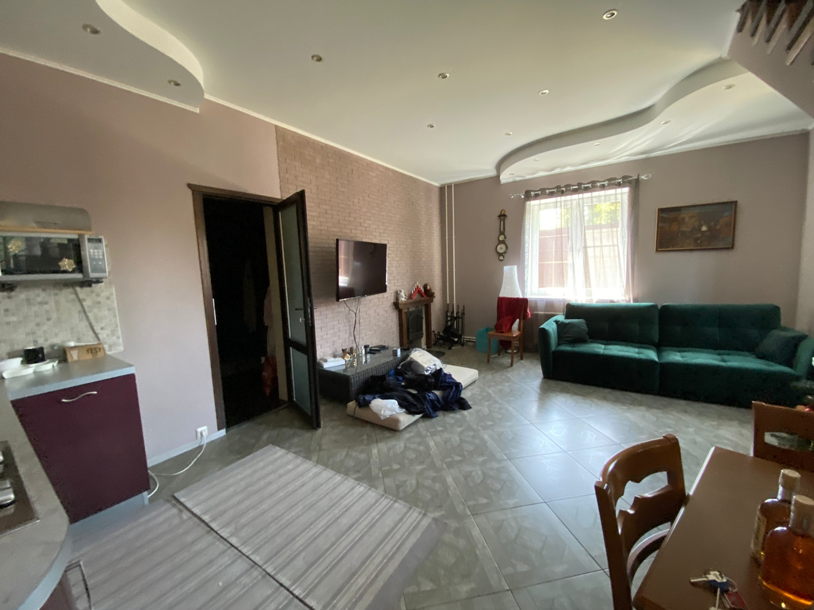 1-этаж: терраса (пол из лиственницы, мягкие окна), прихожая, просторная кухня-гостиная (теплый пол, итальянская плитка), сан. узел, душевая, дровяная баня (изготовлена по дизайнерскому проекту из дорогих качественных материалов);