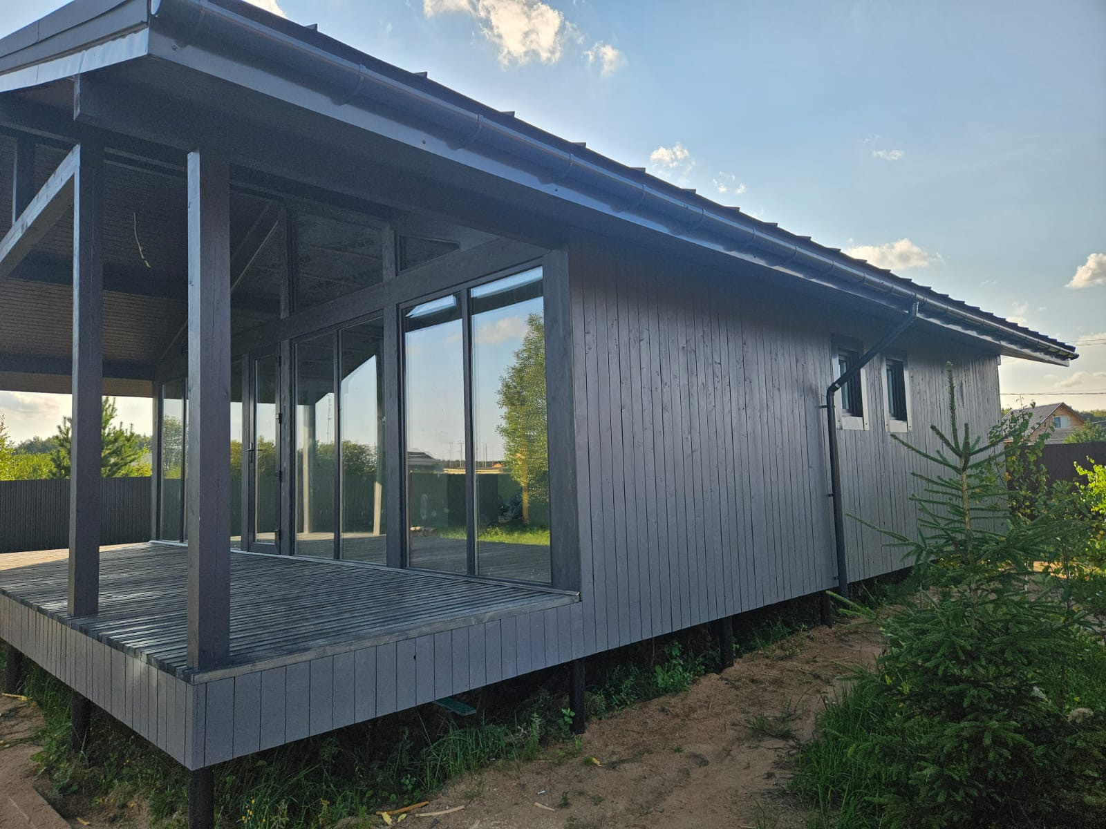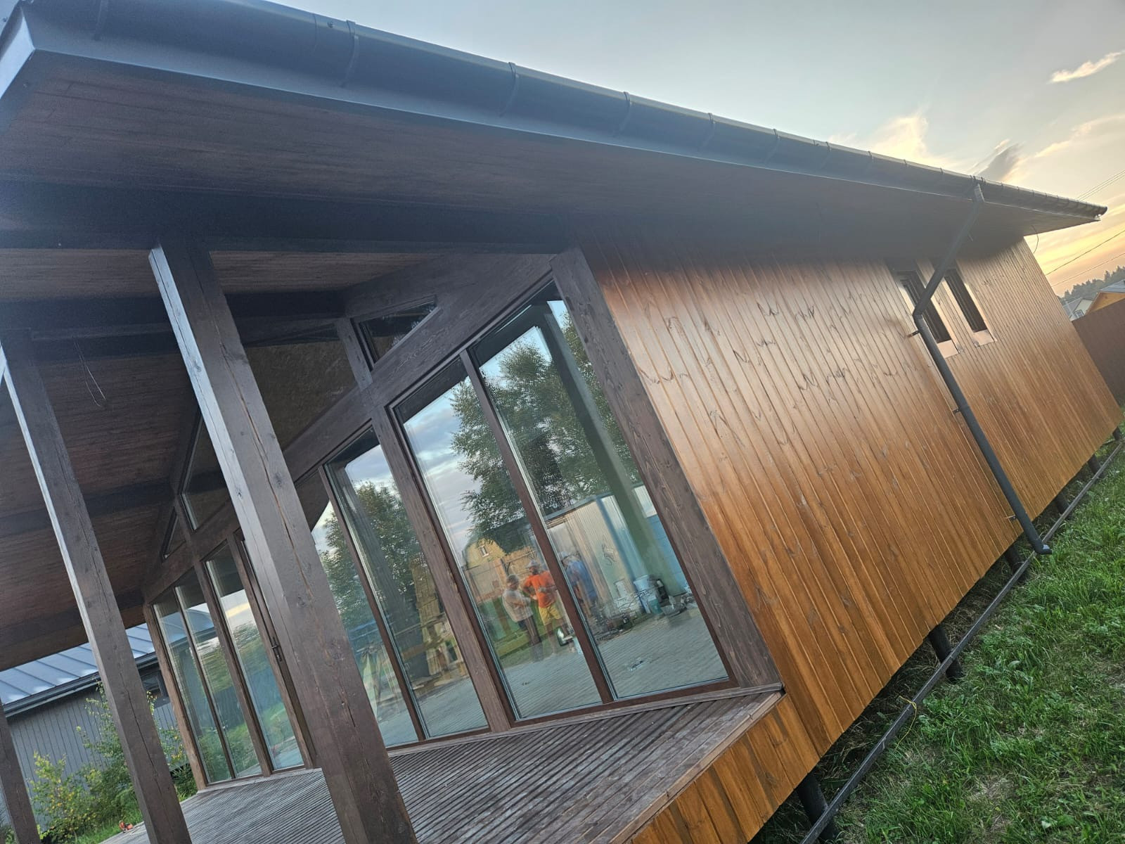 Надежная кровля: Используется премиум материал – клик-фальц GrandLine в сером матовом цвете (RALL 7024), обеспечивающий долговечность и стильный внешний вид.