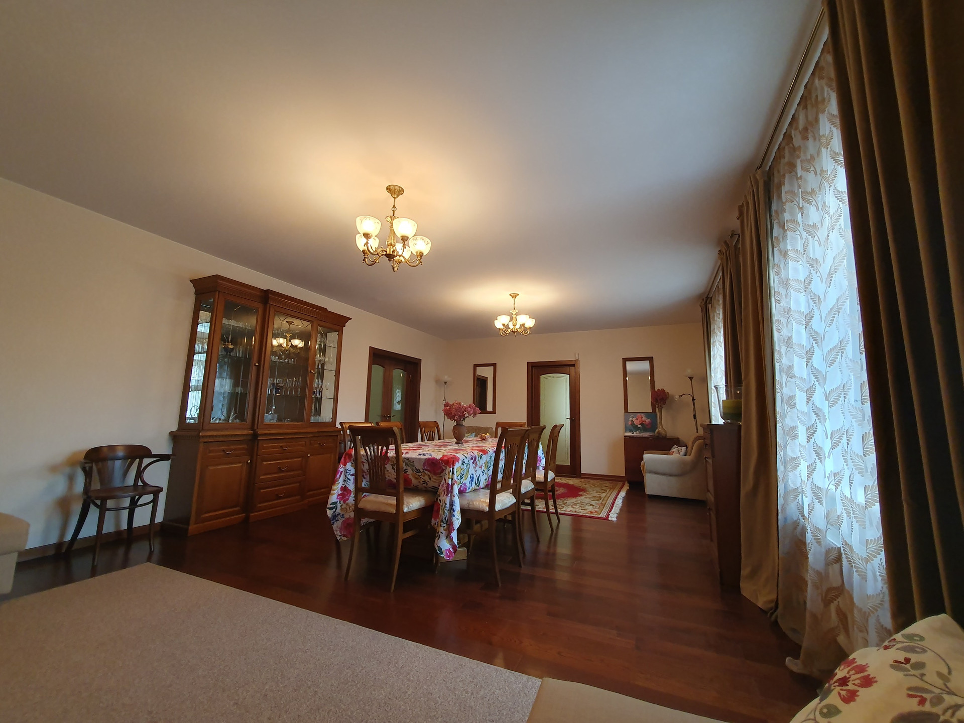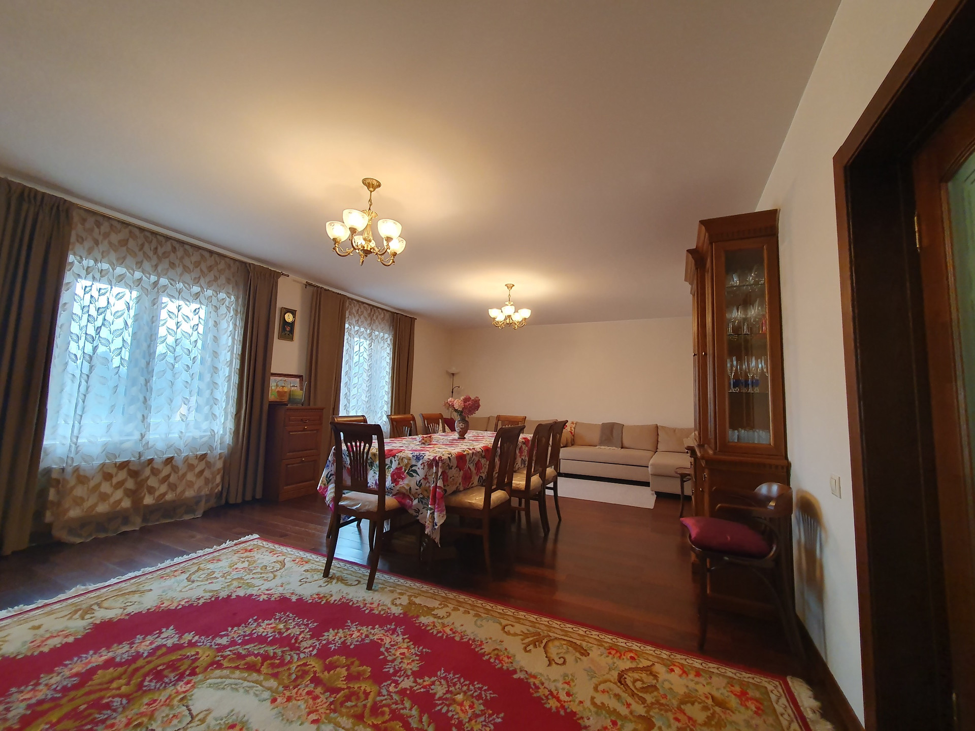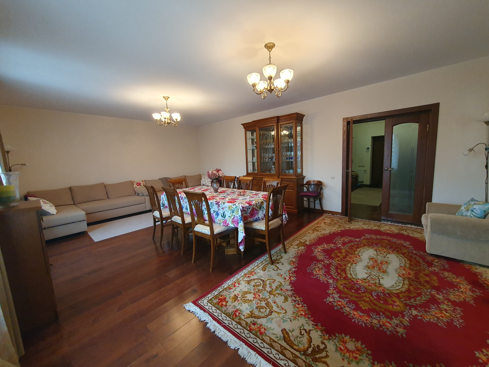 1й этаж: холл 16 кв.м., гостиная-столовая 36 кв.м., кухня 16 кв.м.(со встроенной кухонной мебелью их массива дерева), комната с эркером 20.2 кв.м., просторный сан. узел более 10 кв.м., финская сауна с комнатой отдыха. Пол – массив дуба, в с\у, холле и кухне плитка пр-во Италия, Испания и теплый пол с водяным нагревом.