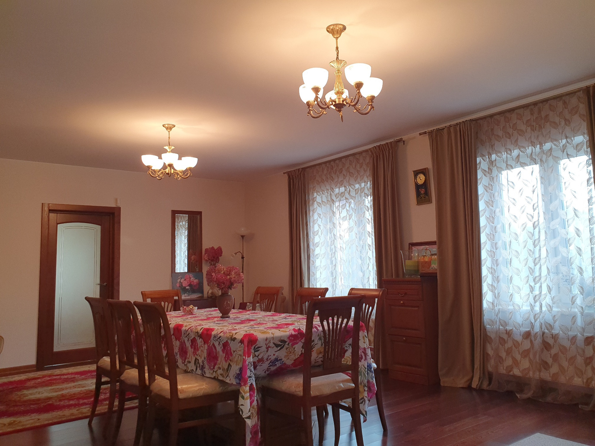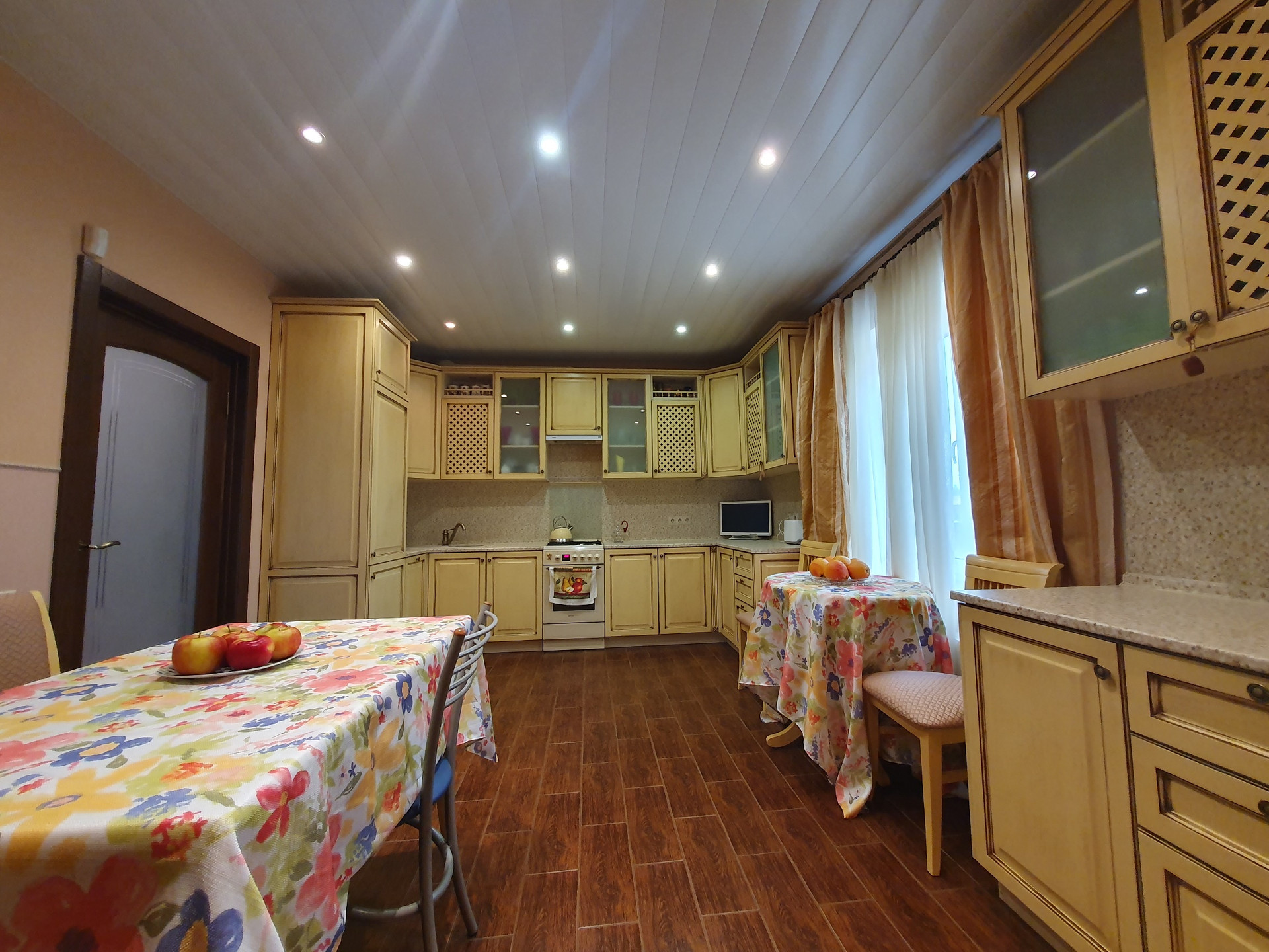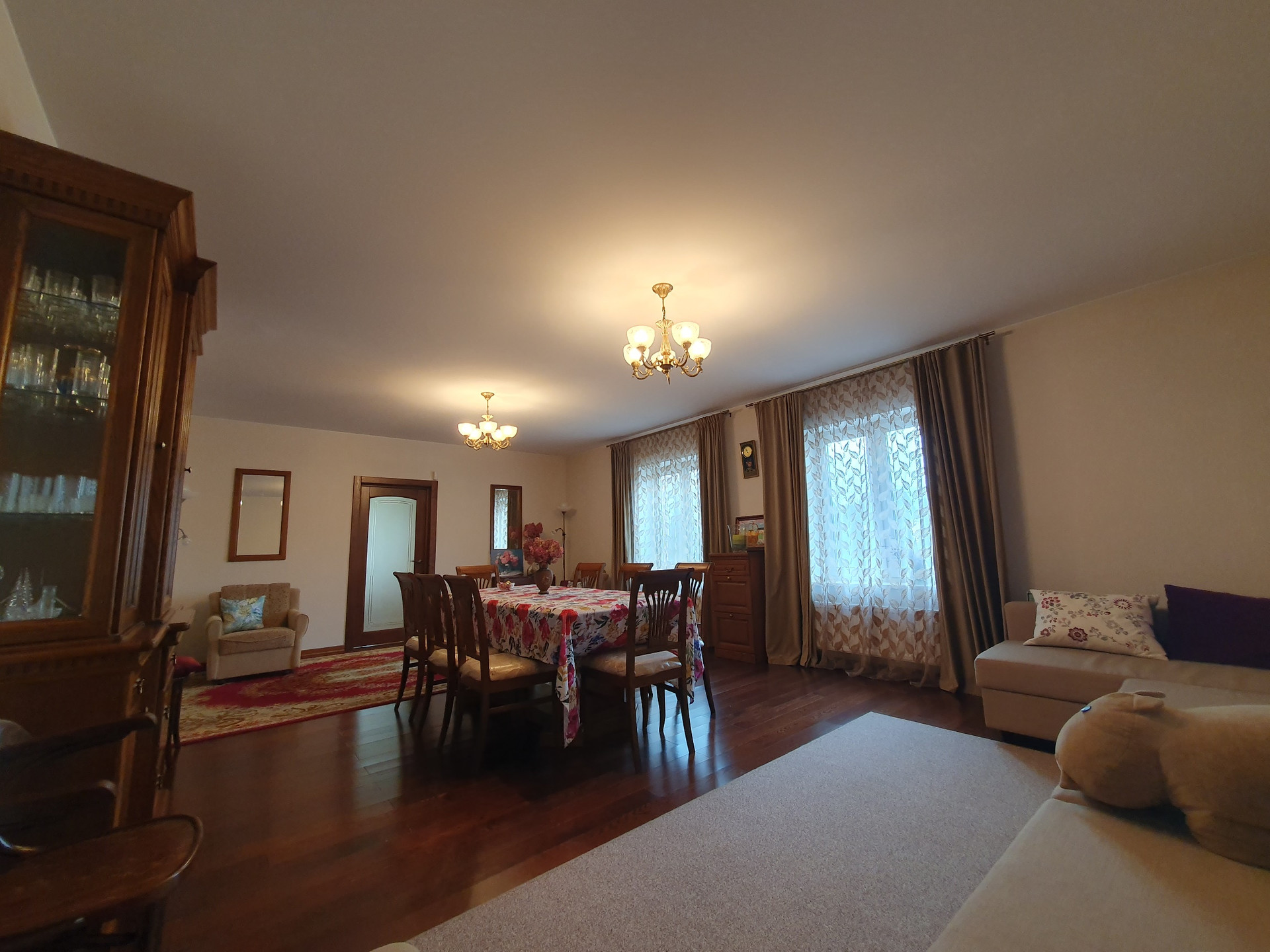 1й этаж: холл 16 кв.м., гостиная-столовая 36 кв.м., кухня 16 кв.м.(со встроенной кухонной мебелью их массива дерева), комната с эркером 20.2 кв.м., просторный сан. узел более 10 кв.м., финская сауна с комнатой отдыха. Пол – массив дуба, в с\у, холле и кухне плитка пр-во Италия, Испания и теплый пол с водяным нагревом.