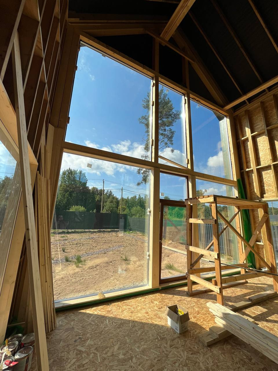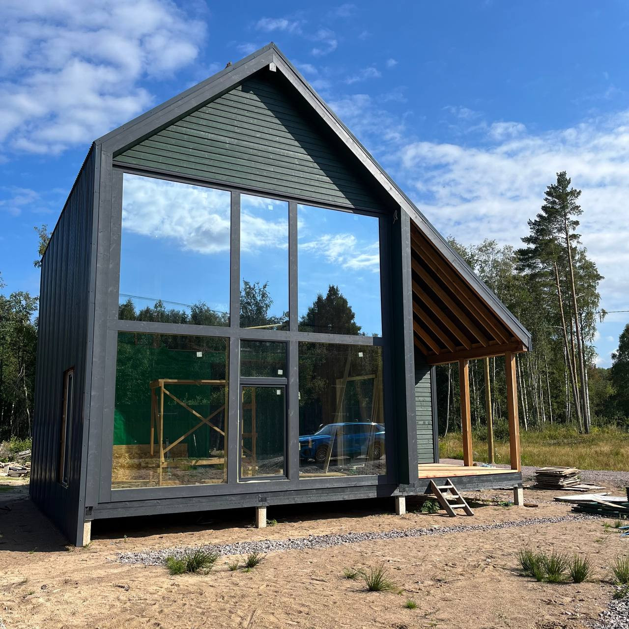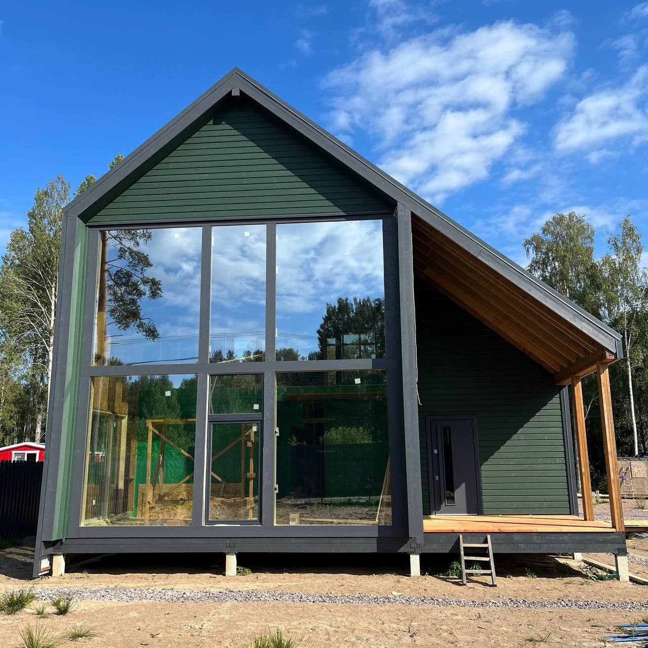 Дом находится рядом с лесом и рекой. Сейчас еще ведутся завершающие строительные работы, но вы уже можете осмотреть готовое изделие.