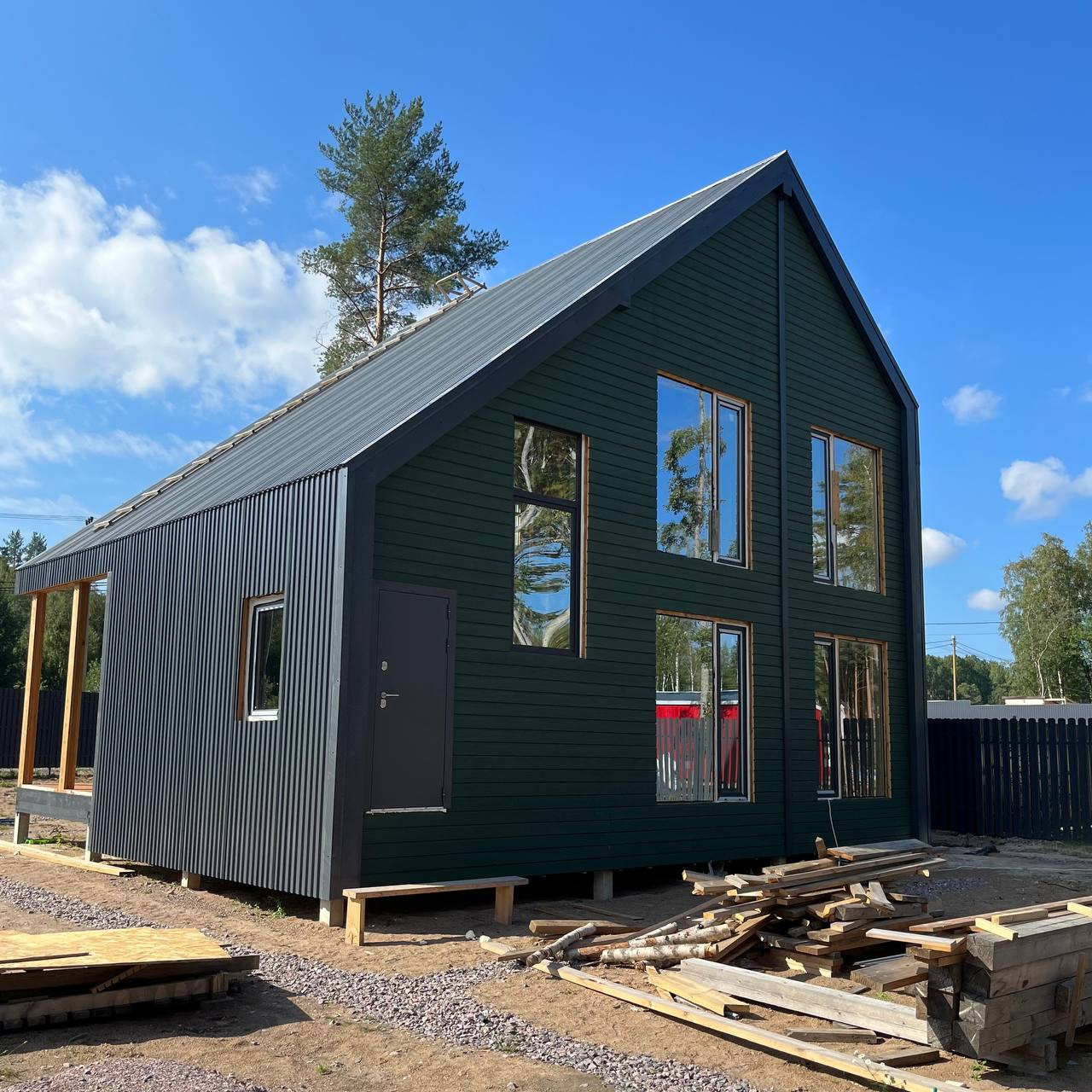 Металлический штакетник с двусторонней зашивкой, цвет серый антрацит RAL 7024, такой же, как у кровли - в едином стиле. Вдоль дороги - 2,5м высотой. Боковой - 2,0м высотой. Вдоль забора в ближайшее будут высажены туи/сосны/ели.