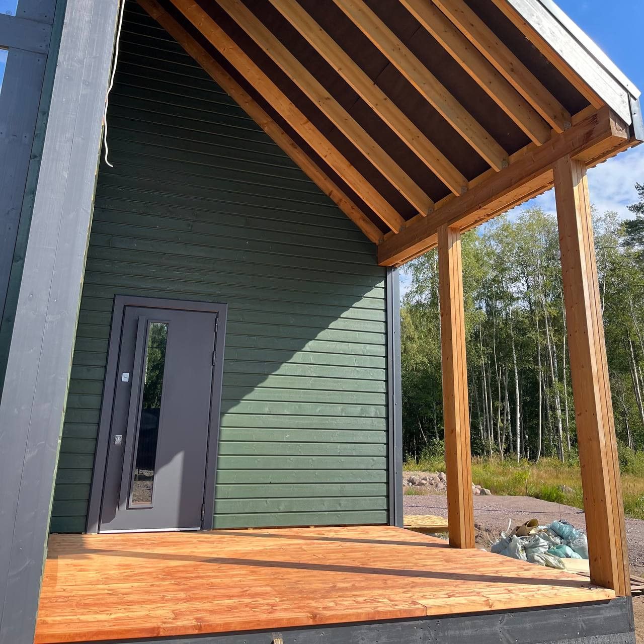 Большая крытая терраса размером 3,5х3,5м, где можно поставить стол и обедать на свежем воздухе. Есть возможность для установки открытой террасы перед домом (мы можем сделать это дополнительно, если вы захотите).