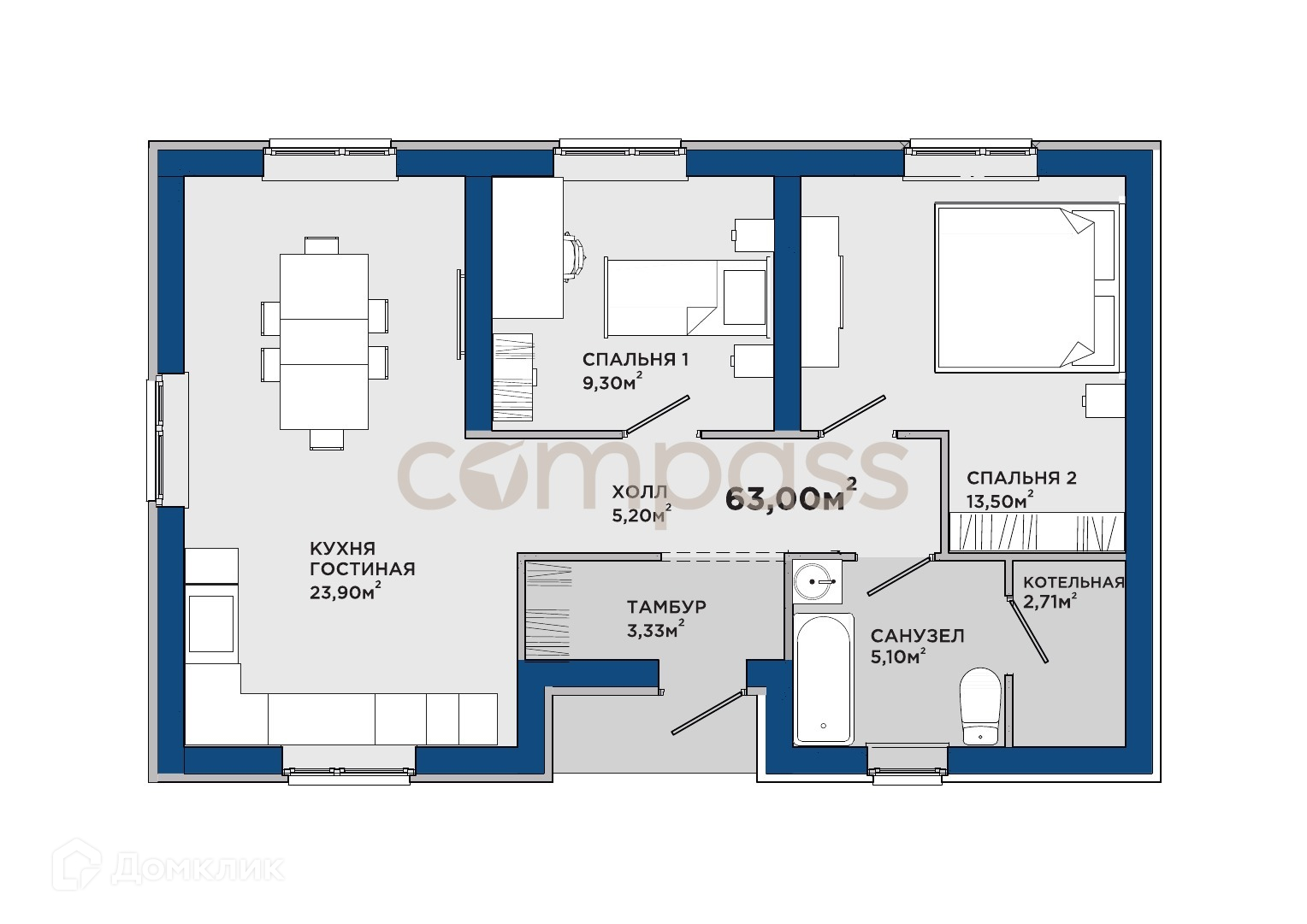 Две уютные и изолированные комнаты, просторная кухня-гостинная (23,90 кв.м.), один санузел, холл, тамбур и котельная. Технические характеристики: