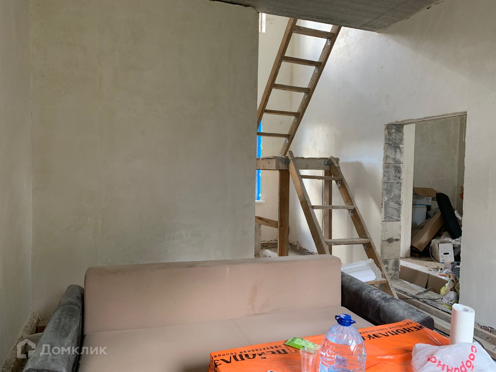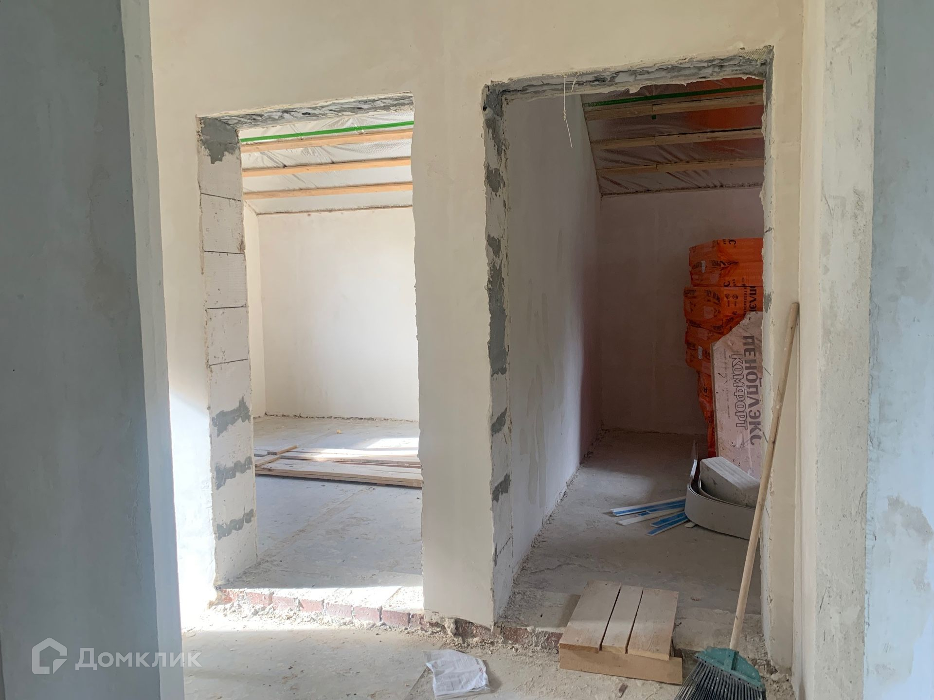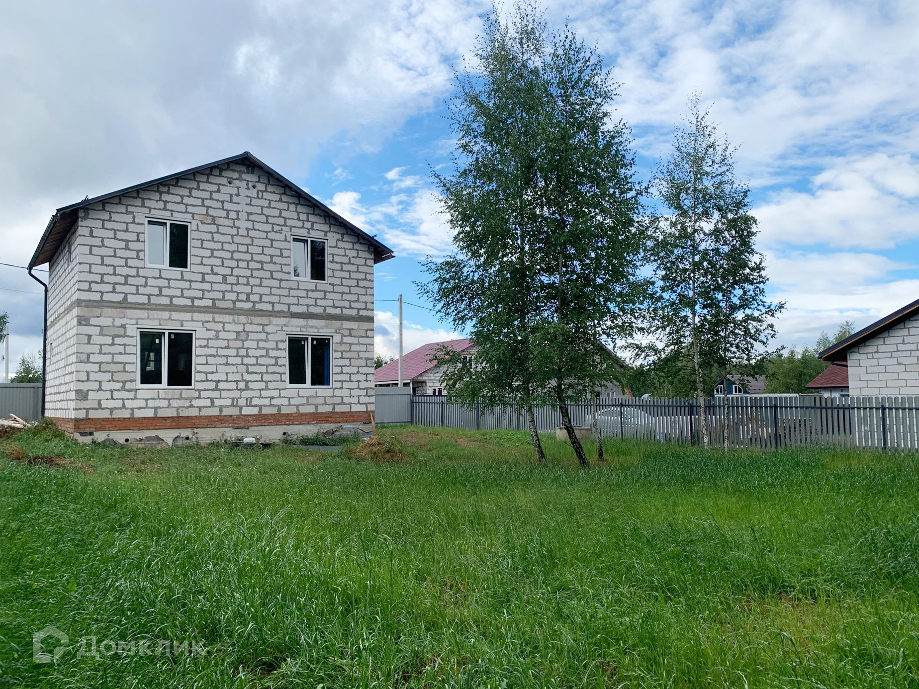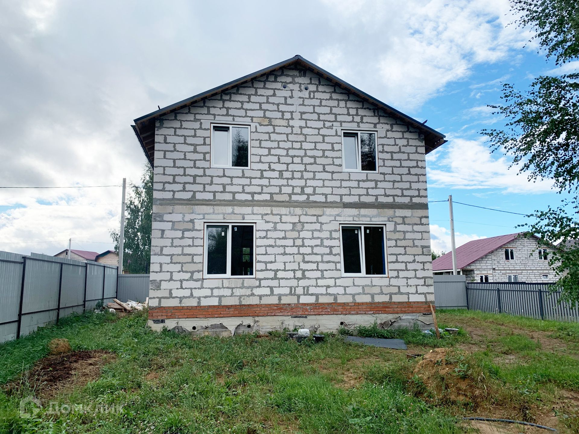 Дом из газобетонного блока на свайно-ростверковом фундаменте, крыша металлочерепица, утеплена. Высота потолков 3,4 м в черновом варианте.