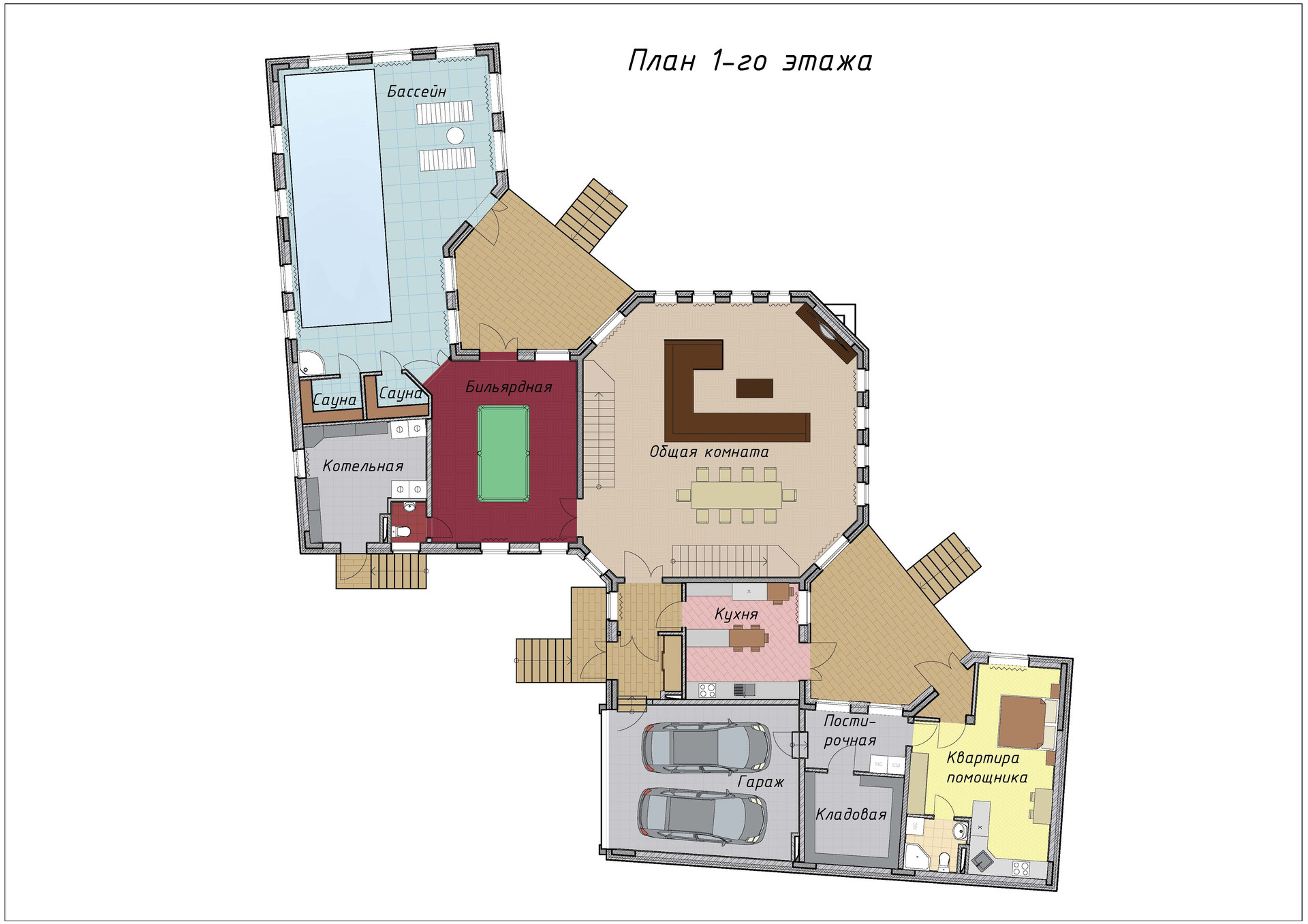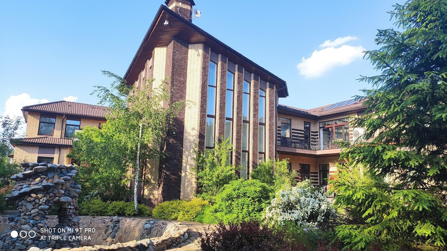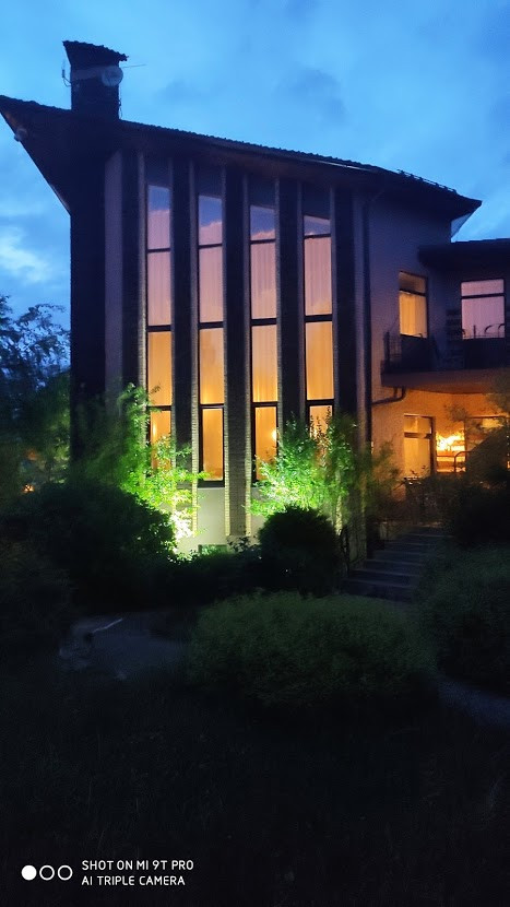 Основной дом 790кв.м. 2016 года постройки: построен на монолитном свайном фундаменте, пилоны, перекрытия, лестницы монолит. Заполнение стен трехслойное: внутри керамзитобетонный блок, утеплитель 150мм, облицовка колотым кирпичом с декорированием плитами из агломерата. Дом очень теплый. Кровля многоскатная, черепица Braas, в центральном зале открытая стропильная декоративная система из клееного бруса. Вокруг дома дренаж, система ливневой канализации.