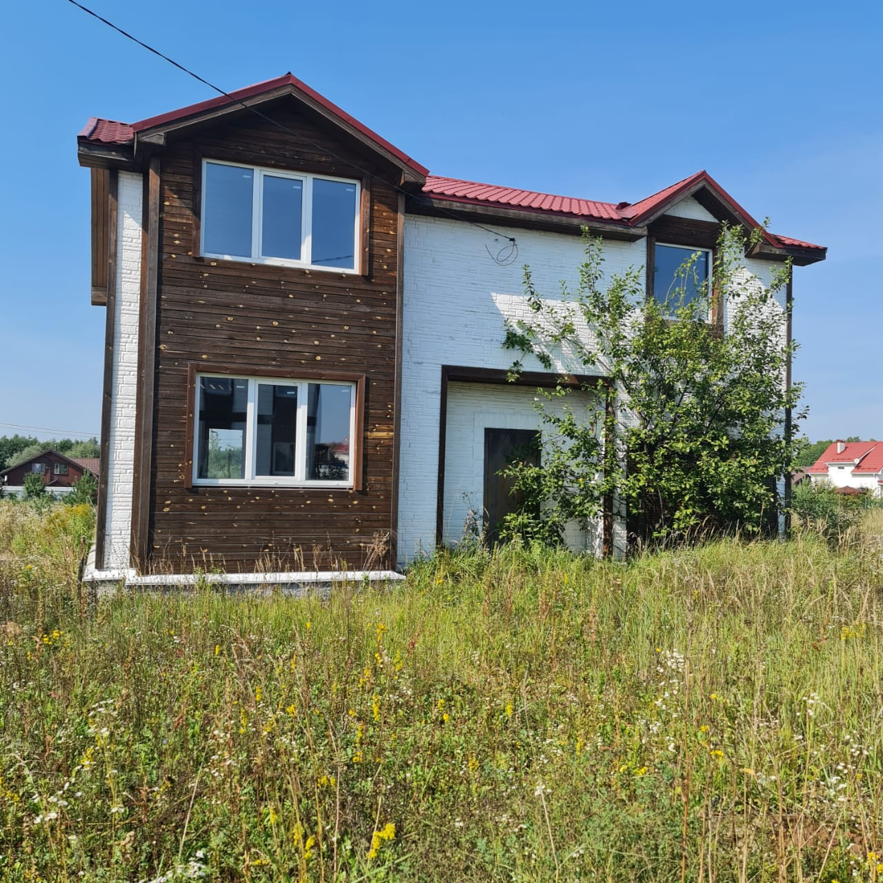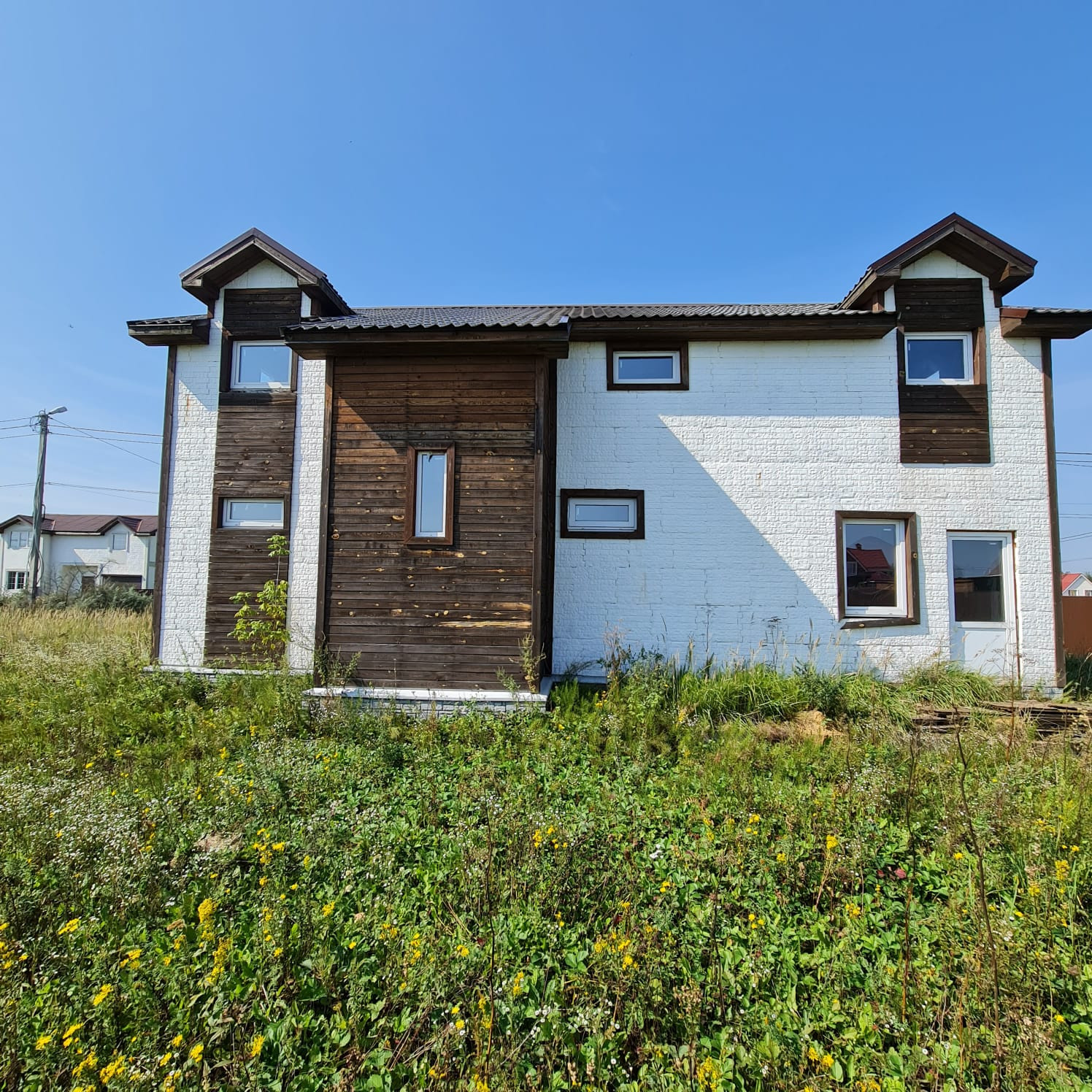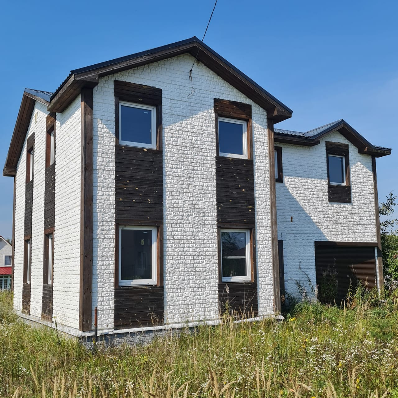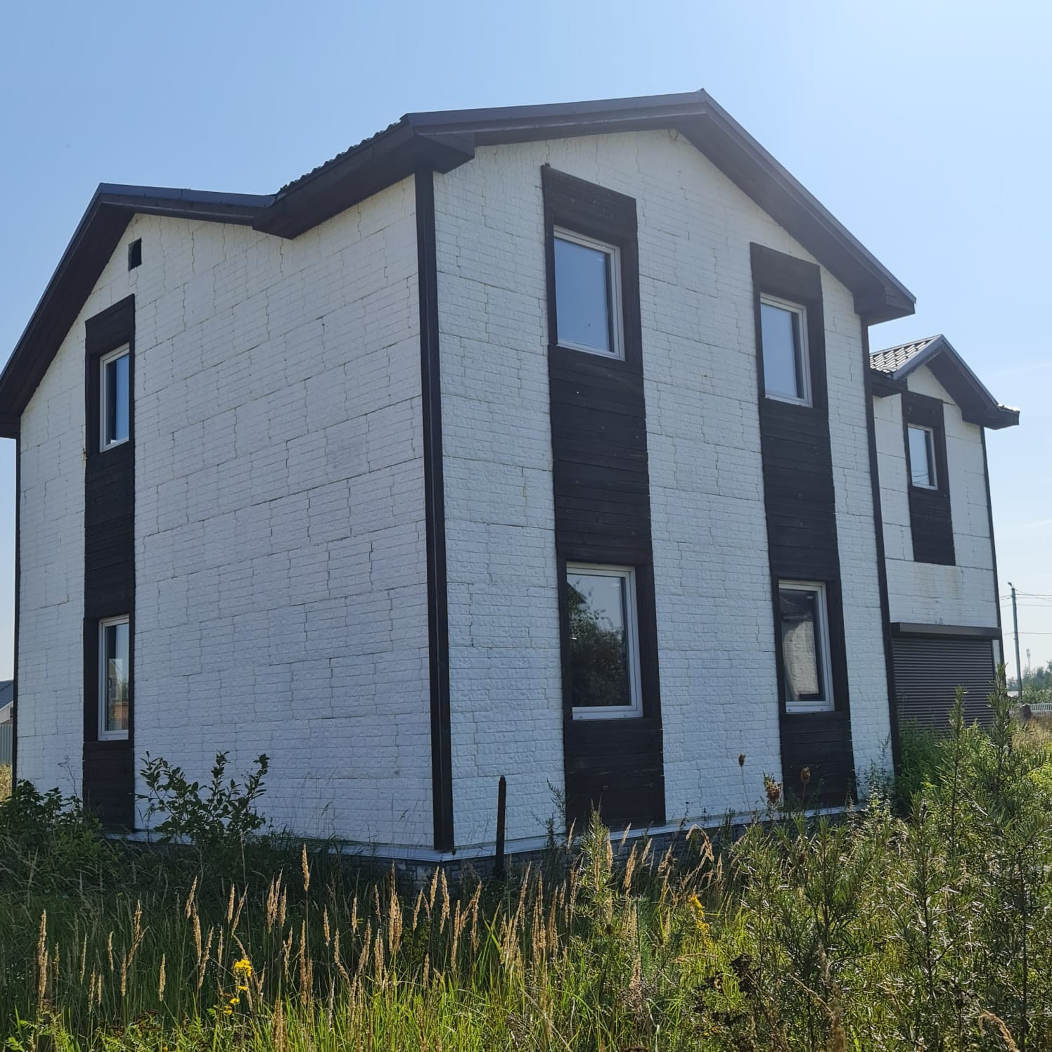 - Дом двухэтажный, каркас с дополнительным наружным утеплением + имитация кирпича (бетон), металлочерепица кровля, фундамент – лента. Готовый под отделку, свободная планировка (!).