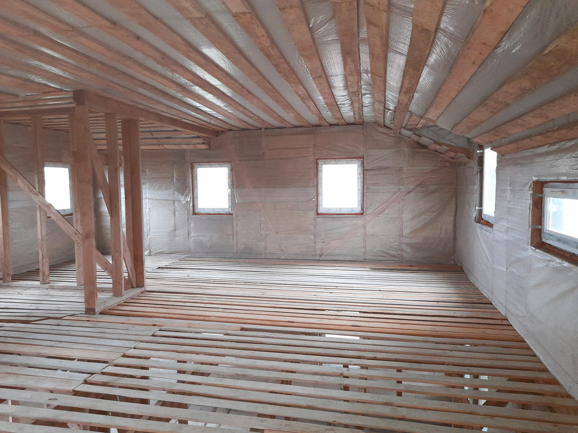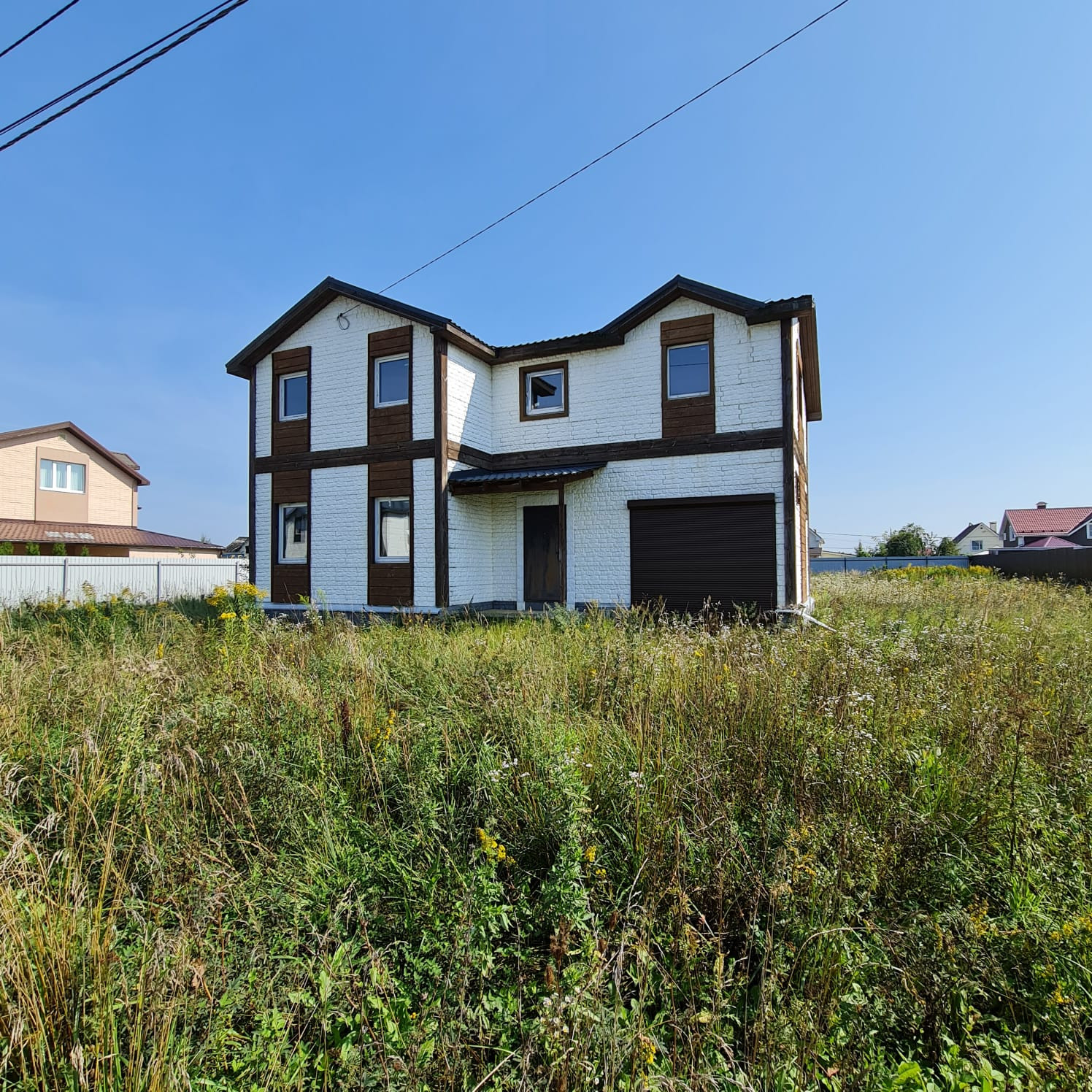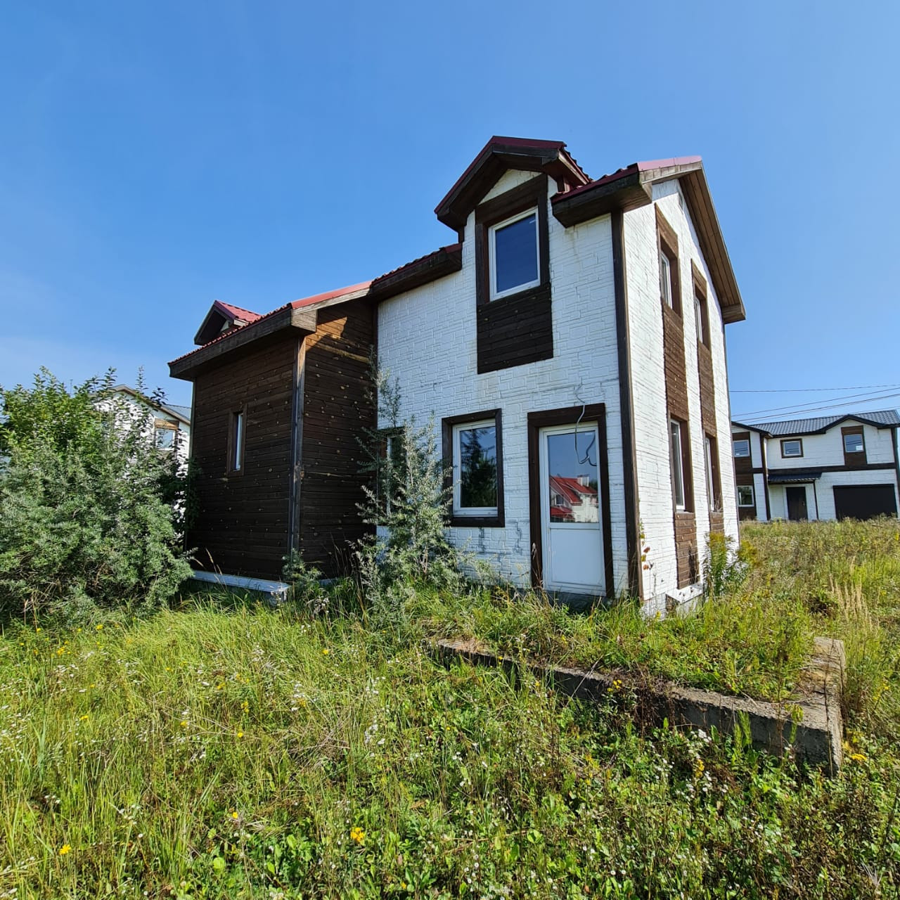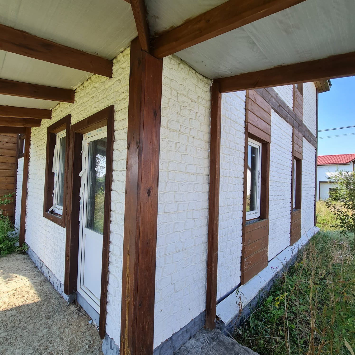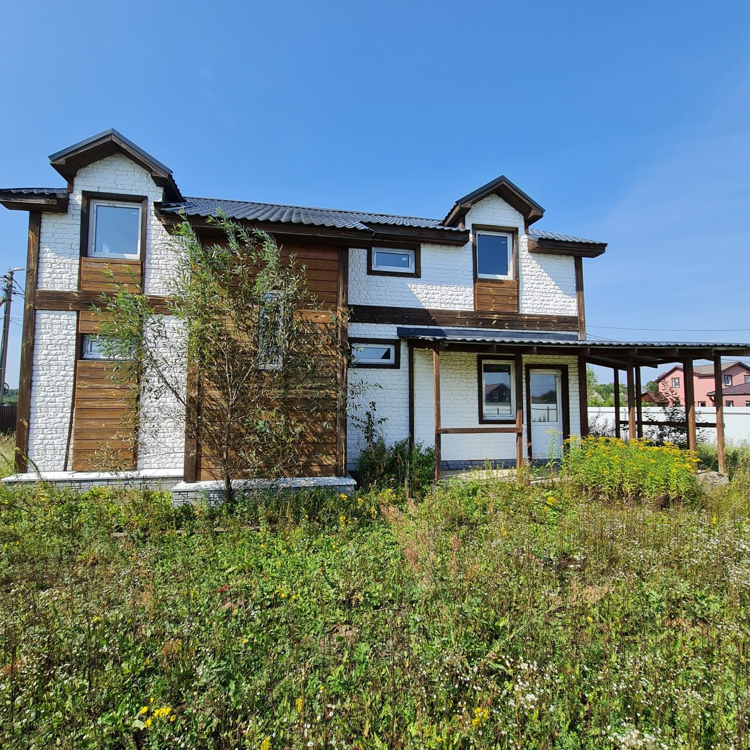 - Дом двухэтажный, каркас с дополнительным наружным утеплением + имитация кирпича (бетон), металлочерепица кровля, фундамент – лента. Готовый под отделку, свободная планировка (!).