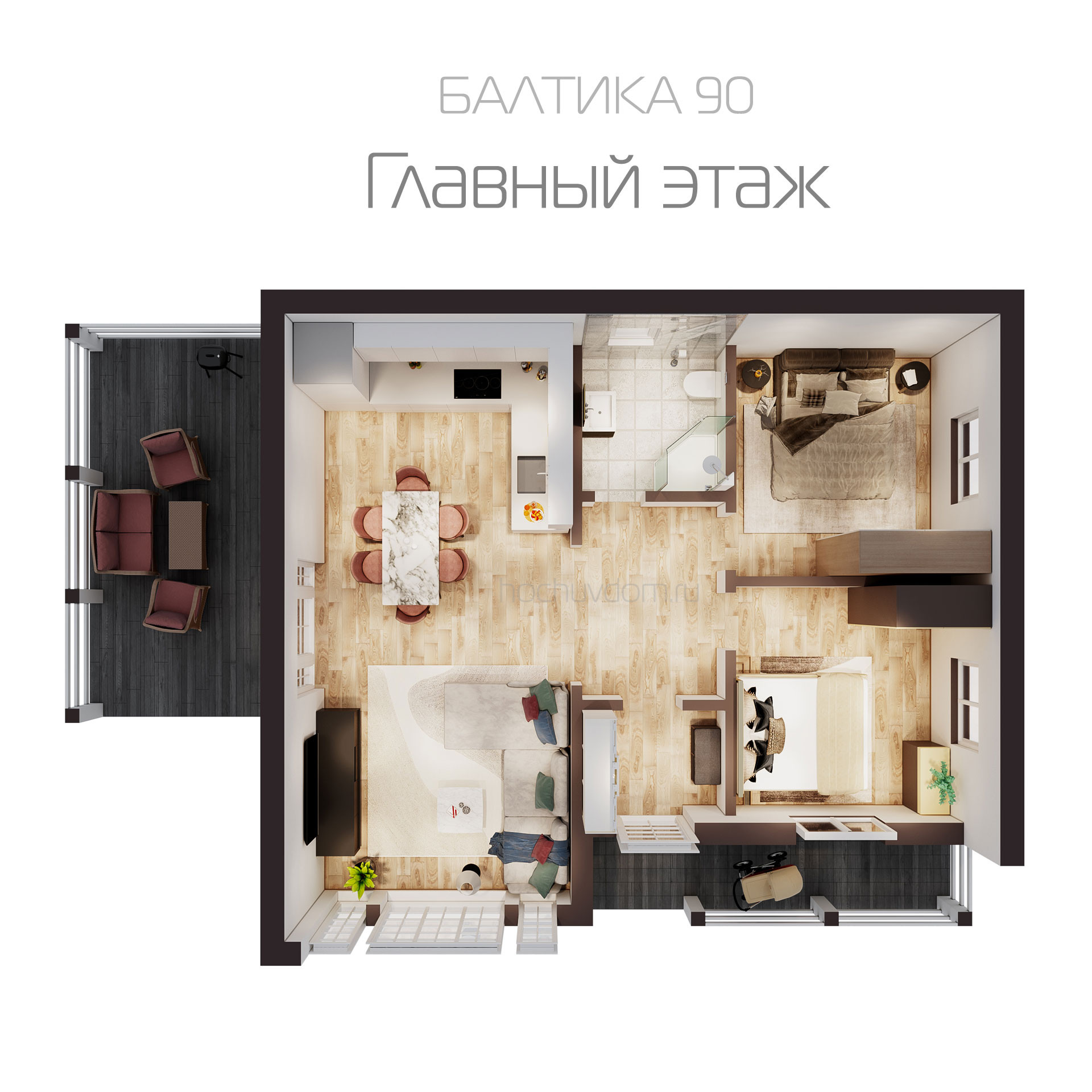 В доме 2 спальни на первом этаже, светлая кухня-гостиная с удобным выходом на просторную веранду, удобная лестница, техпомещение, большая спальня на втором этаже, санузел.