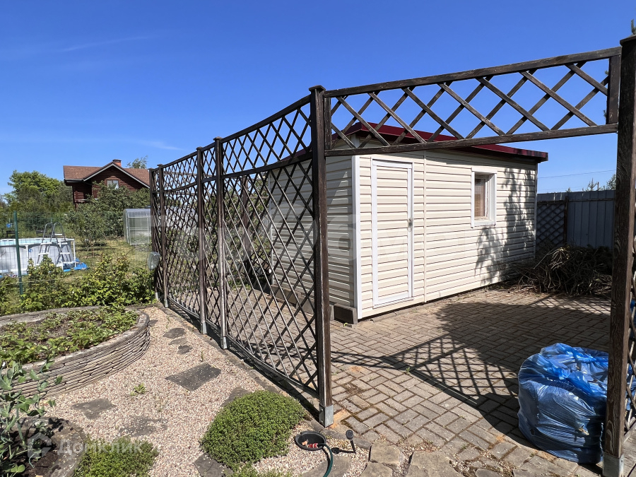 По периметру участка – сетчатый металлический забор. На участке хоз. блок. Подъездная дорога – асфальт.