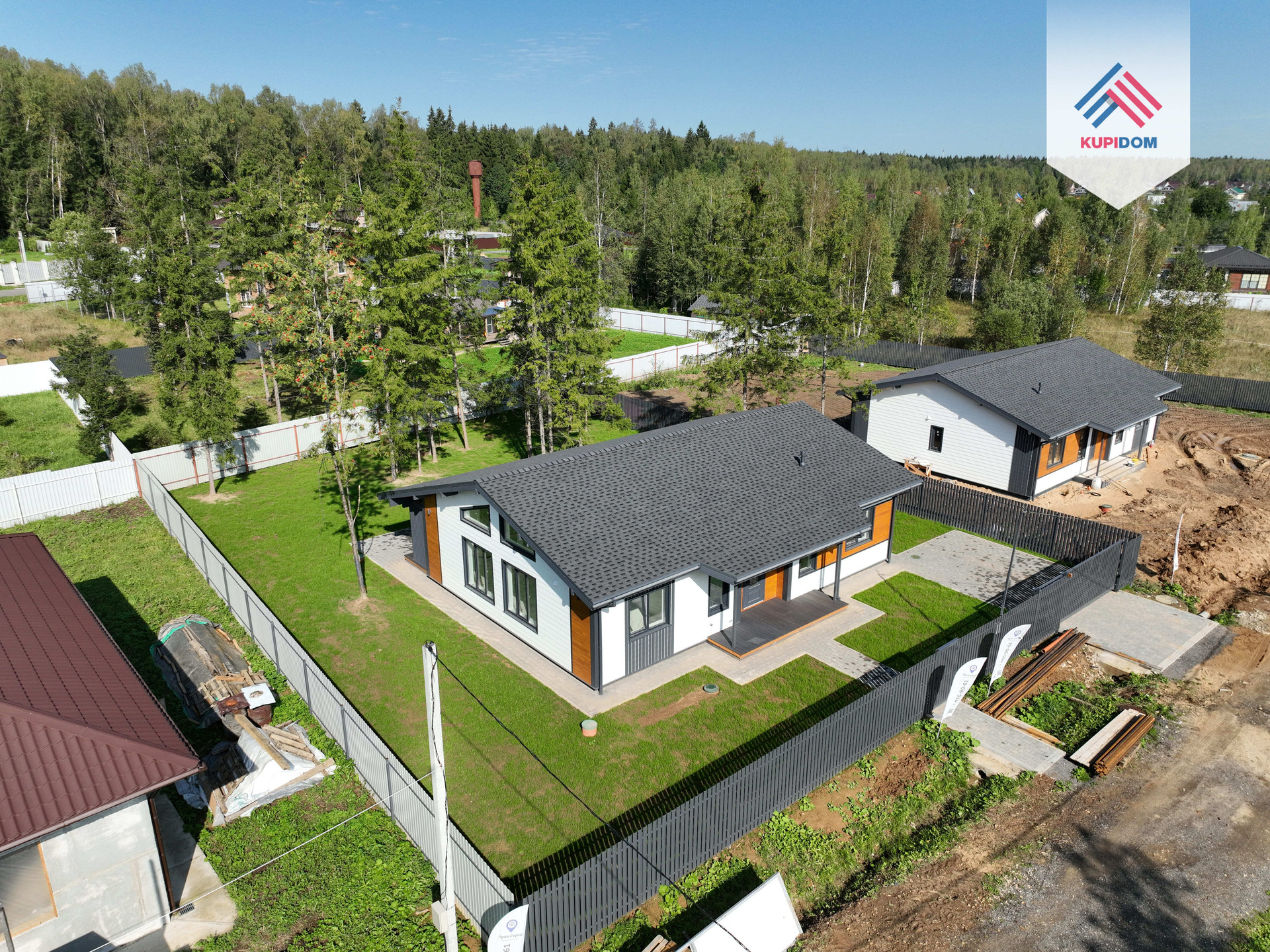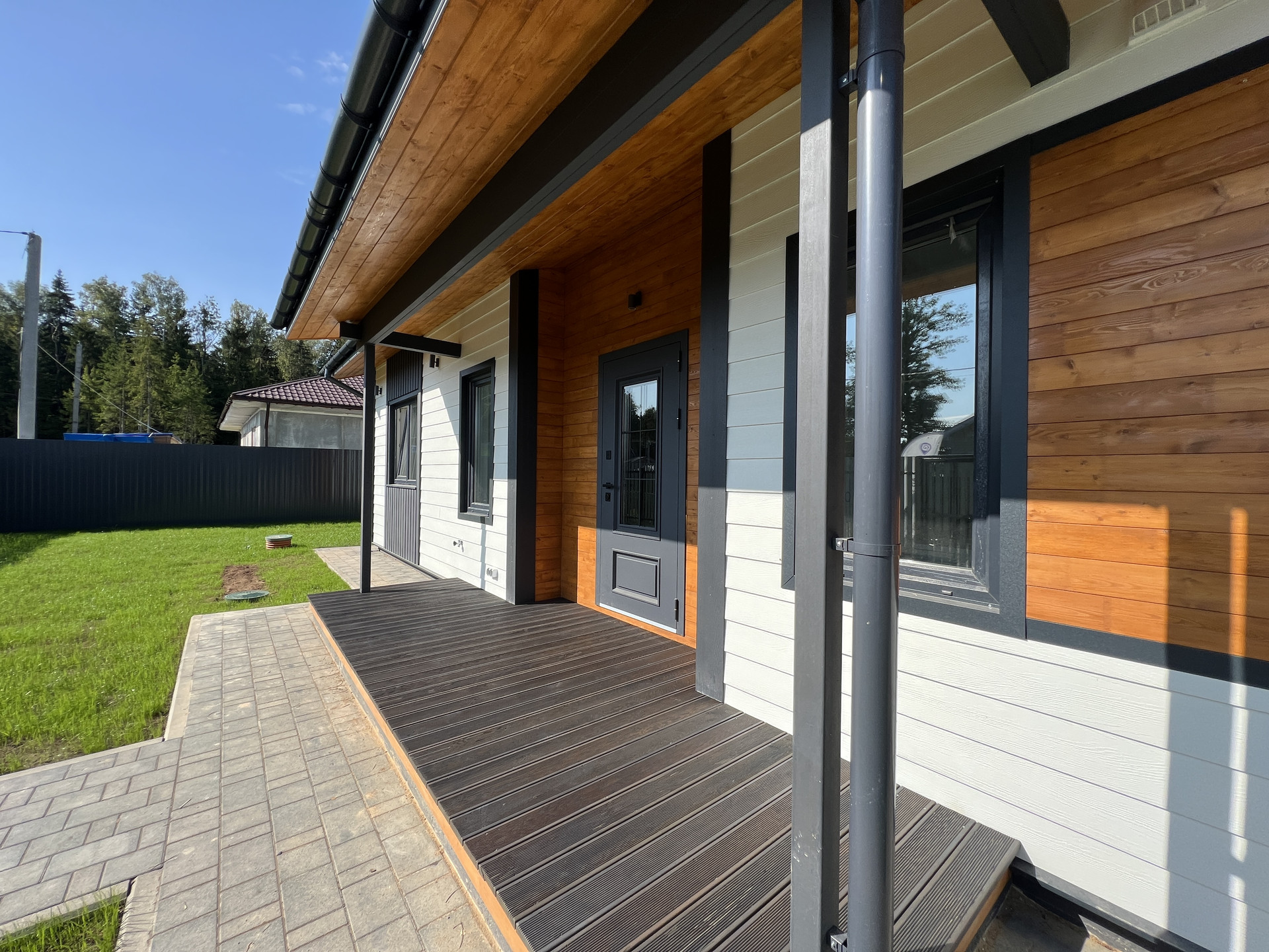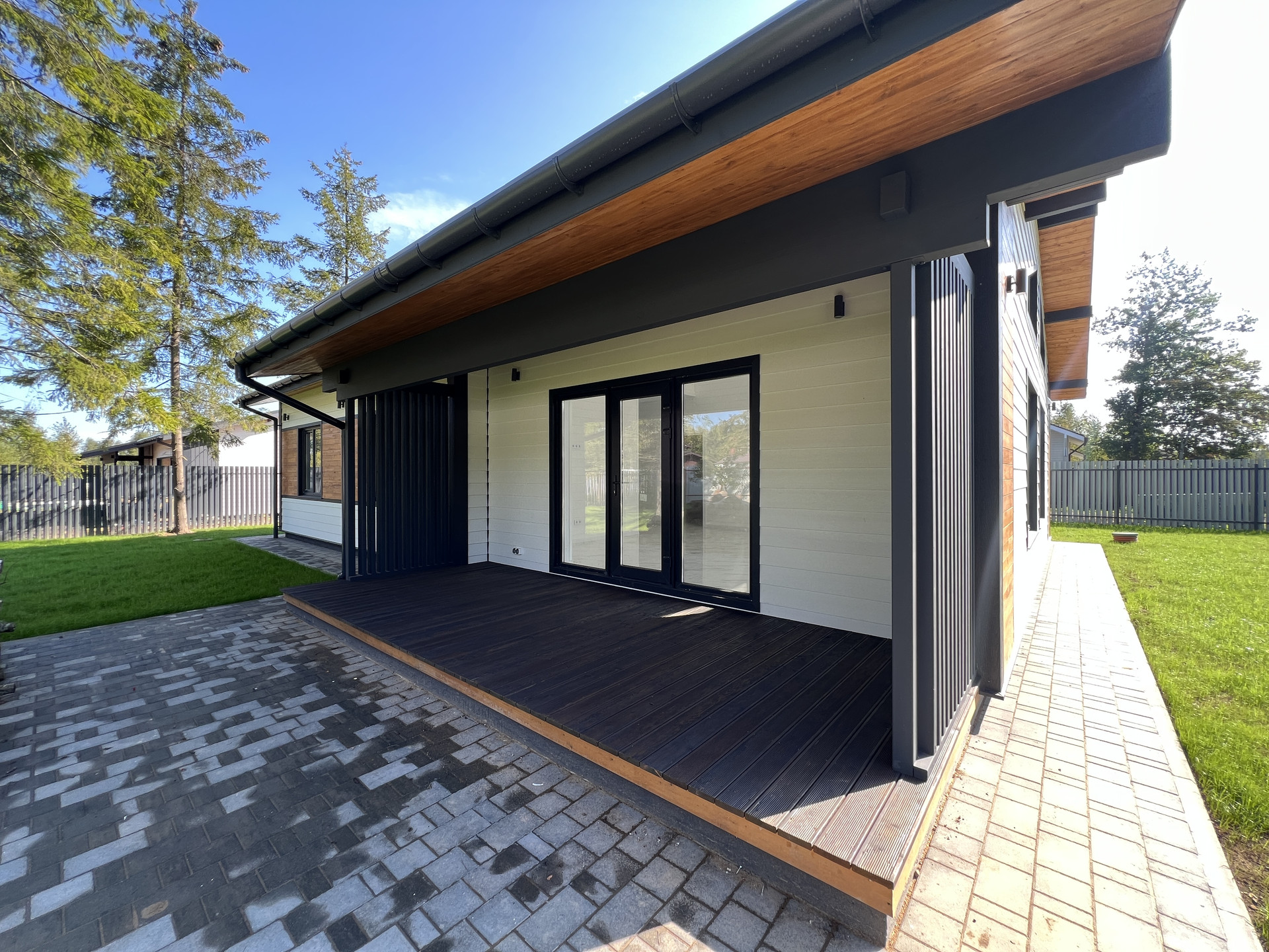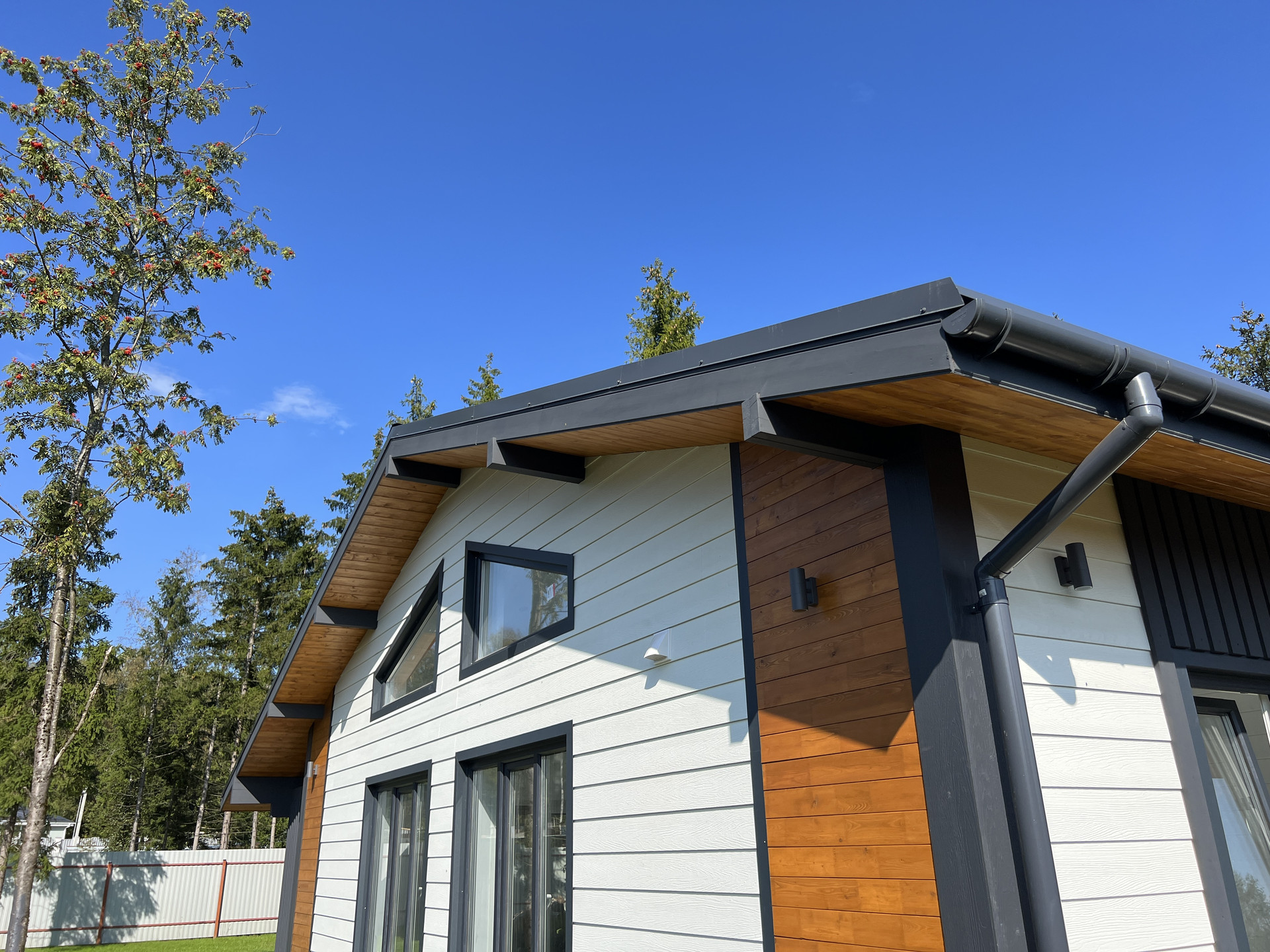 Дом каркасный, из сухого строганного дерева, построен по проекту. Фундамент - монолитная армированная плита; Крыша и фасад - вентилируемые; Вентиляция в котельной, санузлах и кухне; установлена водосточная система с отведением в ливневые колодца; Внешняя отделка дома - фиброцементный сайдинг DECOVER с декорирующими элементами из лиственницы; Декоративная подсветка дома; Утепление дома - стены - 200мм Knauf / межкомнатные - 100мм, пол - 50мм Пеноплекс, потолки - 250мм Knauf; Мембраны Grand Line; Окна - двухкамерные стеклопакеты REHAU 70 профиль с темной ламинацией; Крыша - мягкая кровля Технониколь; внутренняя отделка - полы - керамогранит / ламинат; Потолок - натяжной. На крыльце и террасе - террасная доска.
