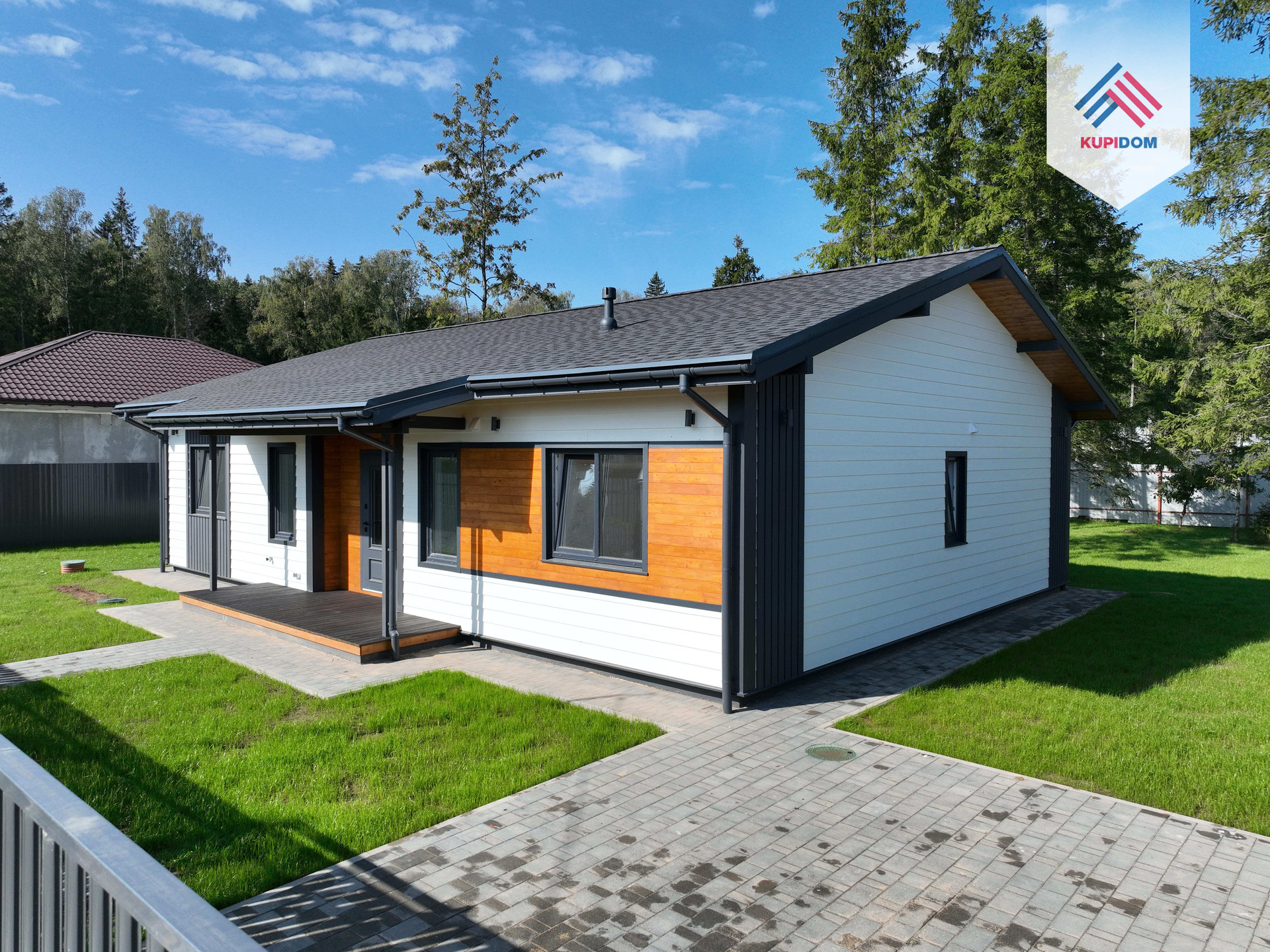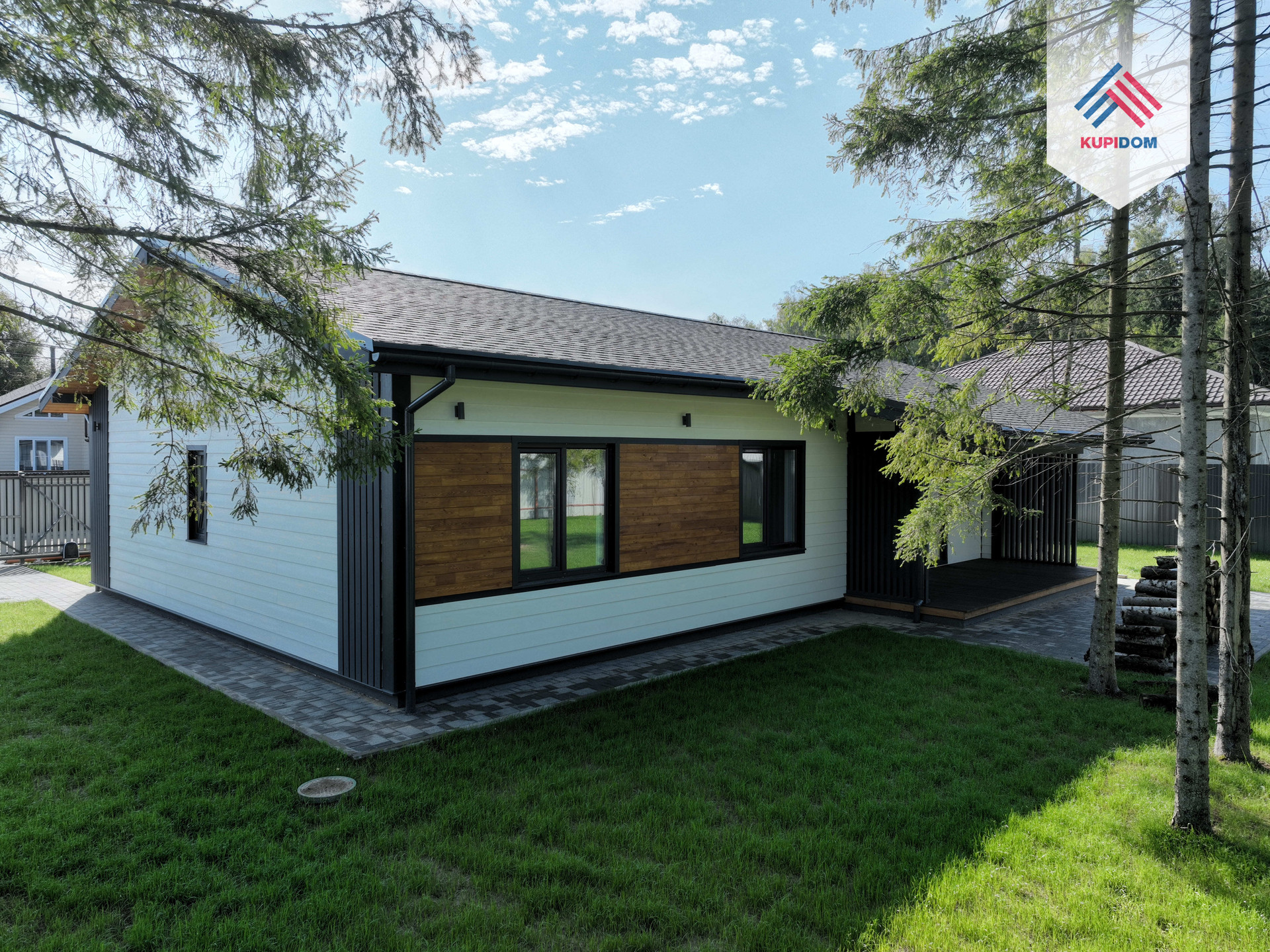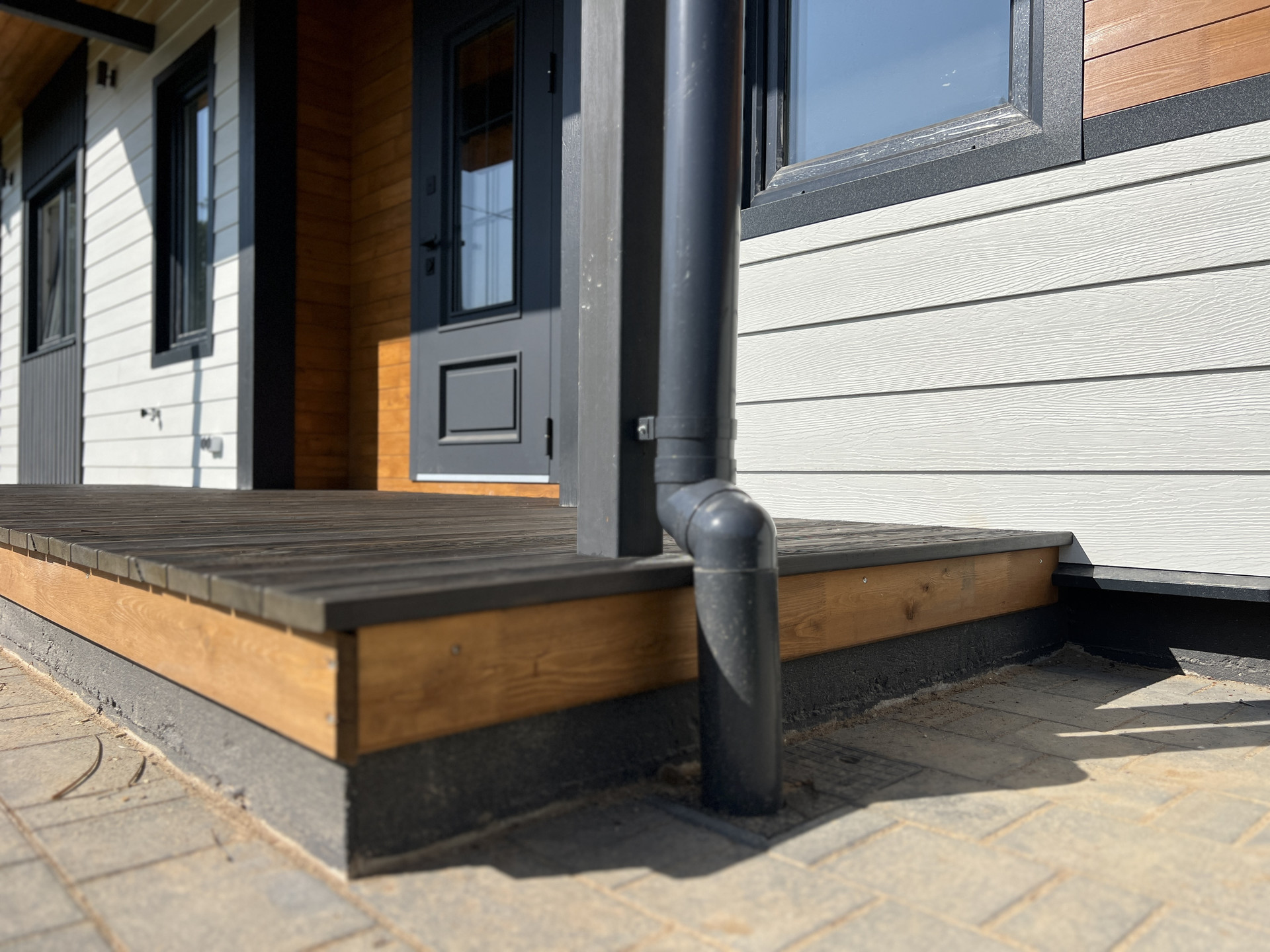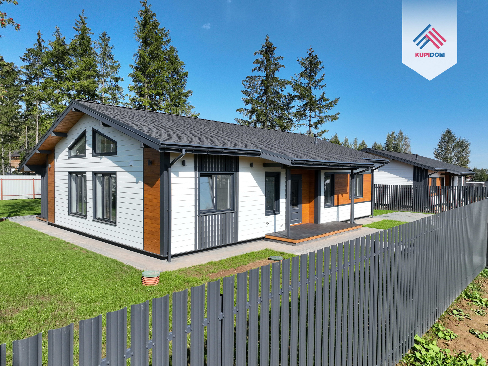 Дом каркасный, из сухого строганного дерева, построен по проекту. Фундамент - монолитная армированная плита; Крыша и фасад - вентилируемые; Вентиляция в котельной, санузлах и кухне; установлена водосточная система с отведением в ливневые колодца; Внешняя отделка дома - фиброцементный сайдинг DECOVER с декорирующими элементами из лиственницы; Декоративная подсветка дома; Утепление дома - стены - 200мм Knauf / межкомнатные - 100мм, пол - 50мм Пеноплекс, потолки - 250мм Knauf; Мембраны Grand Line; Окна - двухкамерные стеклопакеты REHAU 70 профиль с темной ламинацией; Крыша - мягкая кровля Технониколь; внутренняя отделка - полы - керамогранит / ламинат; Потолок - натяжной. На крыльце и террасе - террасная доска.