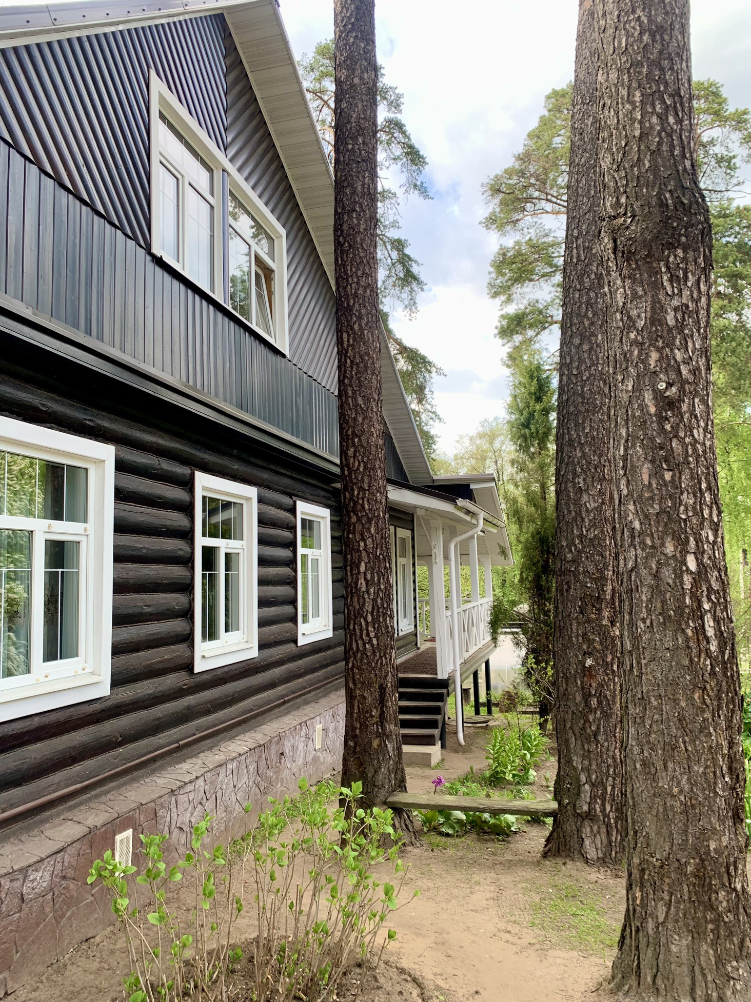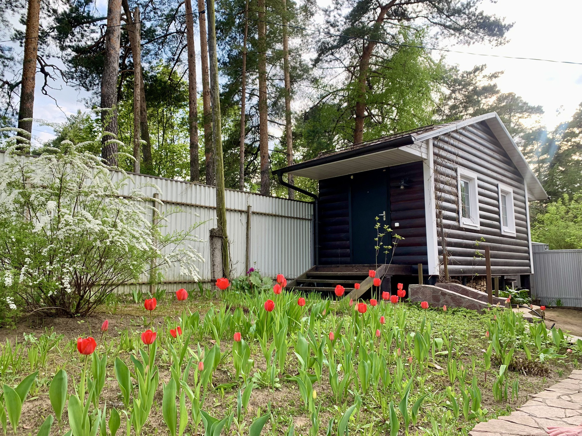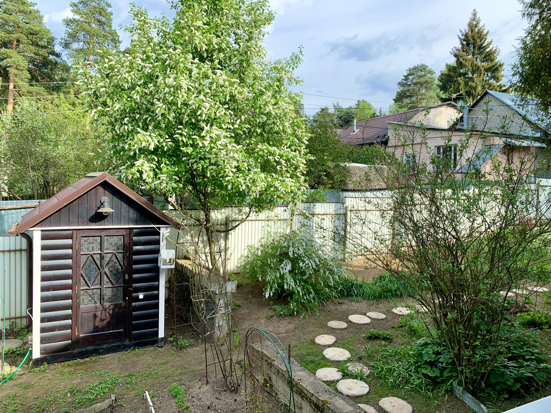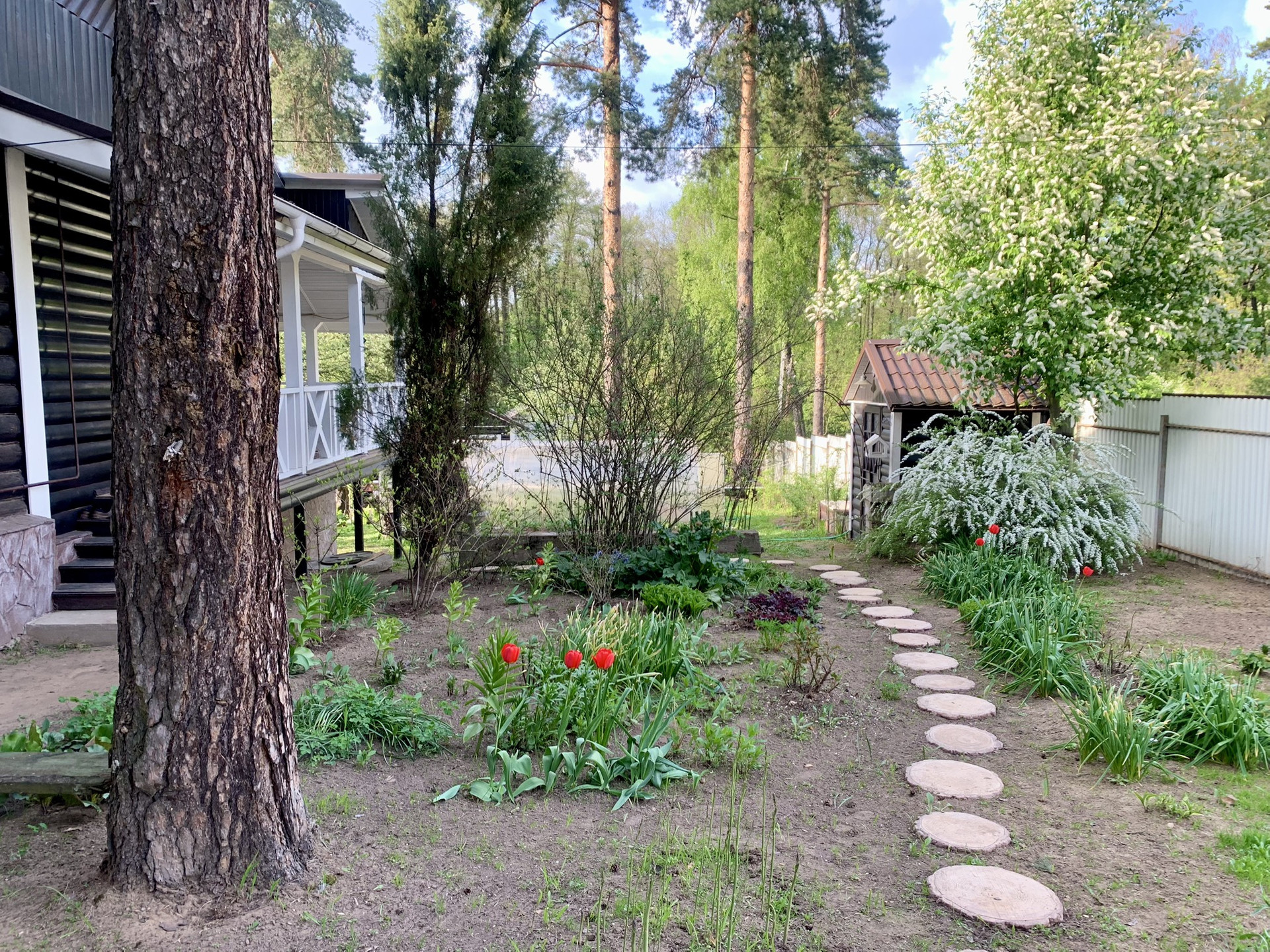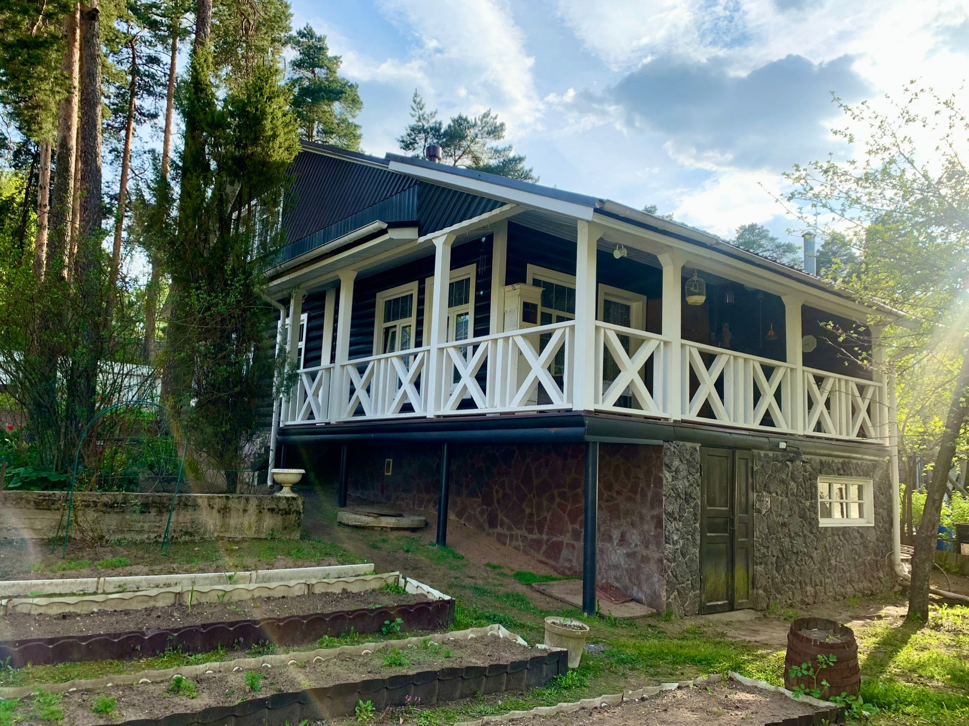 Ухоженный участок с мангалом, теплицей и теплыми грядками. Плодоносящие деревья и кустарники, клубника, много цветов и, конечно, сосны.