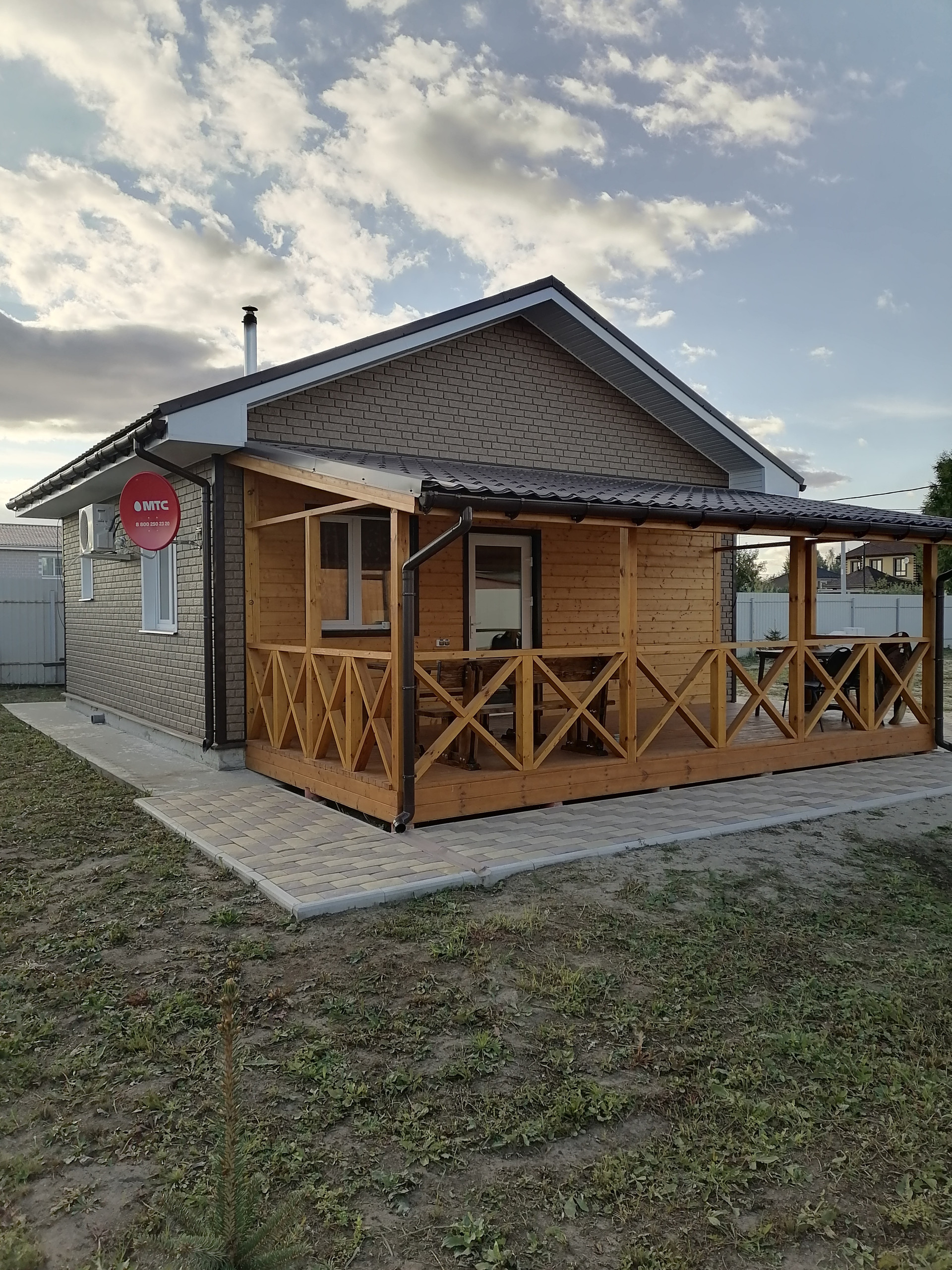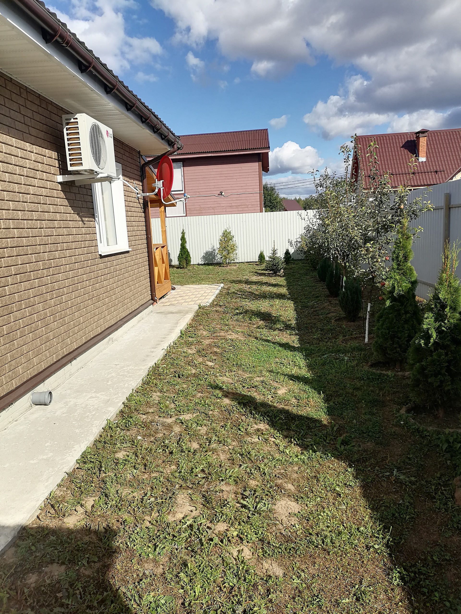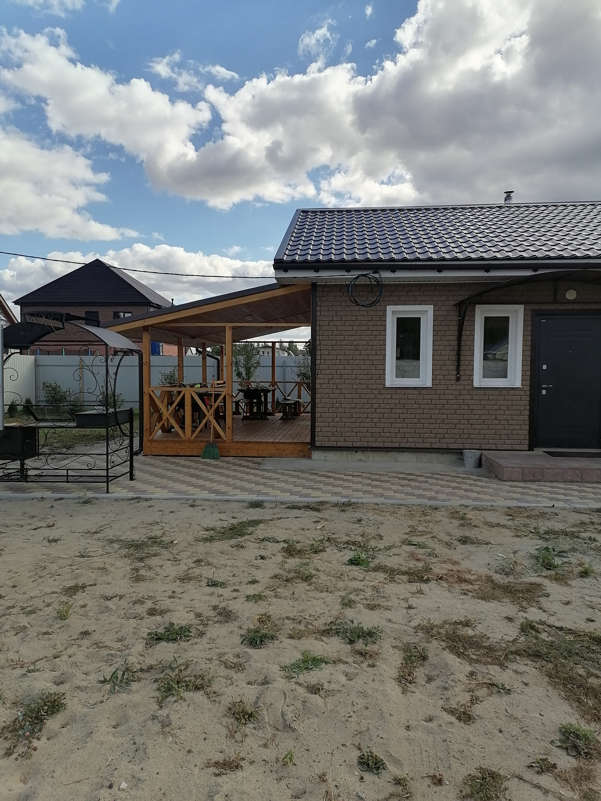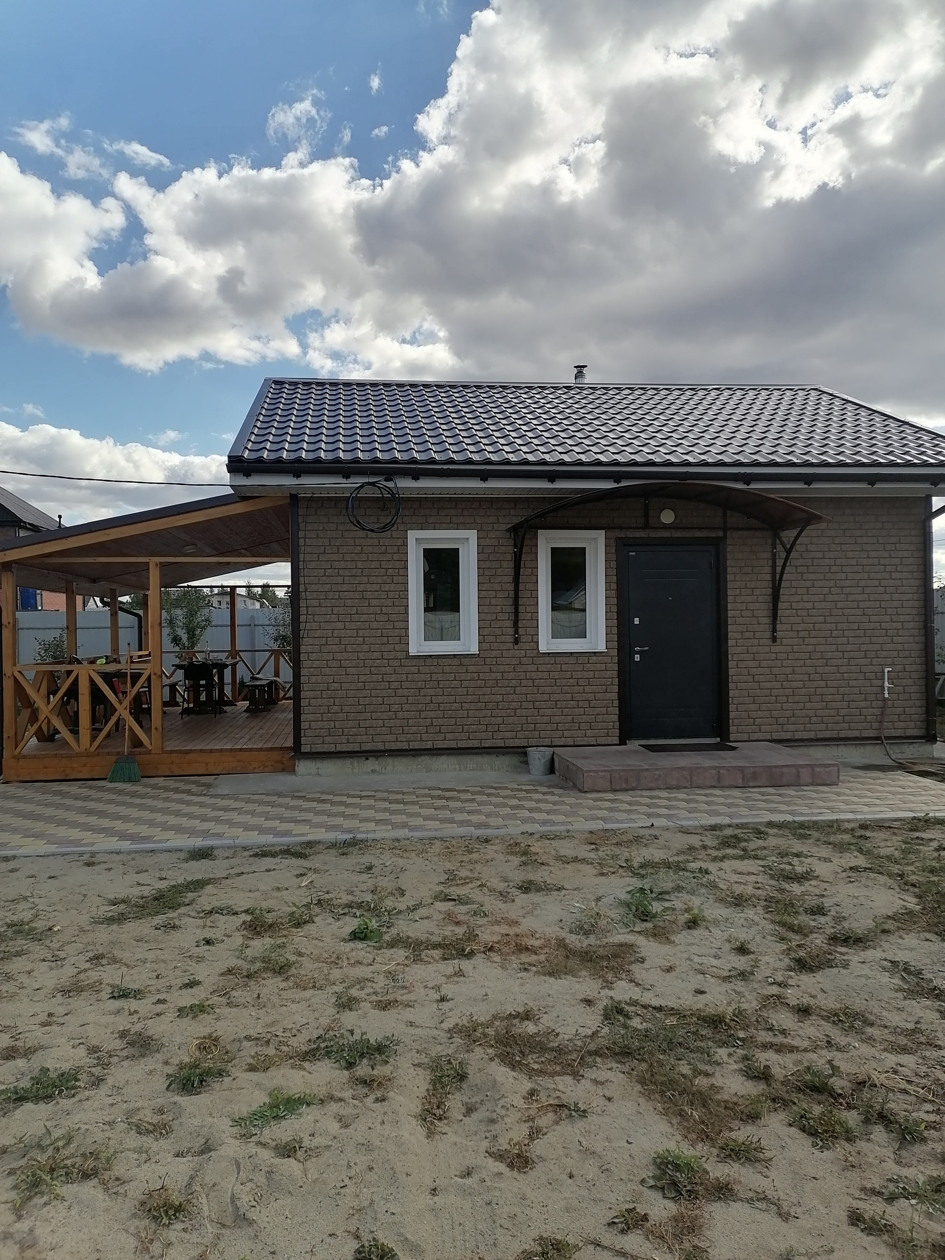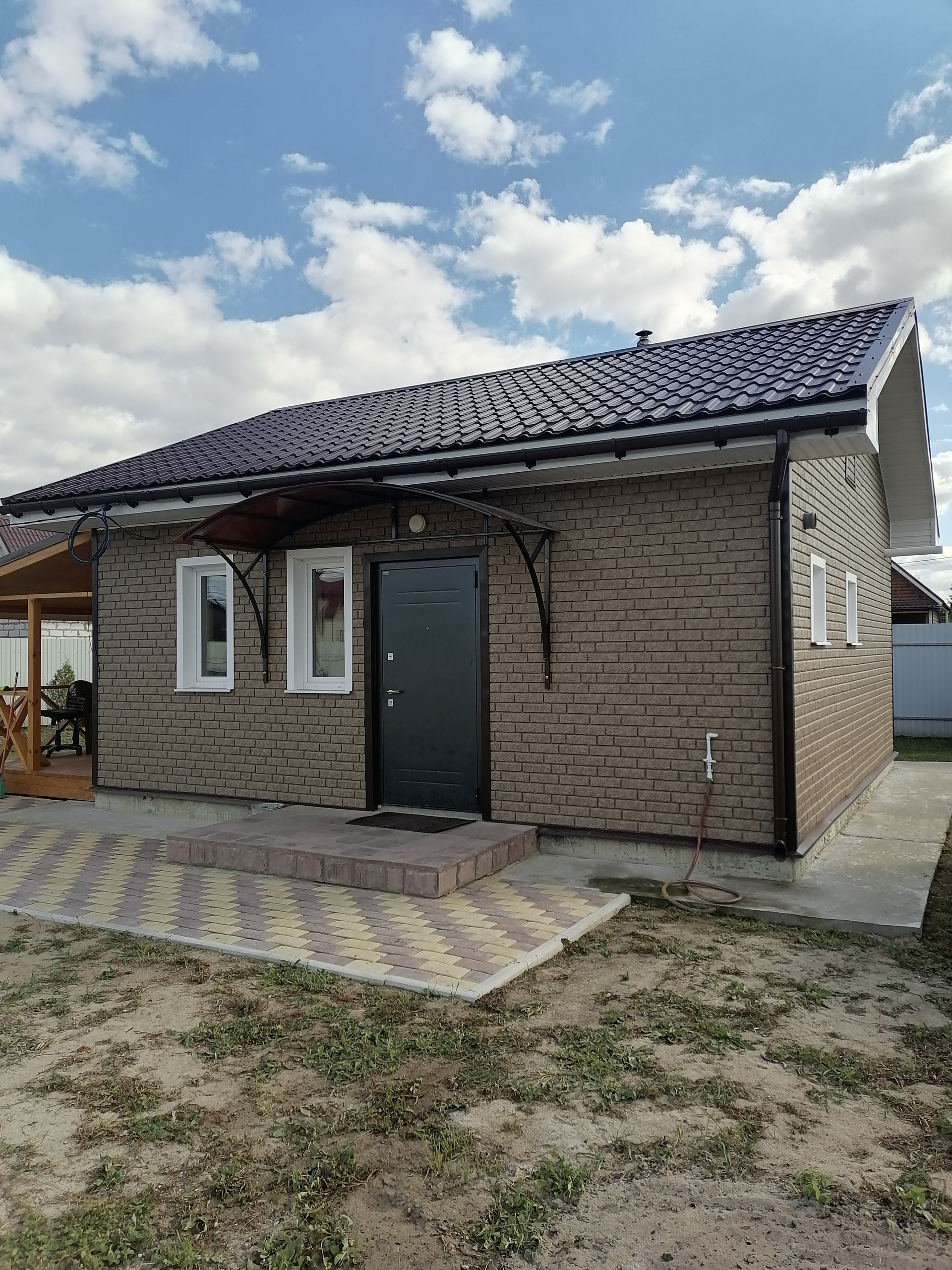 ДОМ-баня, капитальное строение из газосиликатного блока размером 7х7 метра с пристроенной террасой 7х3 метра. Снаружи дом обшит сайдингом с утеплением 5см, внутренняя отделка имитацией бруса. Дом состоит из нескольких помещений: кухня-гостиная с камином, парная с отделкой из липы, помывочная, туалет, подсобное помещение (котельная), коридор. Во всем доме сделан теплый пол, отопление- электрический котел 4.5 кВт, собственная скважина, установлена насосная станция с системой фильтрации воды, установлен кондиционер и спутниковое тв. Вокруг дома выложена тротуарная плитка, обустроена мангальная зона (с хорошим мангалом). По периметру участка насажено много растений.