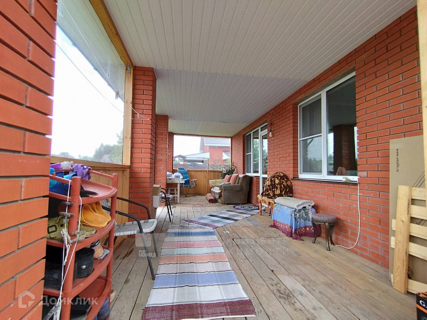 Все помещения в доме в соответствии с функционалом обставлены мебелью, дополнены текстилем. Большую террасу (21 квадратный метр) можно использовать не только летом, но и зимой, от дождя и снега защищают мягкие окна, под полом небольшой погреб для хранения овощей и заготовок.