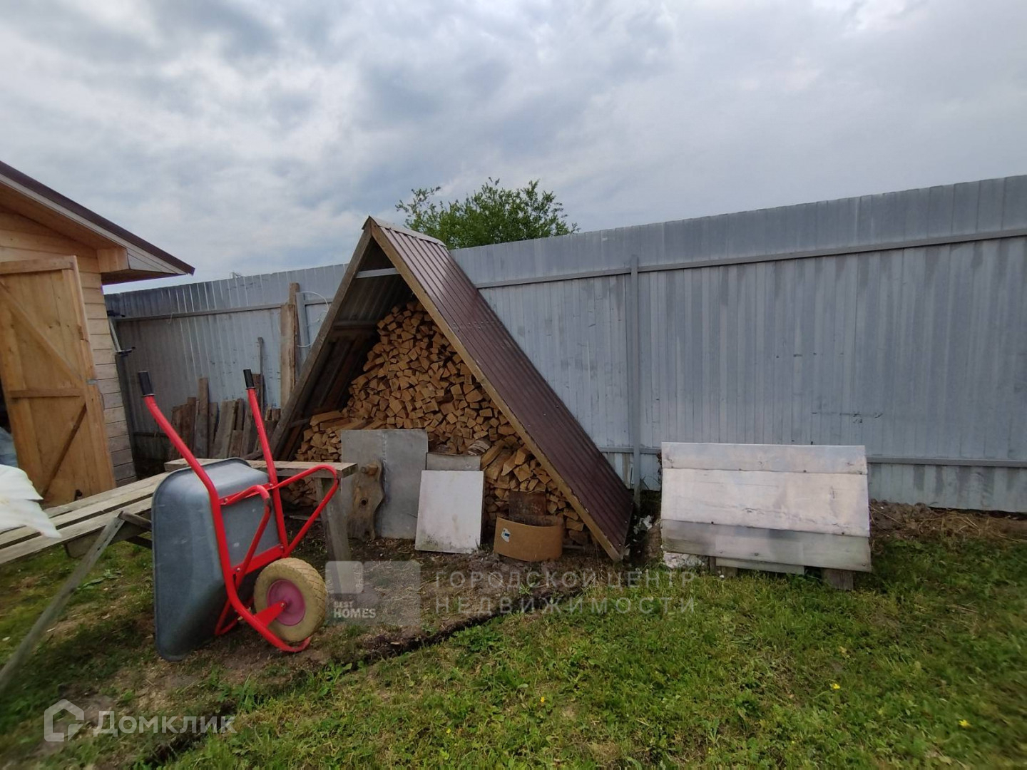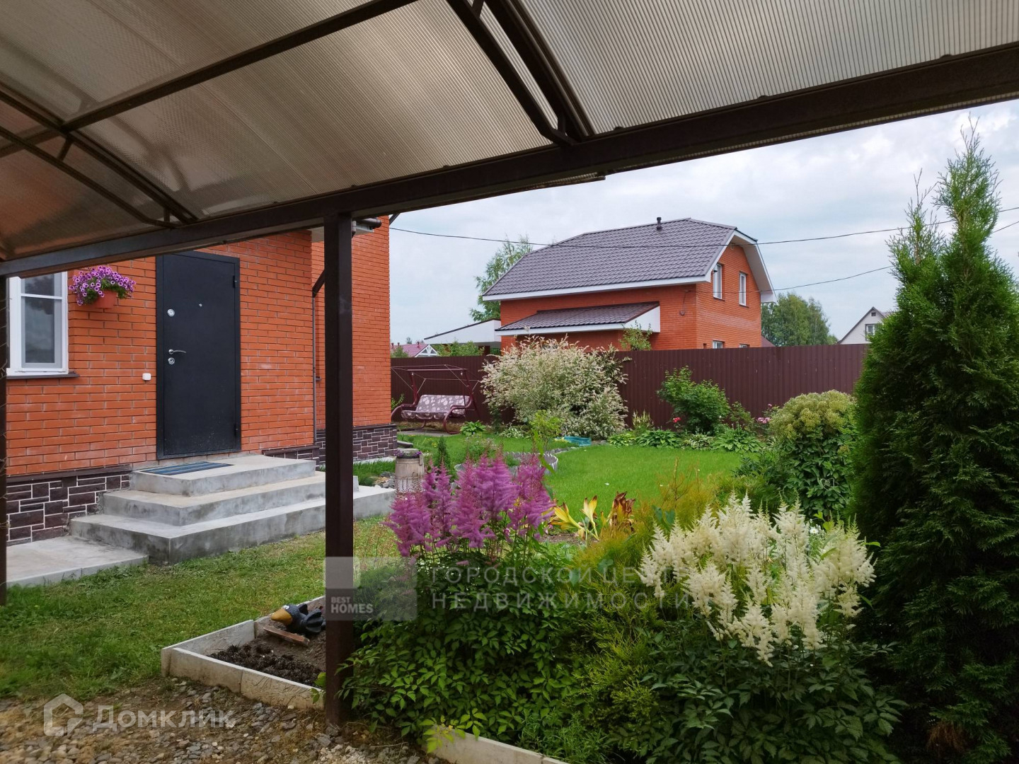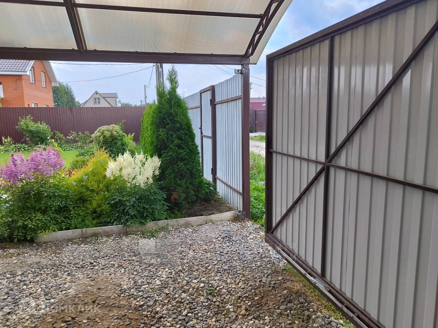 Для машины сделан навес и автоматические ворота. Участок со всех сторон огорожен металлическим забором.