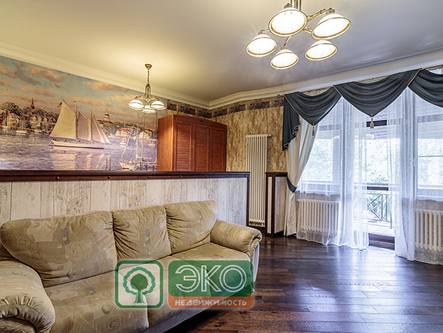 Композиция выстроена исходя из наличия великолепного второго света с внутренним балконом. Большие окна подчеркнуты яркими драпировками. Отделка выдержана в коричневой гамме, наиболее глубокий тон представлен укладкой пола и деревянными подоконниками.