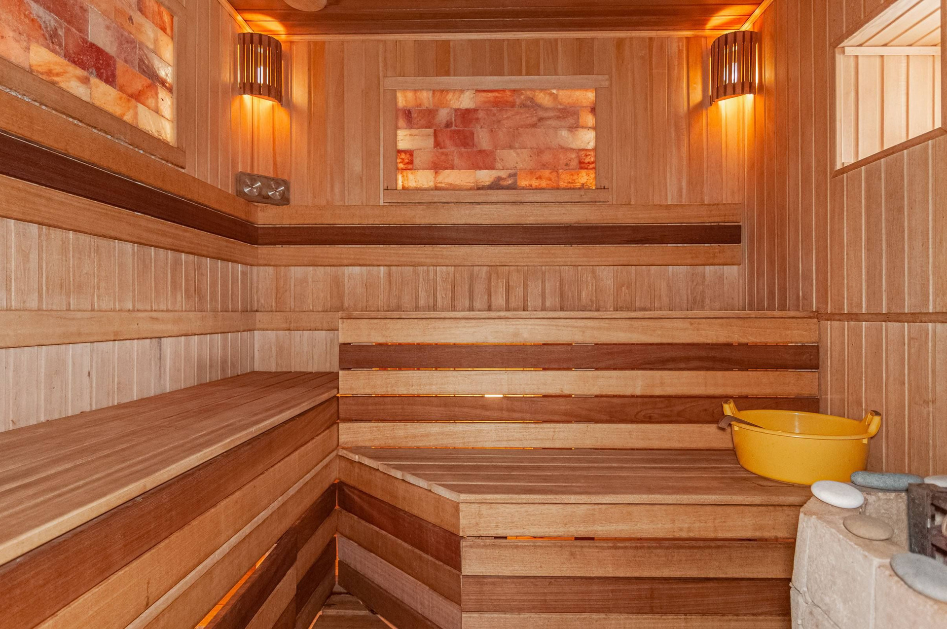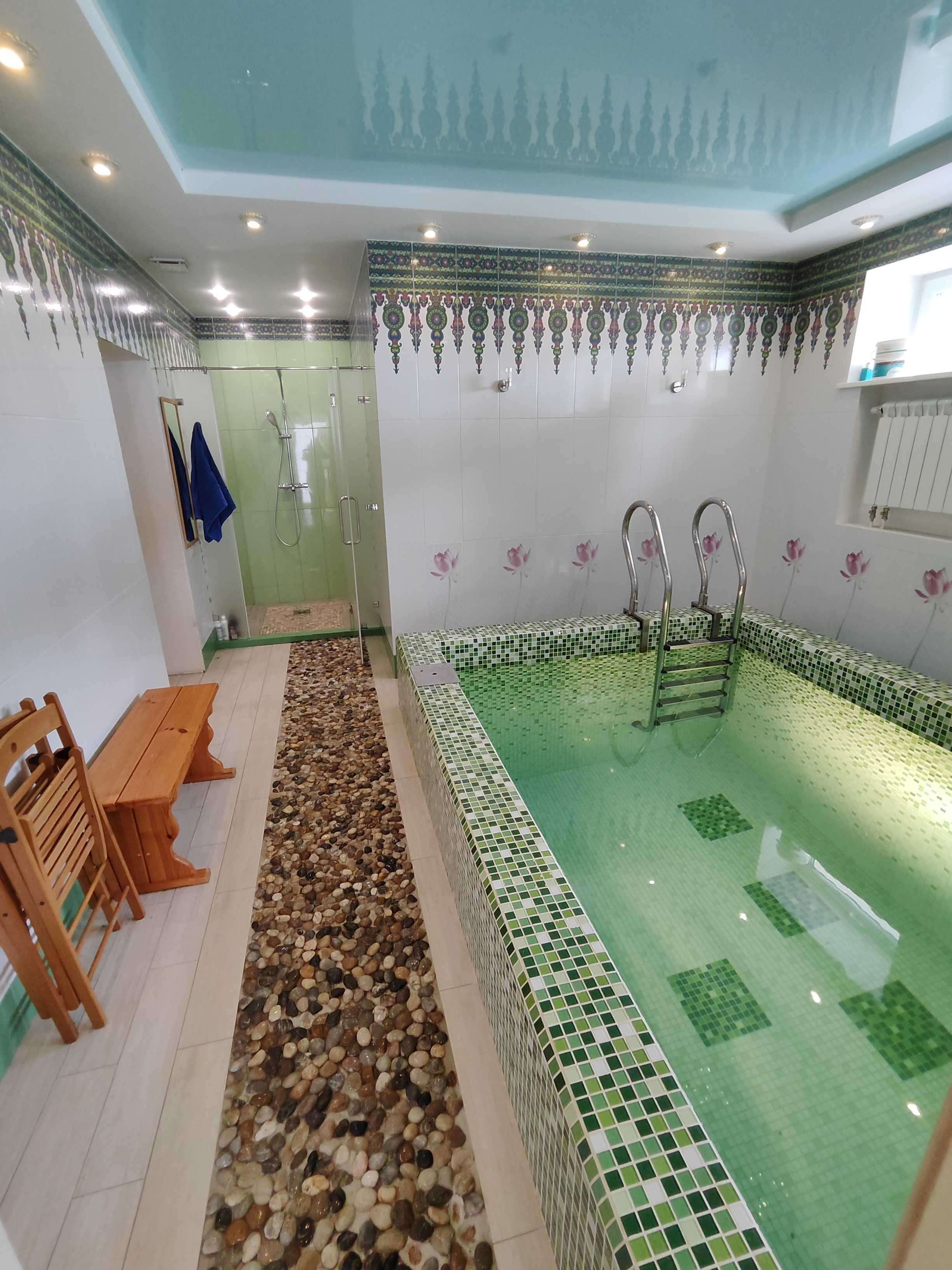 Первый этаж: холл, объединенная кухня-гостиная с видами на участок, гостевая спальня, бассейн, сауна, с выходом на патио, санузел, отапливаемый гараж на два автомобиля, техническое помещение.