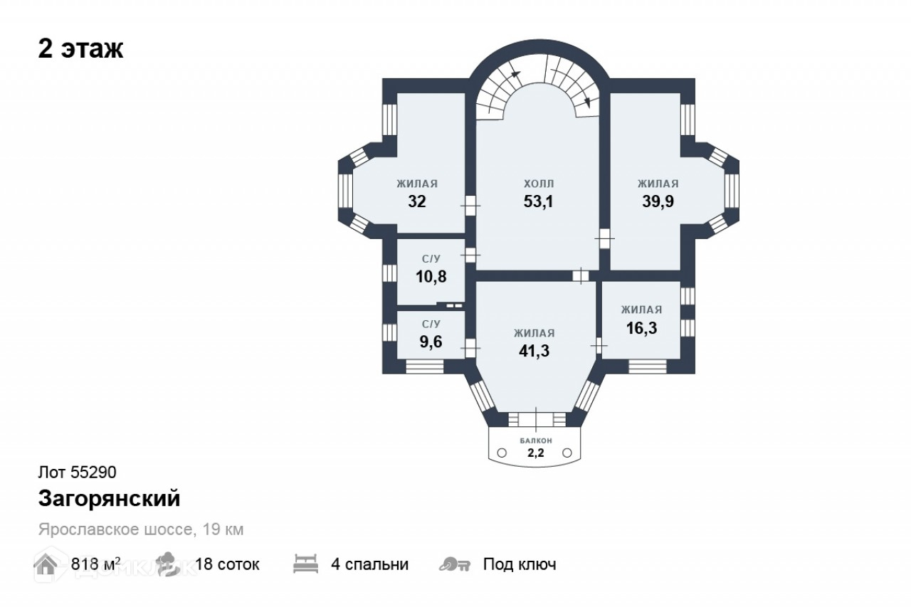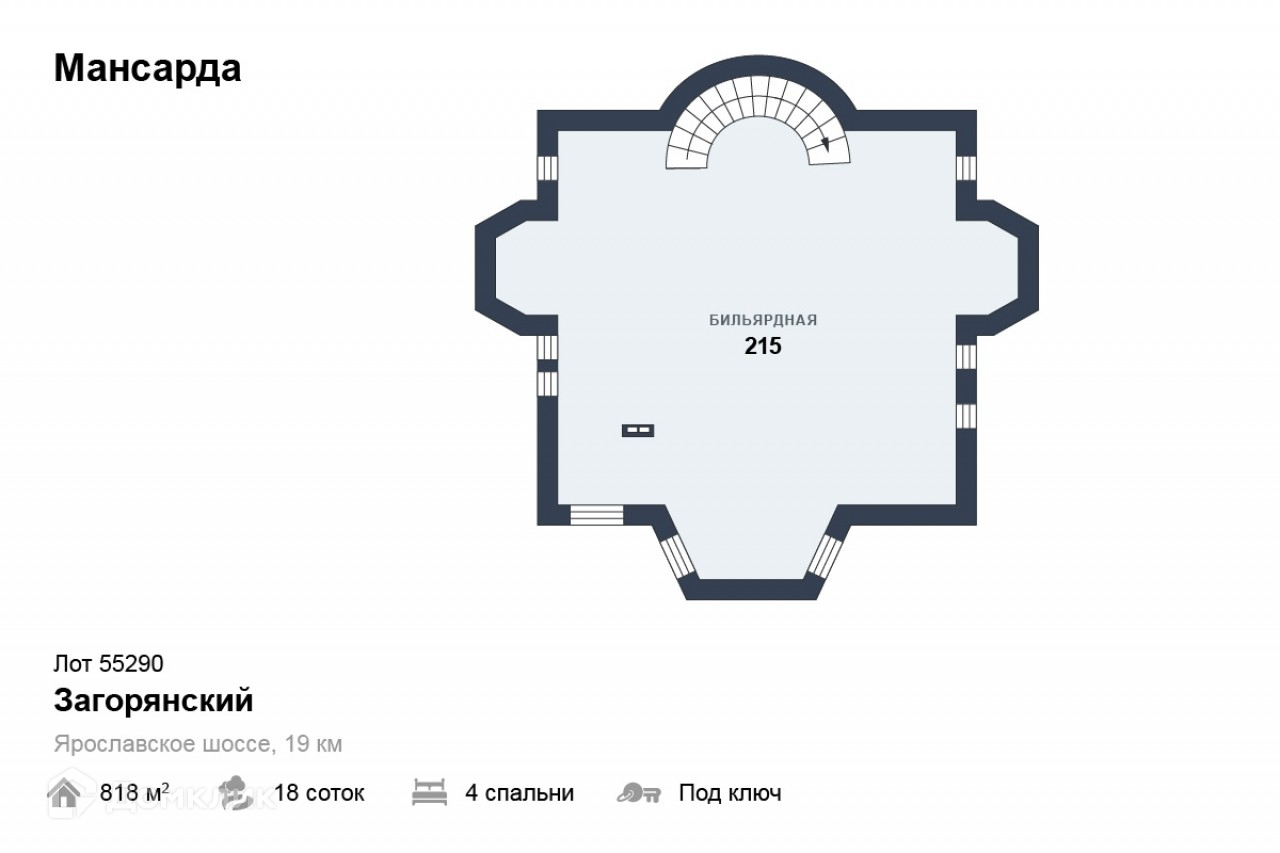 Лот №55290. Дом под ключ 818 кв.м. на участке 17.62 соток. Количество спален: 4. Загорянский, Ярославское шоссе, 19 км от МКАД. Участок правильной прямоугольной формы, огорожен капитальным забором с автоматическими воротами. На участке расположены: гараж на 4 мм с гостевым домом на 2 этаже, детская площадка, высажены хвойные деревья.  Роскошный загородный дом в тихом, экологически чистом месте. Высокое качество строительства и внутренней отделки дома! Дом обставлен эксклюзивной итальянской мебелью в классическом стиле.  Солидные соседи. Подъезд-асфальт. Инфраструктура г. Королев. Цоколь: котельная,  сауна, с/у, комната отдыха, подсобные помещения. 1 этаж:  прихожая, гардеробная, с/у, кухня, гостиная, спальня. 2 этаж: холл, 2 детские спальни, мастер-спальня с балконом, холл. Мансарда: игровая, бильярдная.