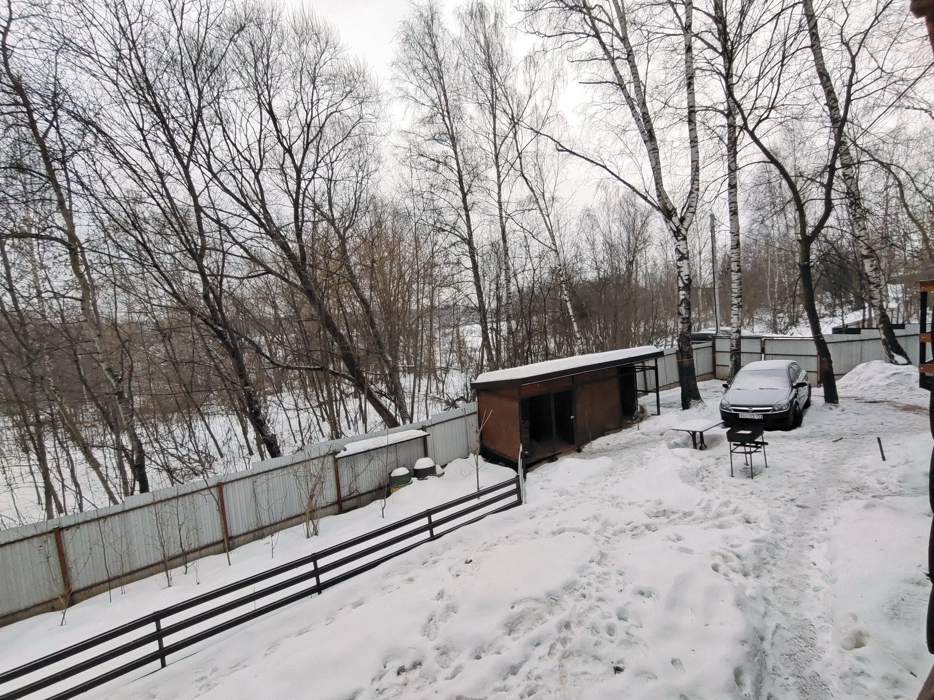 На участке имеется место для парковки двух машин. Дополнительно имеются два парковочных места рядом с воротами и не мешают проезду на участок.