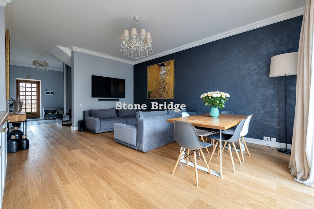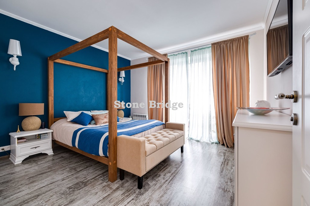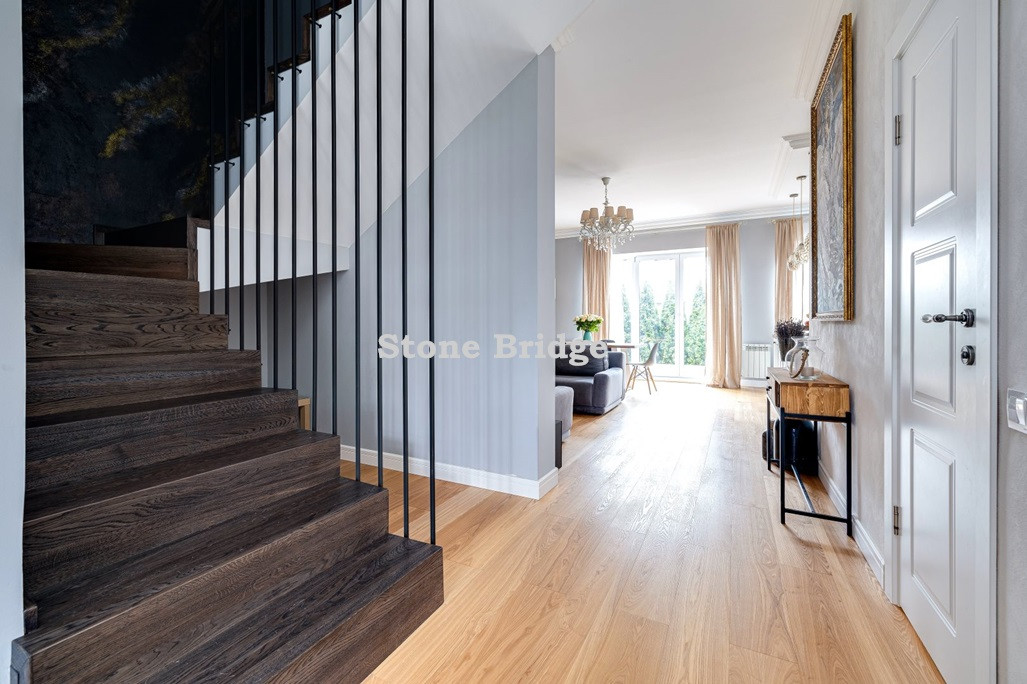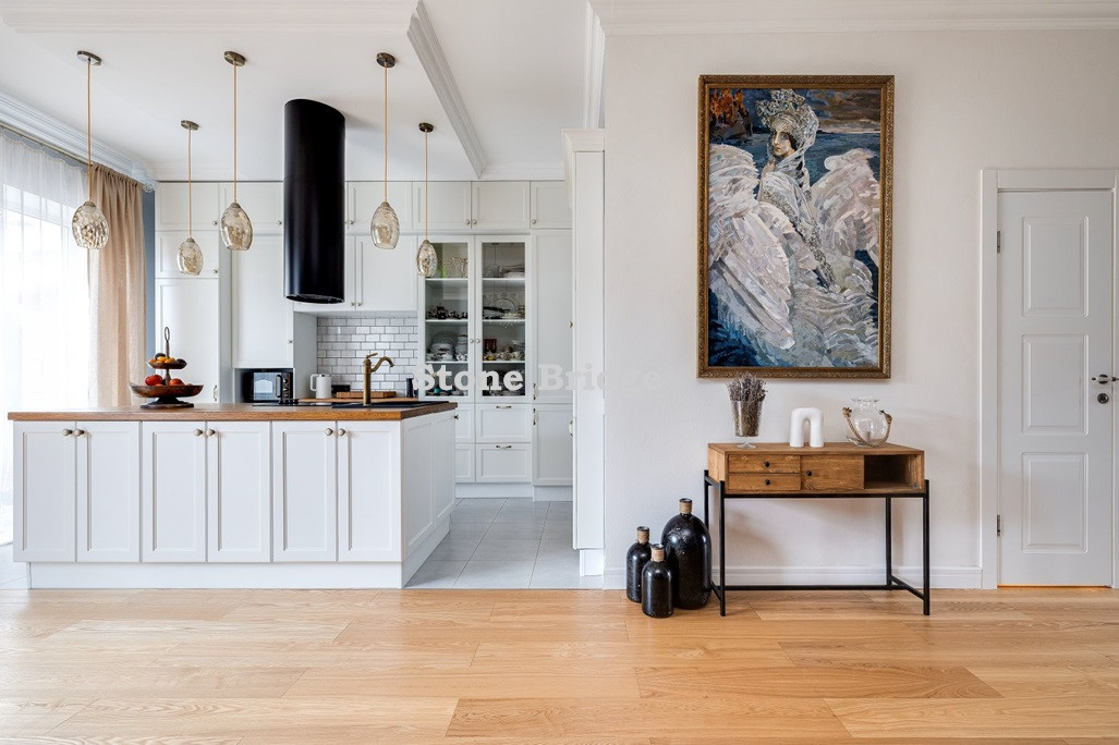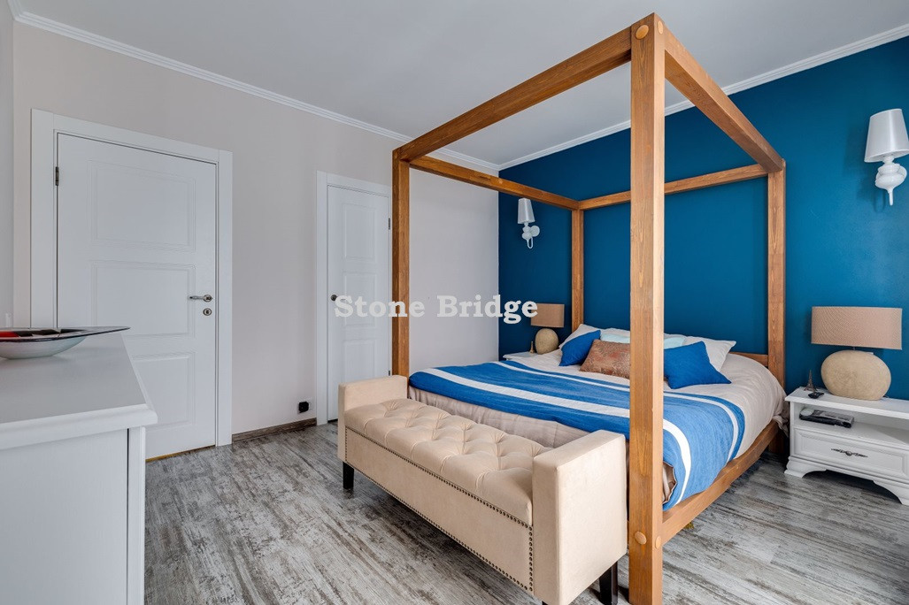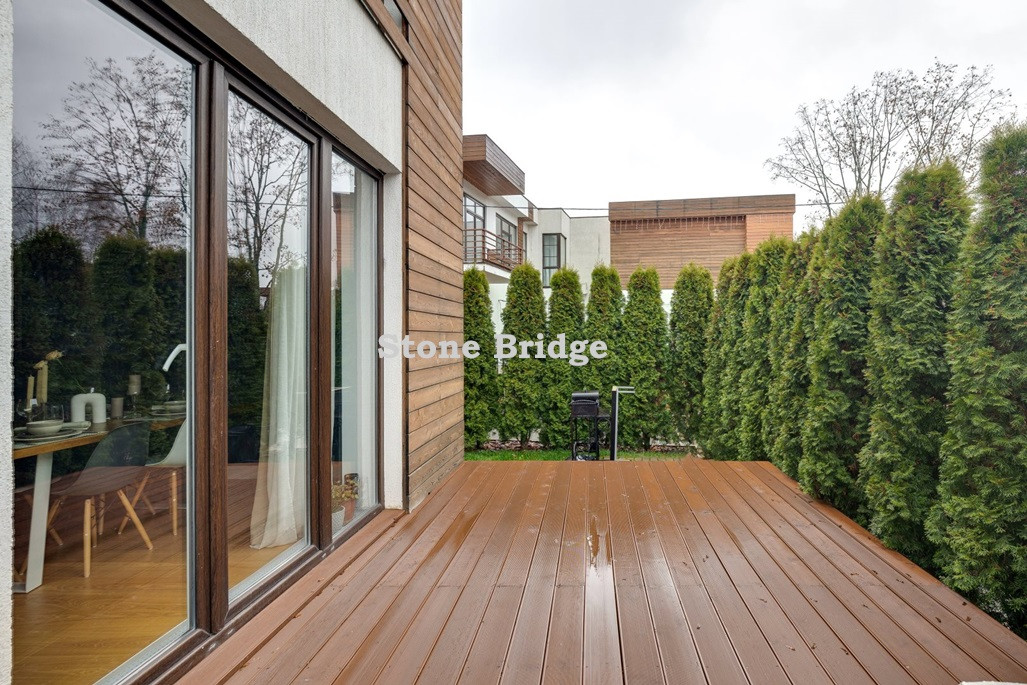 На первом этаже и в двух спальнях - французские окна от пола до потолка. Выполнен дизайнерский ремонт, использованы качественные натуральные материалы. Высокие потолки, хорошее естественное освещение, ощущение простора.