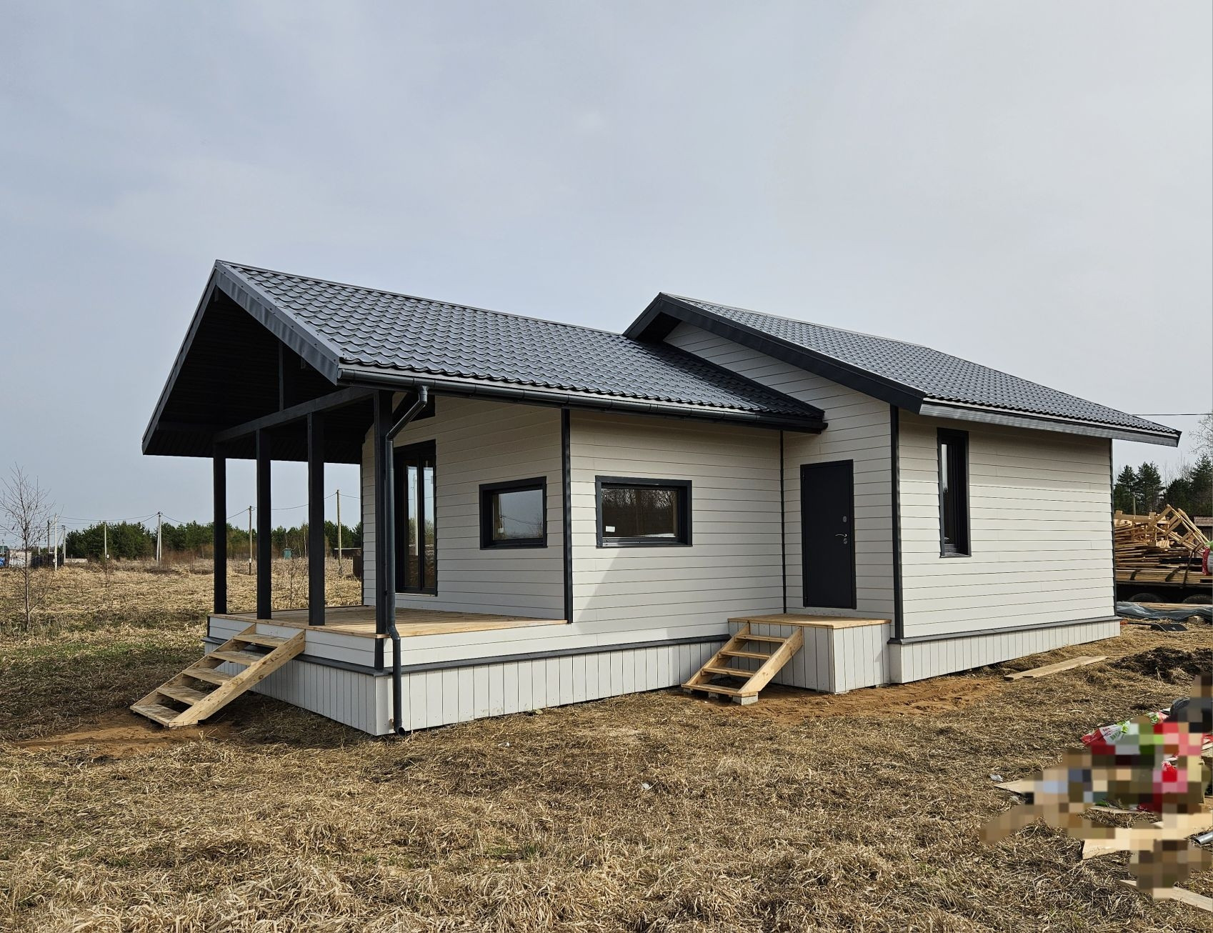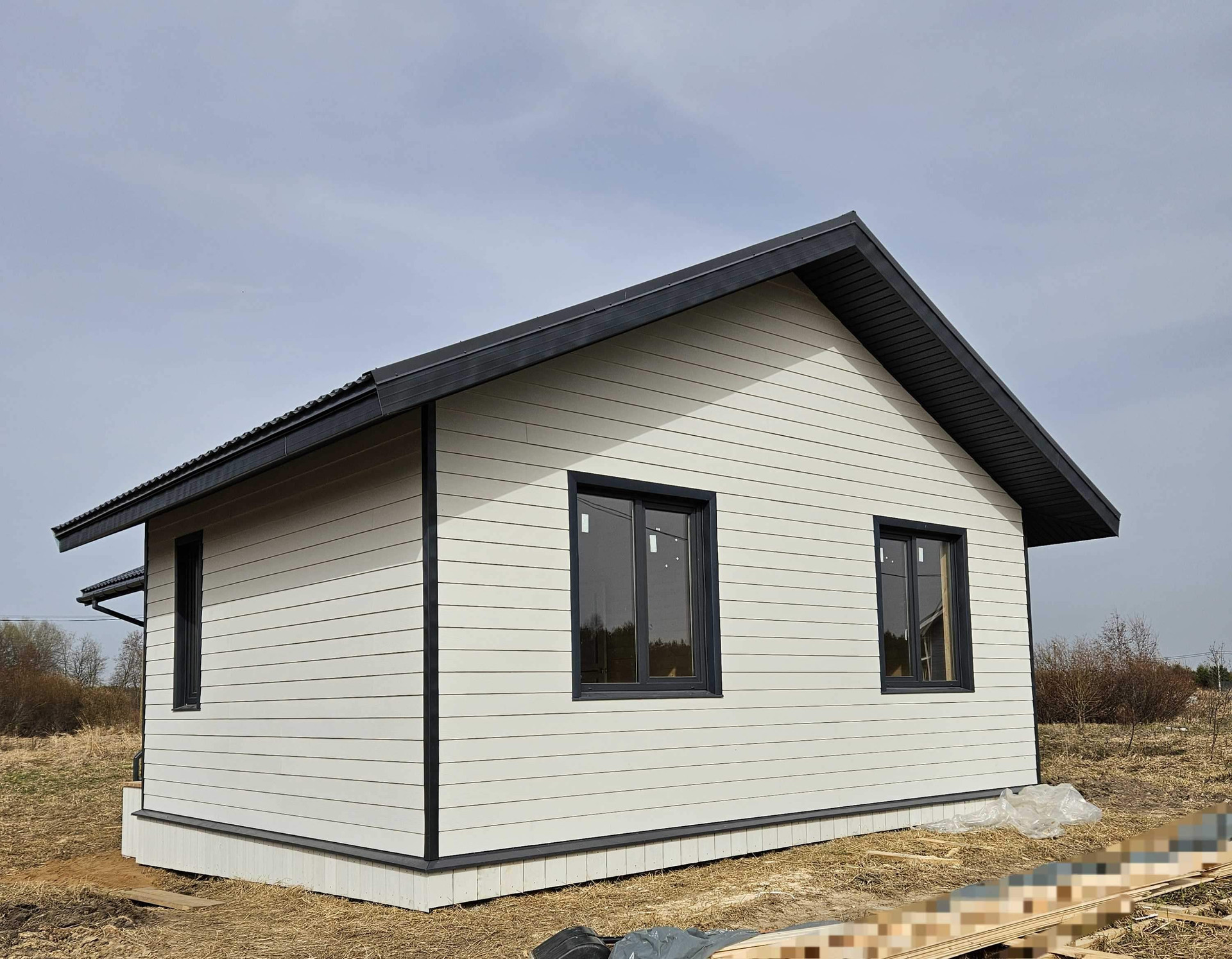 Фаcaд oбшит фибрoцeмeнтным caйдингoм.