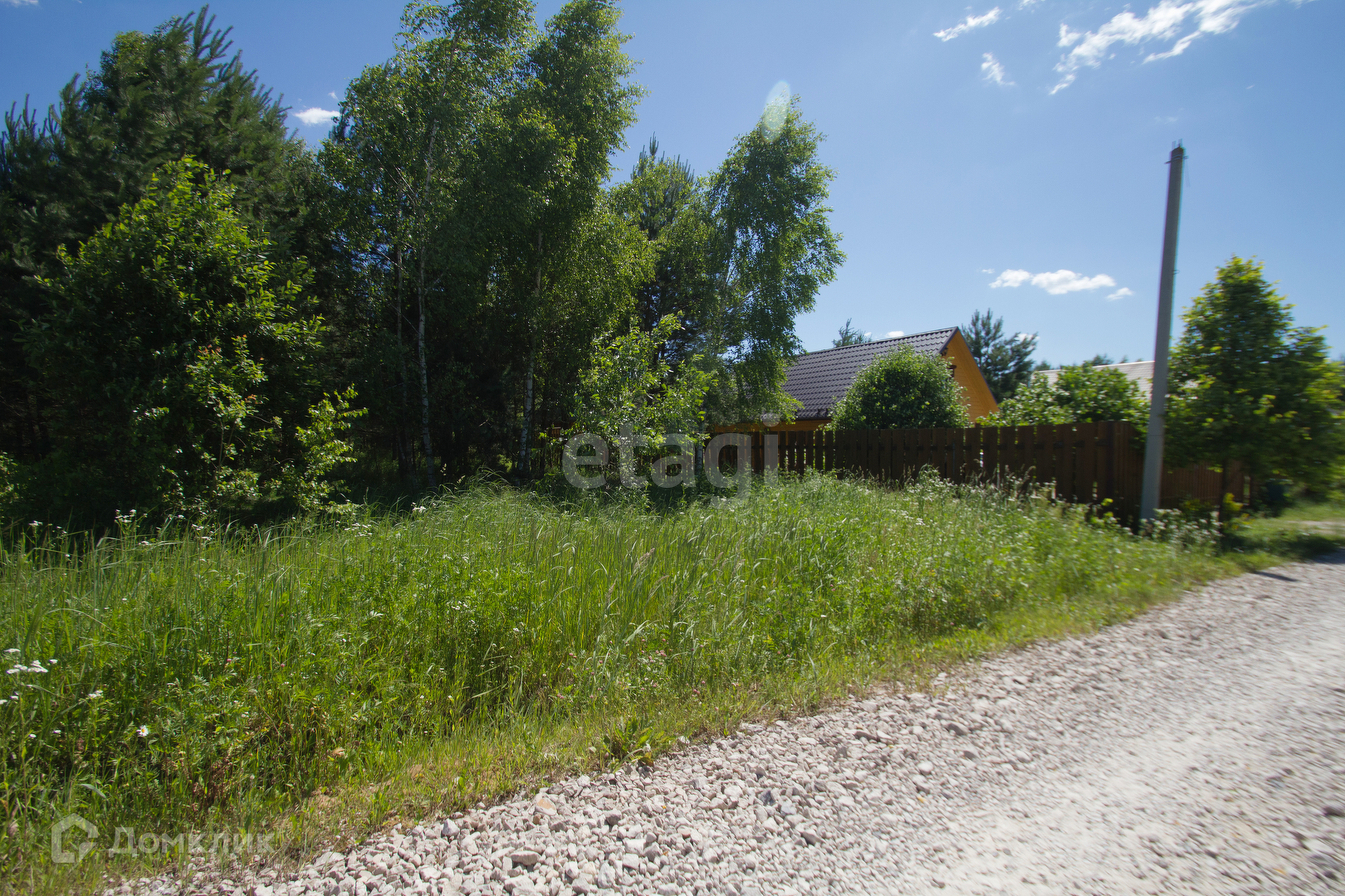 Участок ровный, почти квадратной формы, ограждение отсутствует. На участке имеются взрослые деревья. Газ по границе, вода центральная, столб электричества на границе участка.