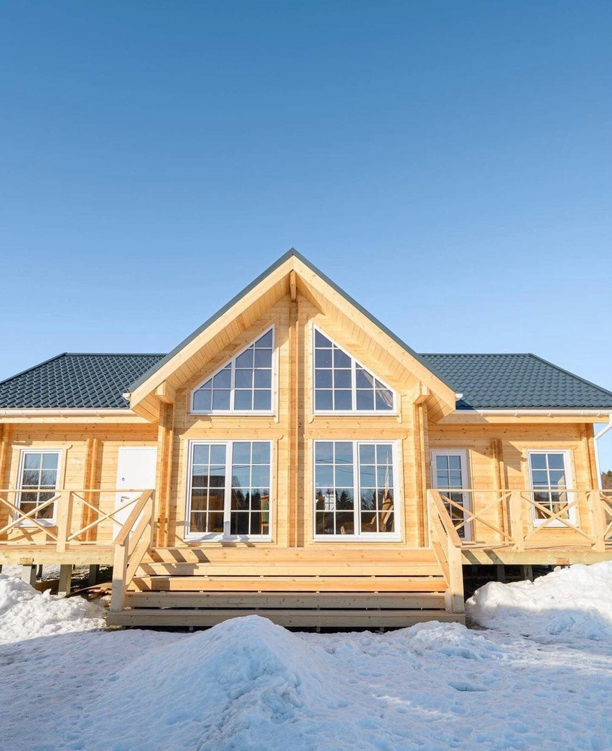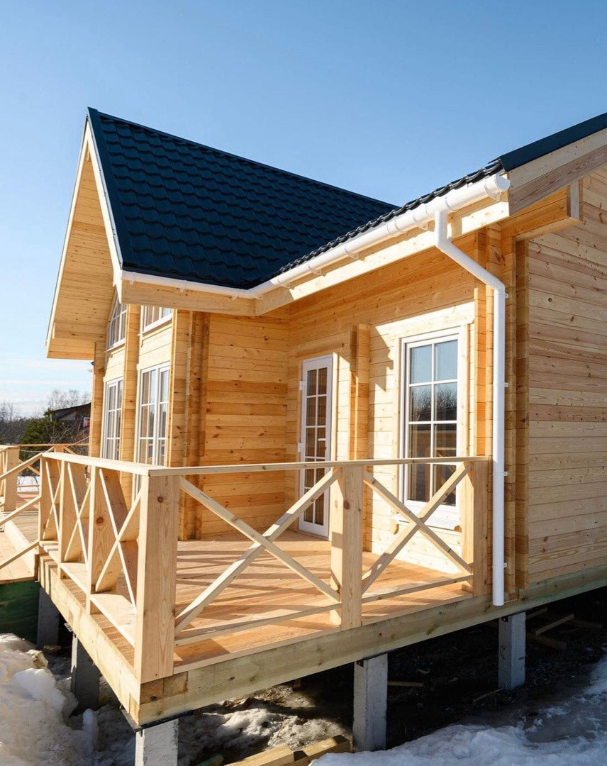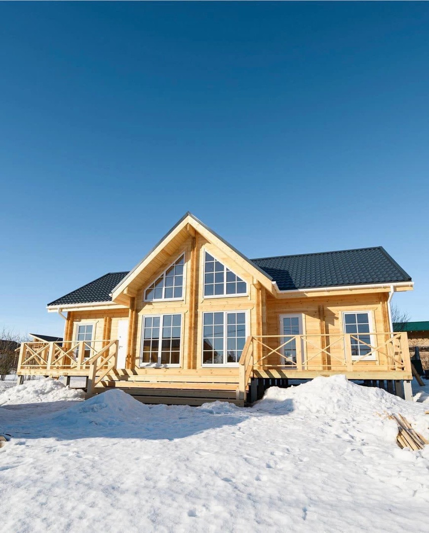 В стоимость комплекта входит пол и крыша с утеплением 200мм Рагос, чистый пол, окна, входные и балконные двери, отделка потолка 1-го этажа и крыши изнутри имитацией бруса.