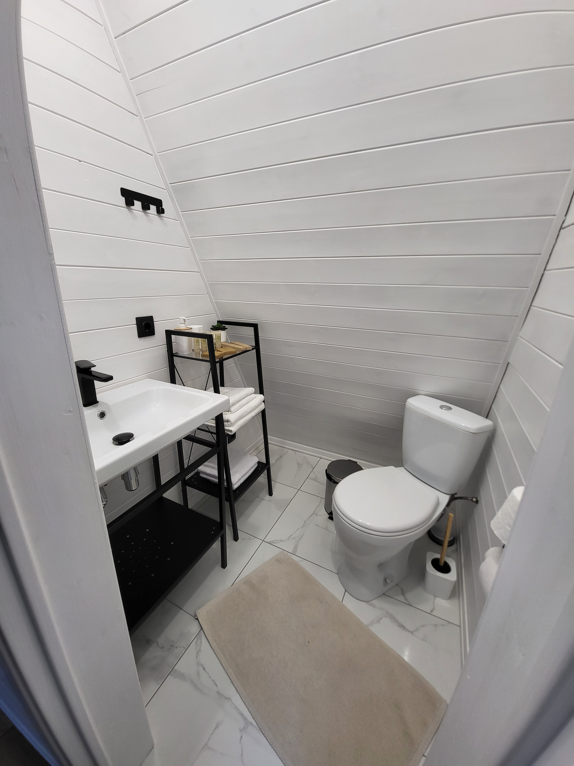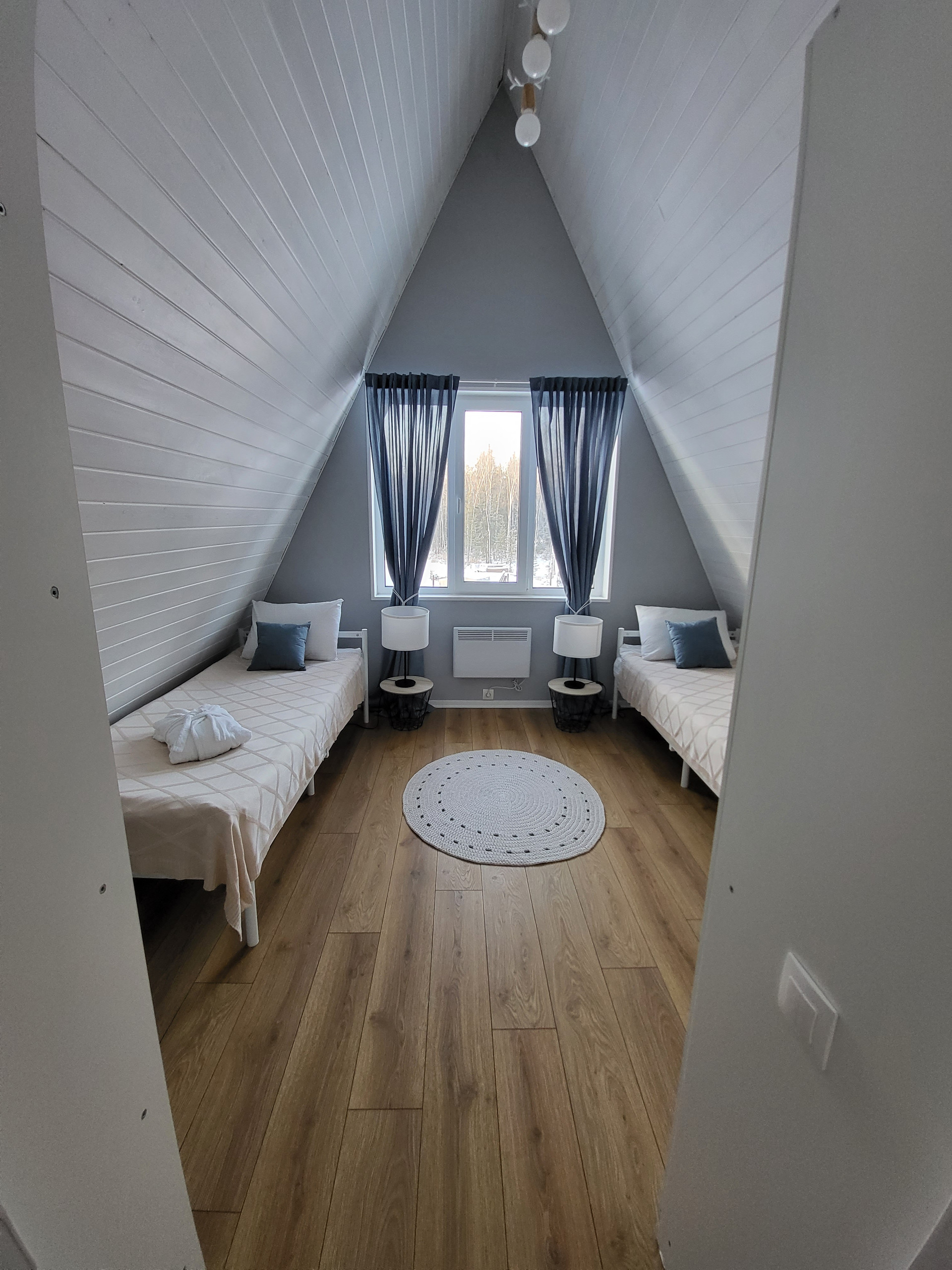 В доме большая гостиная и кухня с панормаными окнами, 2 спальни, 2 санузла, техническое помещение, кладовая и гардероб, террасса на улице. Площадь дома 105 кв.метров. Тип дома - A-frame