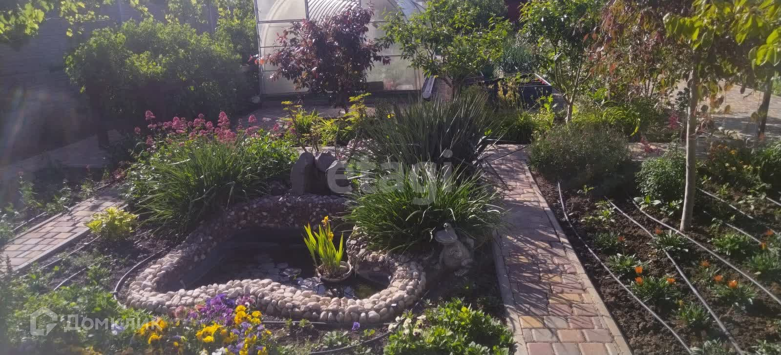 На территории участка высажено большое количество роз, фруктовых деревьев, малины, клубники. Газон засажен клевером. Есть маленький фонтан, парковочное место для машины. Есть парковочное место возле участка.