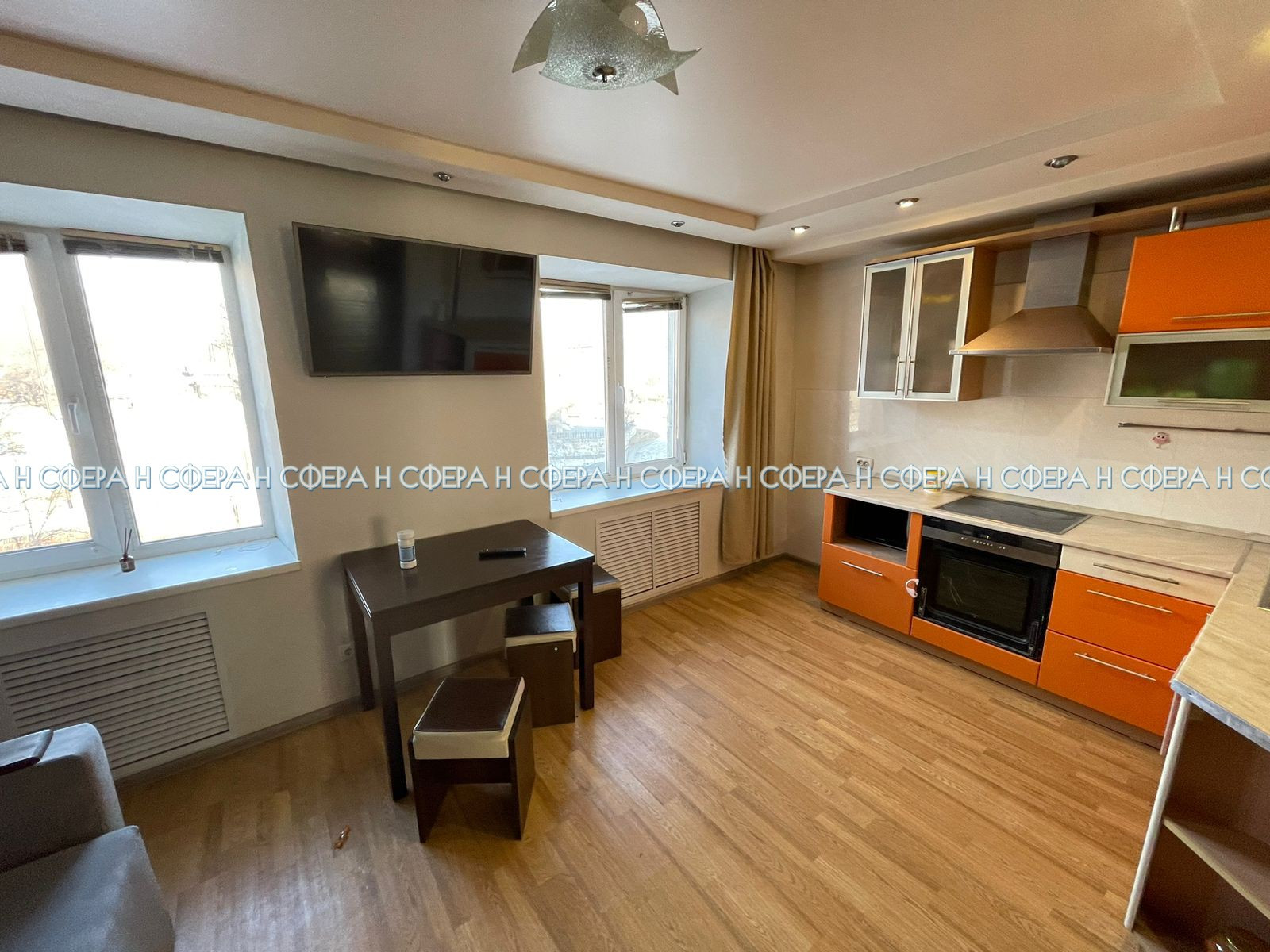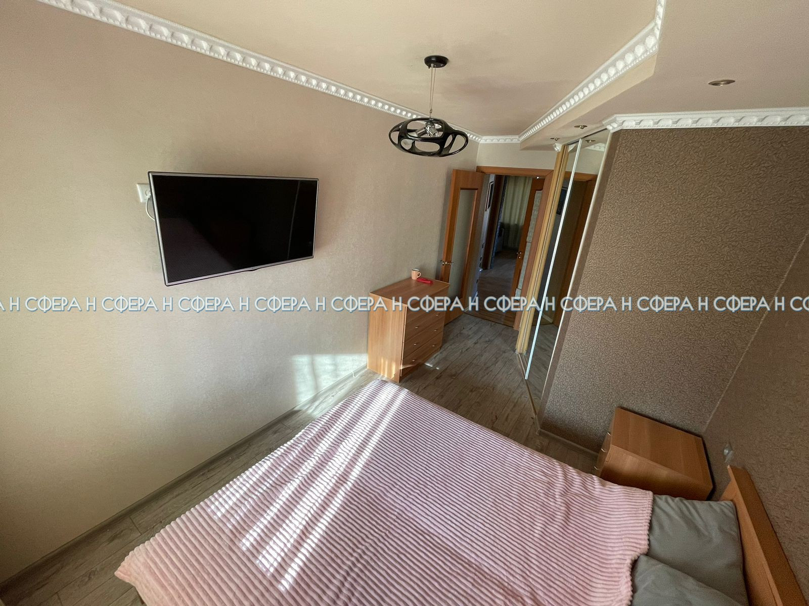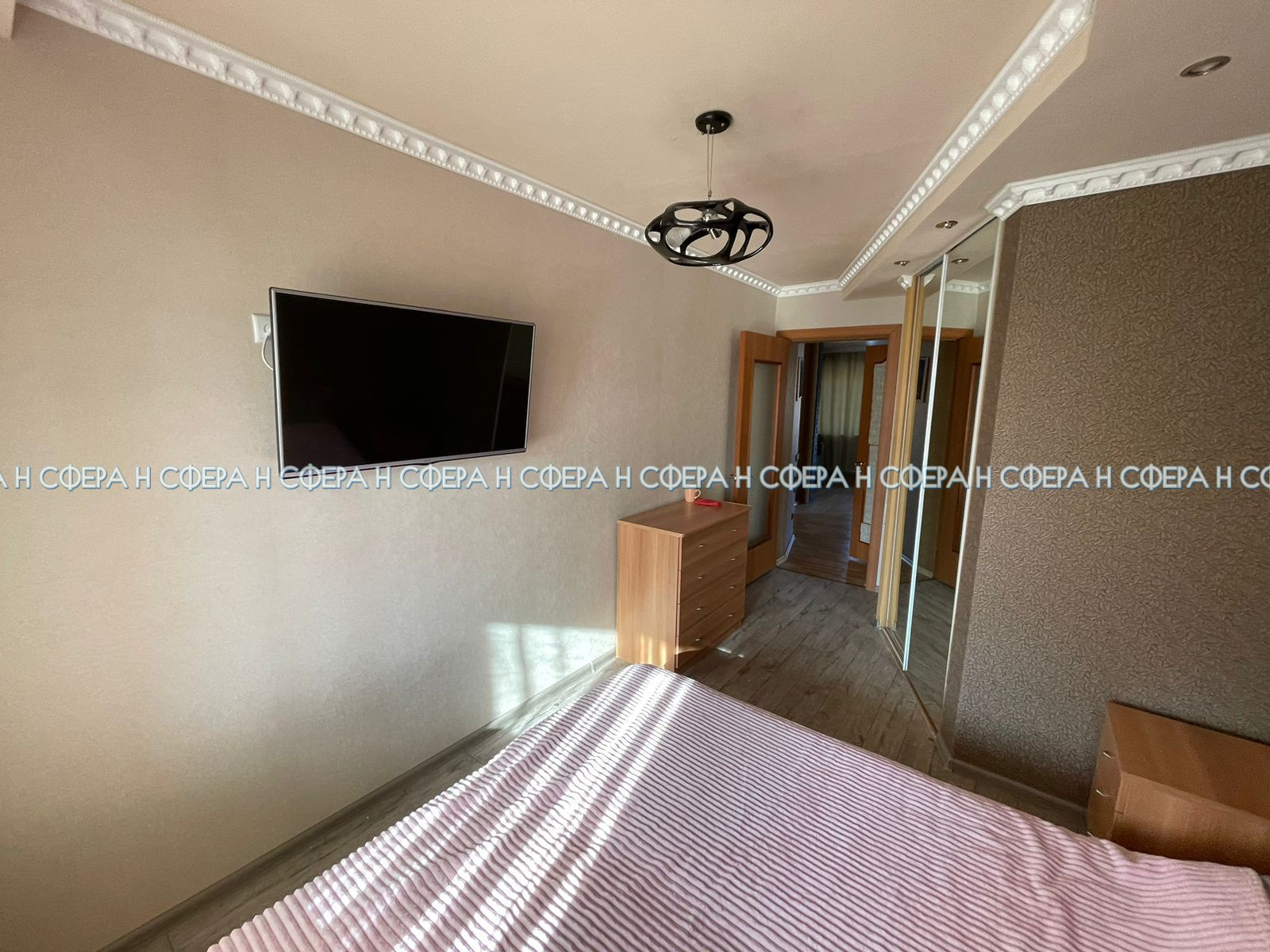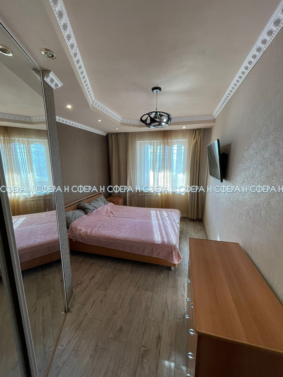 двухспальняя кровать, шкаф купе (4 шт), комод, прикроватные тумбочки, телевизор (2 шт), микроволновая печь, варочная панель, вытяжка, духовой шкаф, титан, стиральная машина, кухонный гарнитур, кухонный стол, стулья