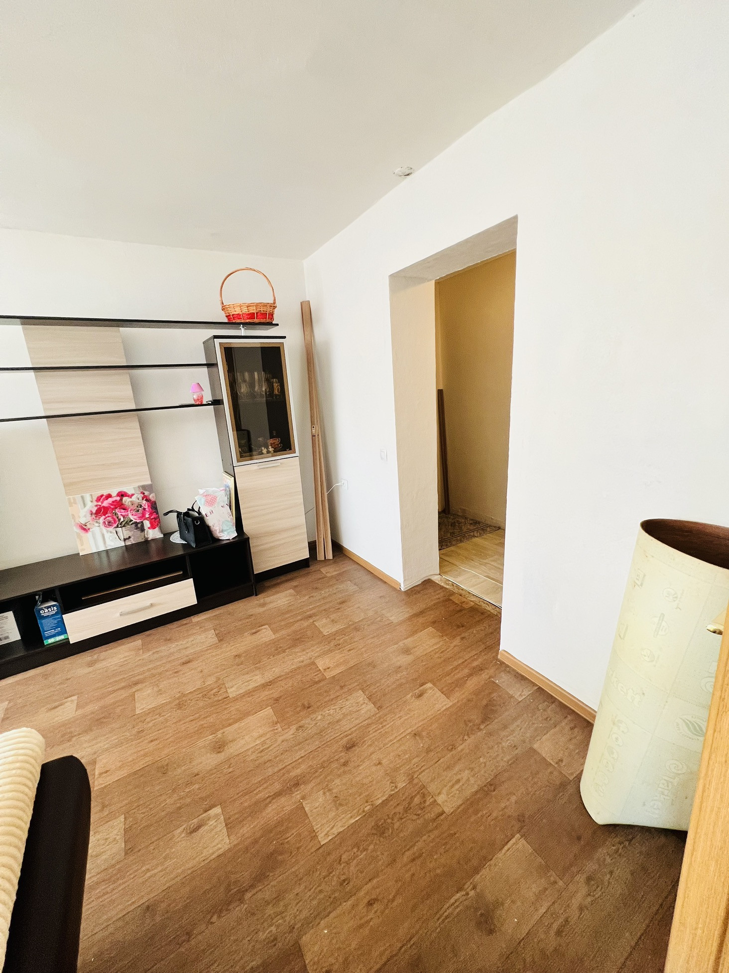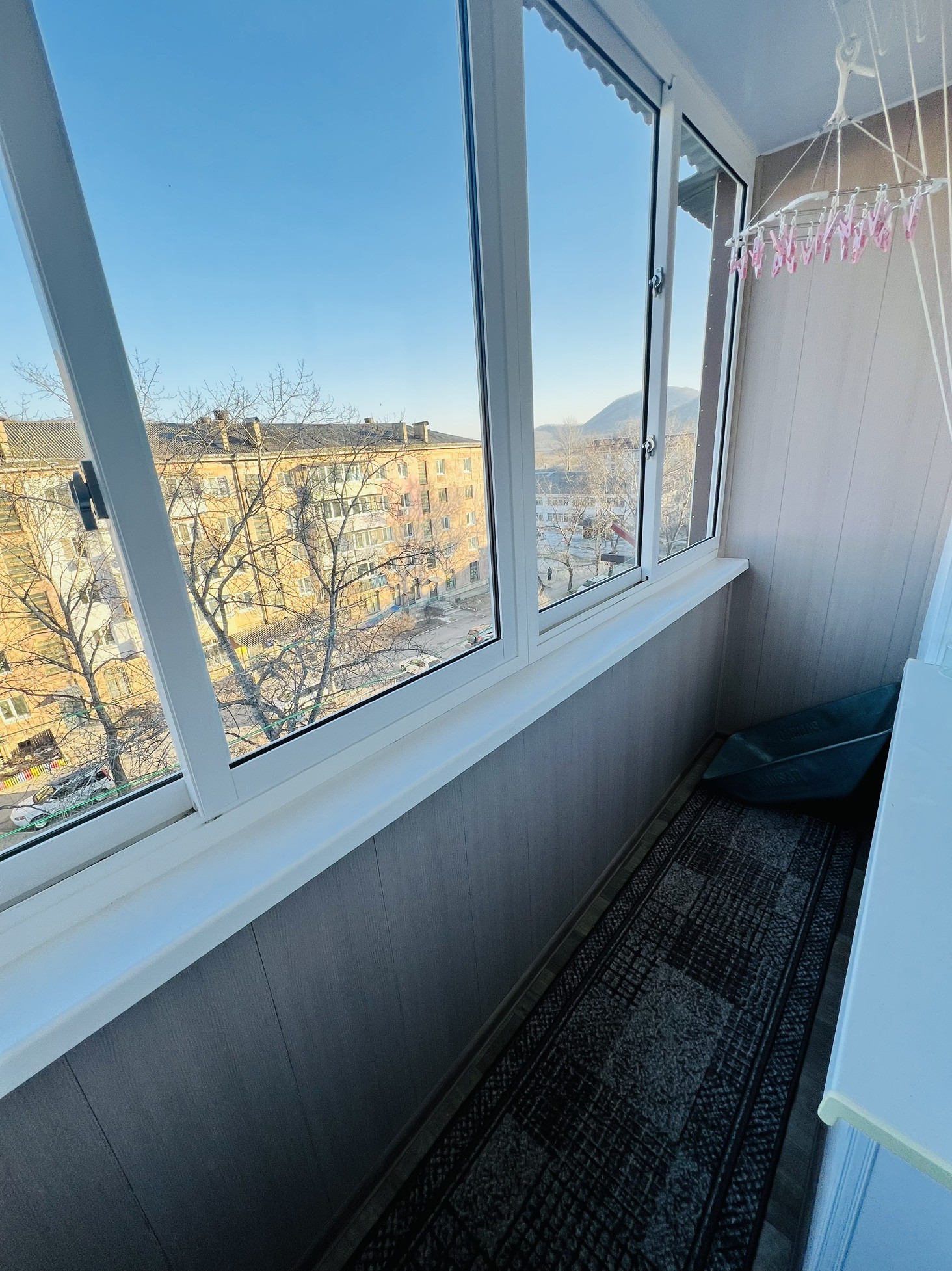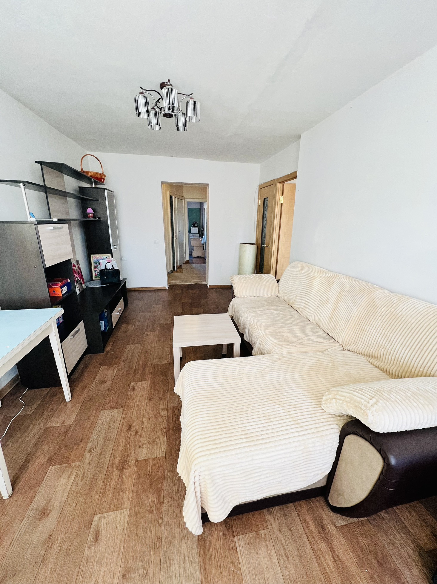 Очень просторная трехкомнатная квартира. Окна выходят на обе стороны дома. В квартире выполнен косметический ремонт, установлены пластиковые окна, балкон  остеклен и обшит панелями. Выровнены полы. На полу линолеум.