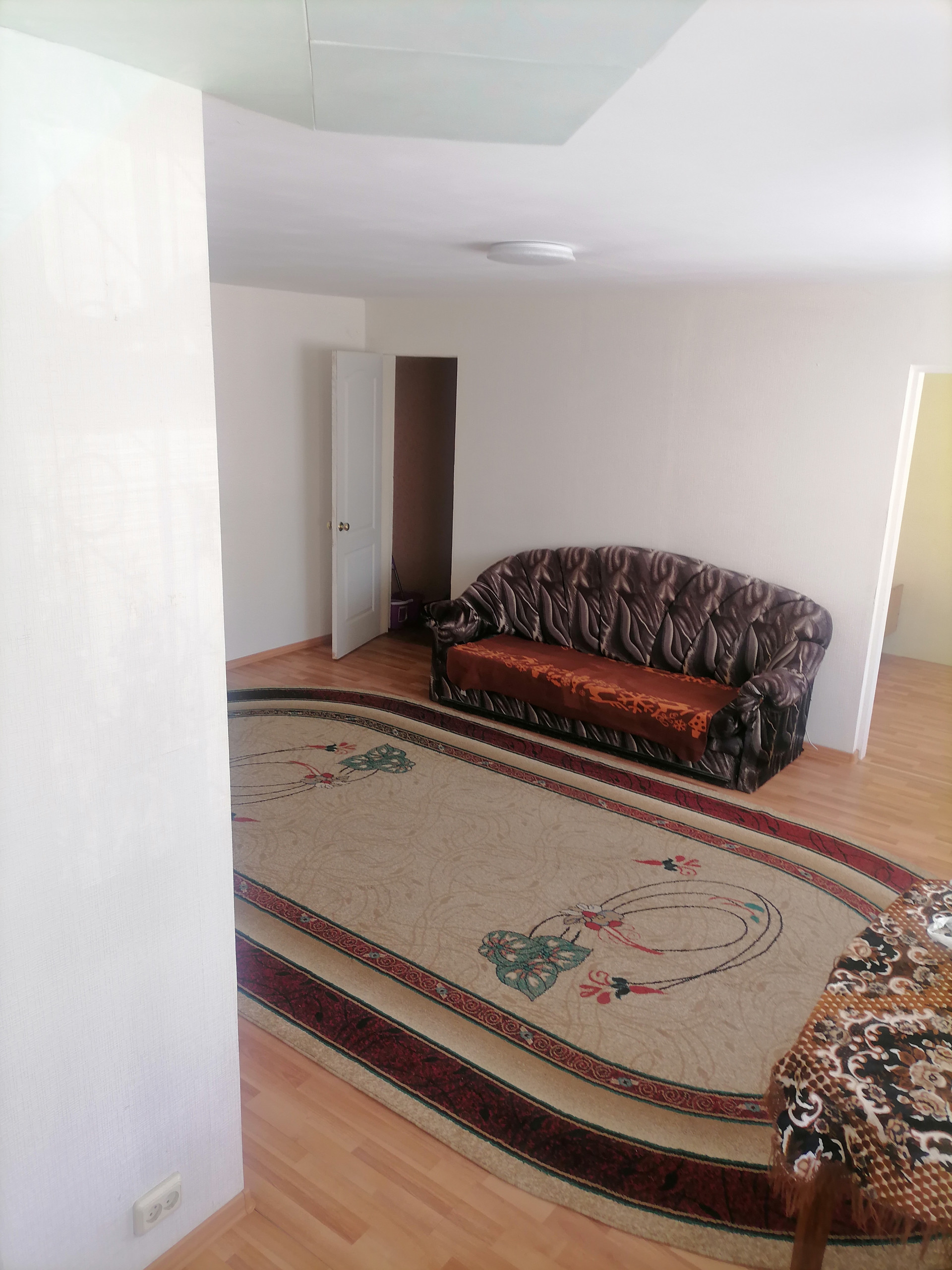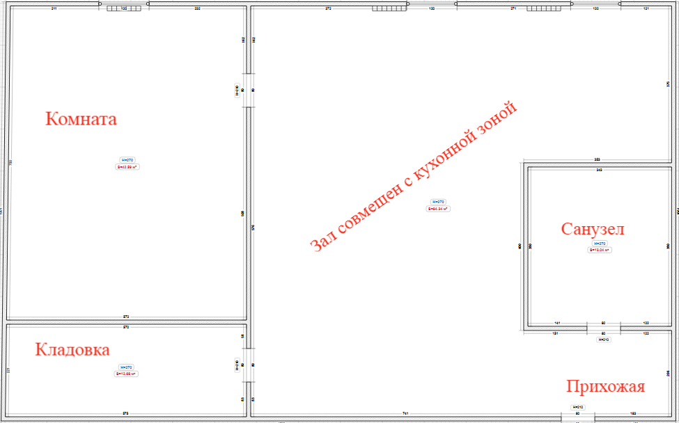 В квартире сделана небольшая перепланировка - соединены зал и кухня, большая кладовка типа гардеробная.