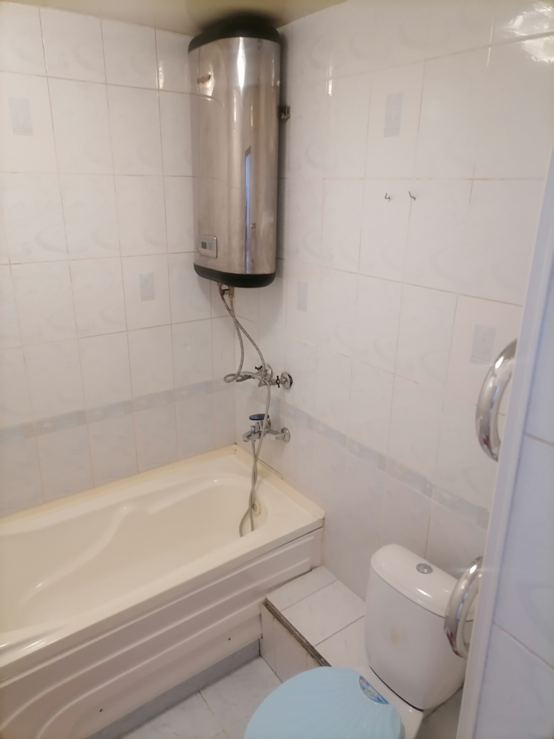 Ванная комната отделана кафелем, современный счетчик на электричество, счетчики на воду, хорошая входная дверь.