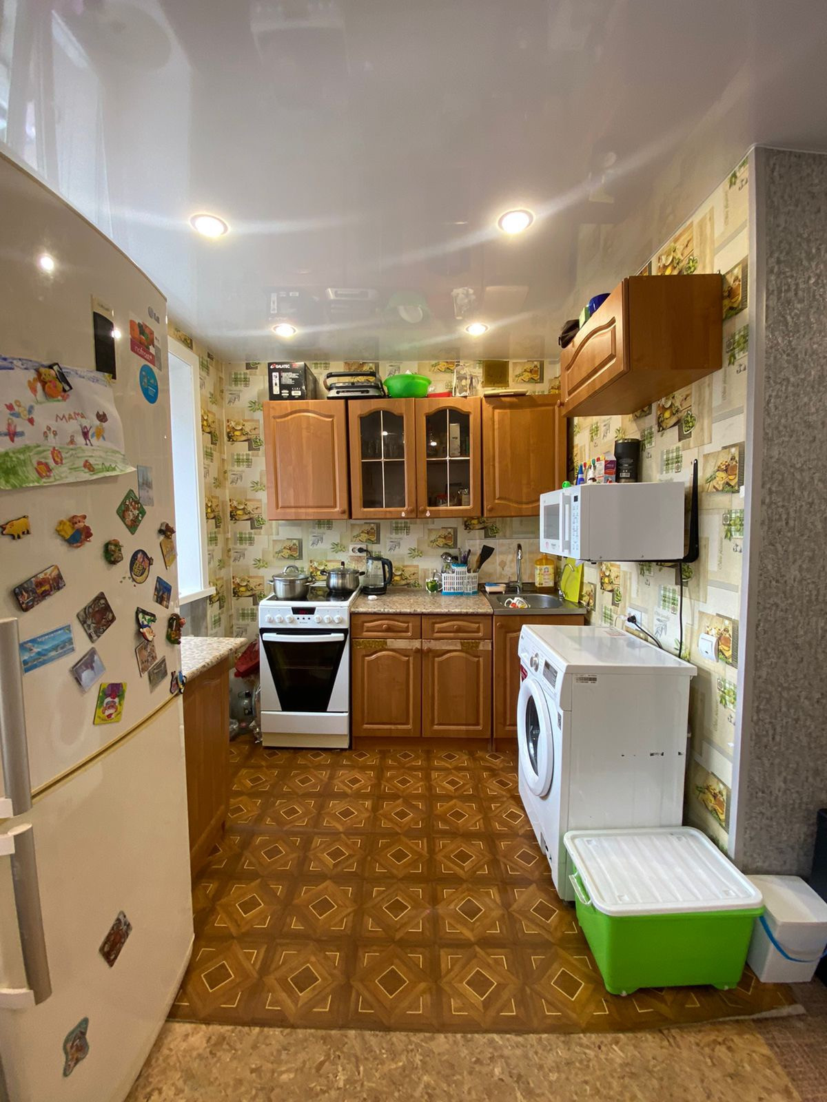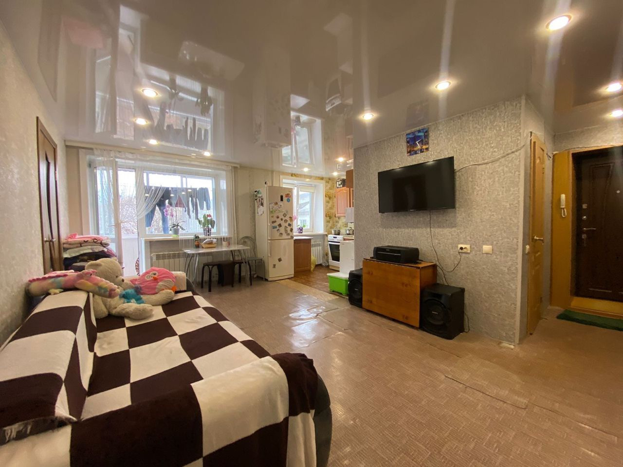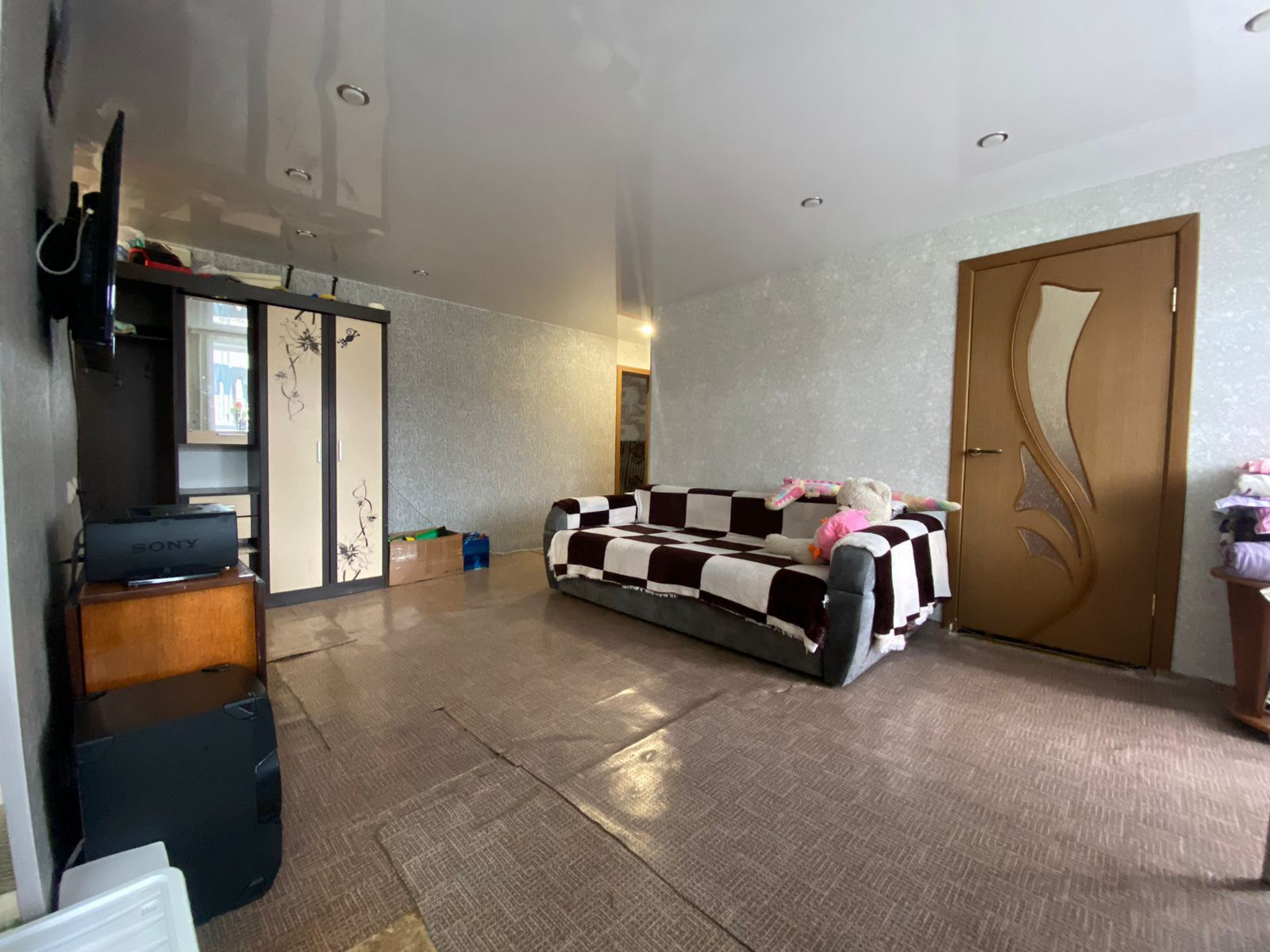 Очень просторная, Выполнена перепланировка кухня+гостиная. Установлены пластиковые окна, межкомнатные двери, входная металлическая дверь, балкон остеклен и выполнена отделка пластиковыми панелями. Санузел совмещен, сантехника в отличном состоянии. Заменены радиаторы, электропроводка. Стены выровнены, натяжные потолки, софиты, в двух комнатах ламинат.