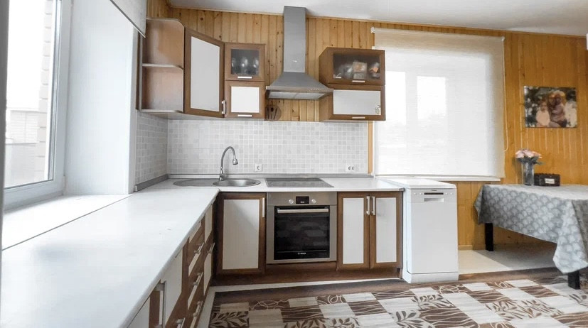 большая светлая кухня и коридоры отделаны евровагонкой,
