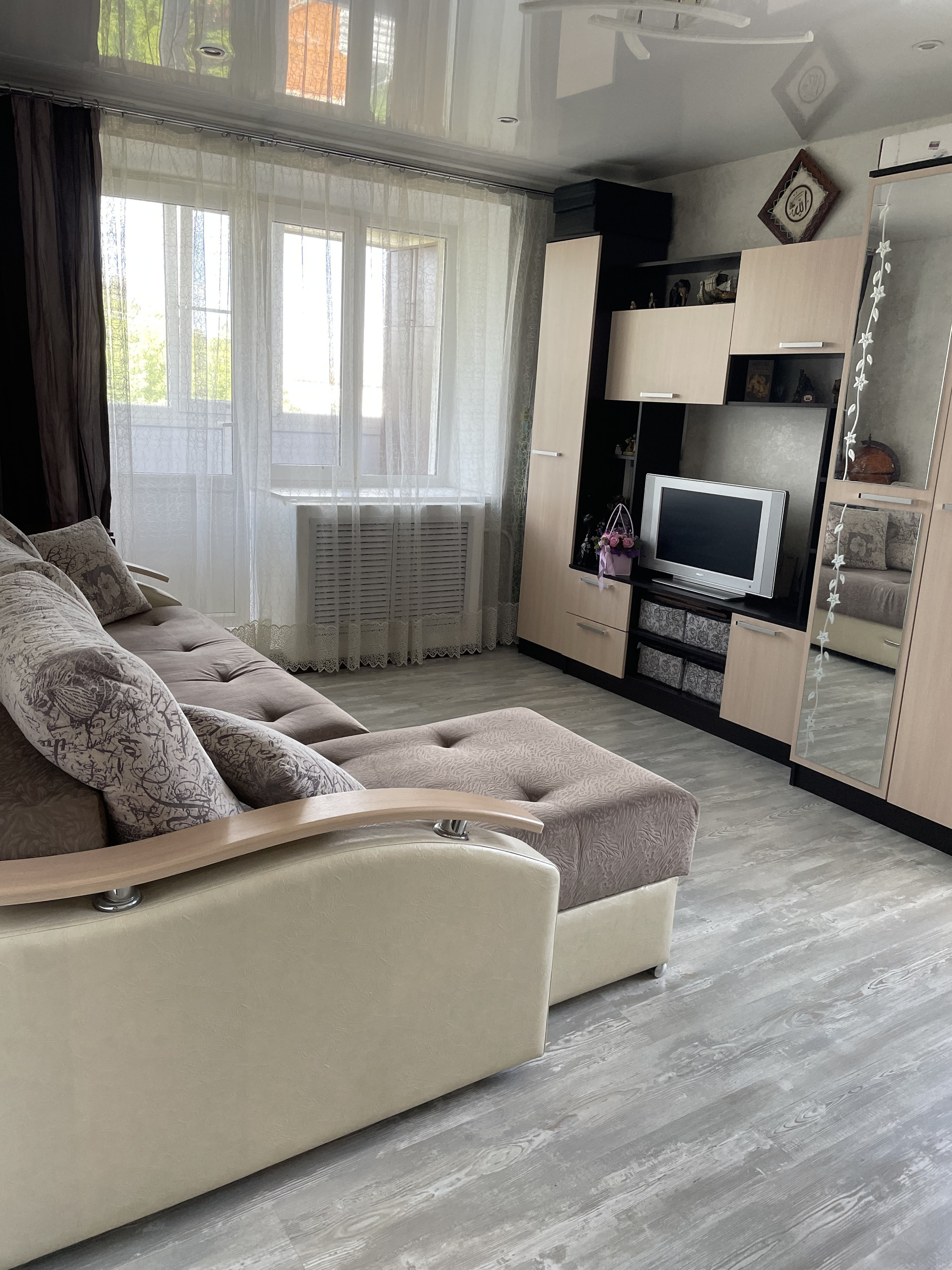 - Остаётся: кухонный гарнитур, варочная панель, духовой шкаф, встроенные шкафы- купе в прихожей, комплект мебели в жилой комнате.