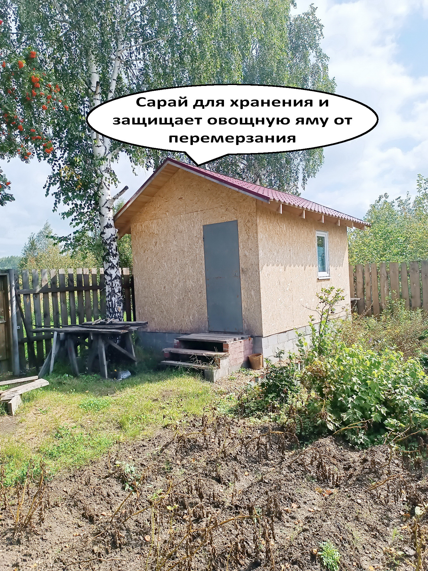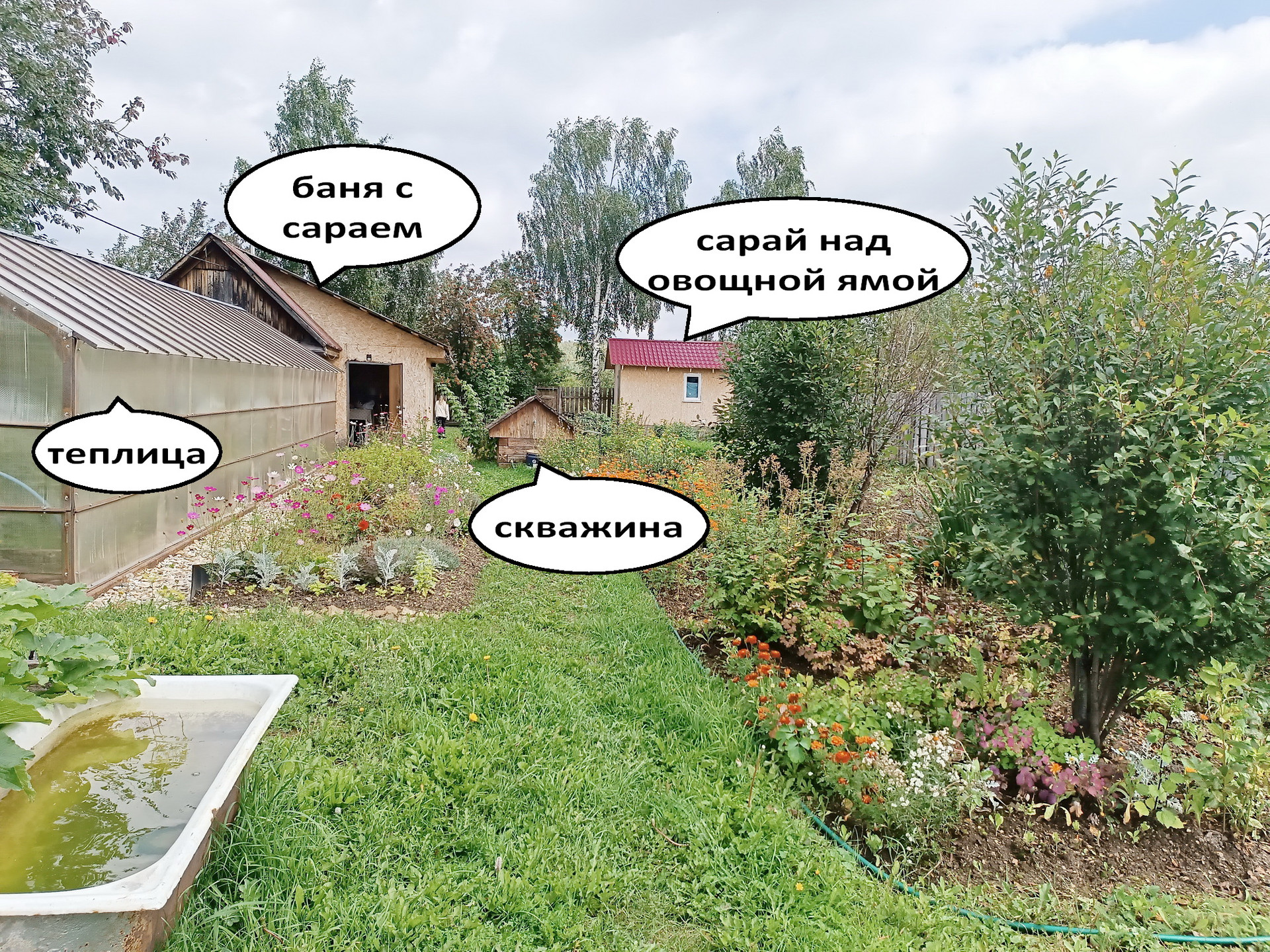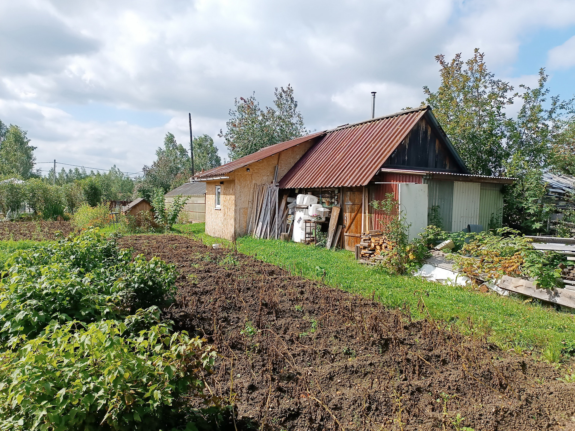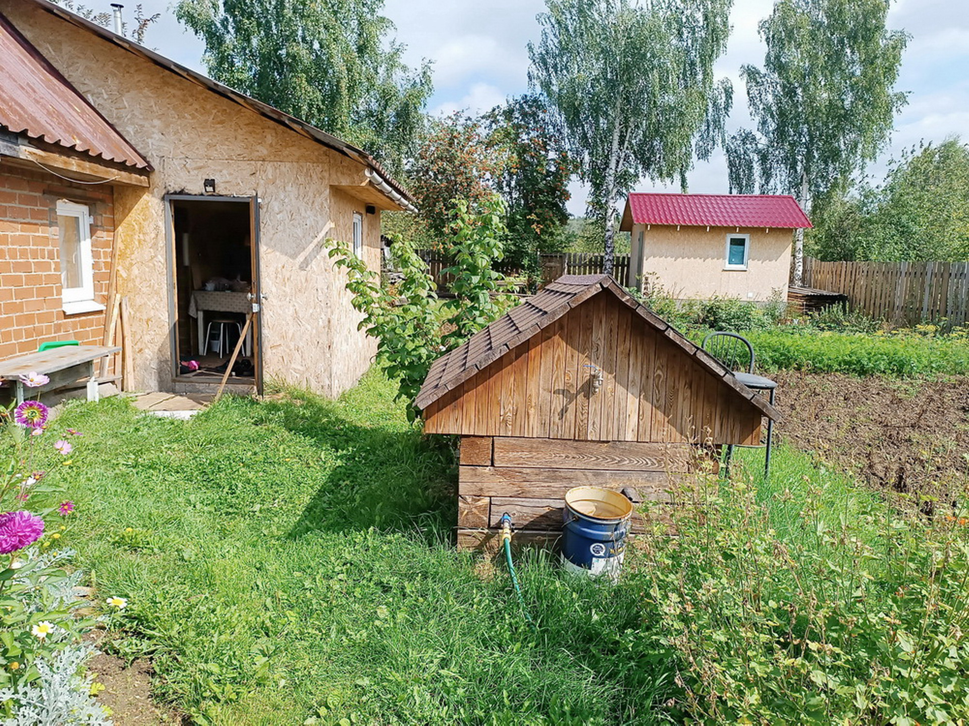 На участке есть баня (парилка + помывочная + комната отдыха), дровяник, овощная яма с сараем над ней, беседка, мангал, стойка для гамака, фундаментные блоки для построек.