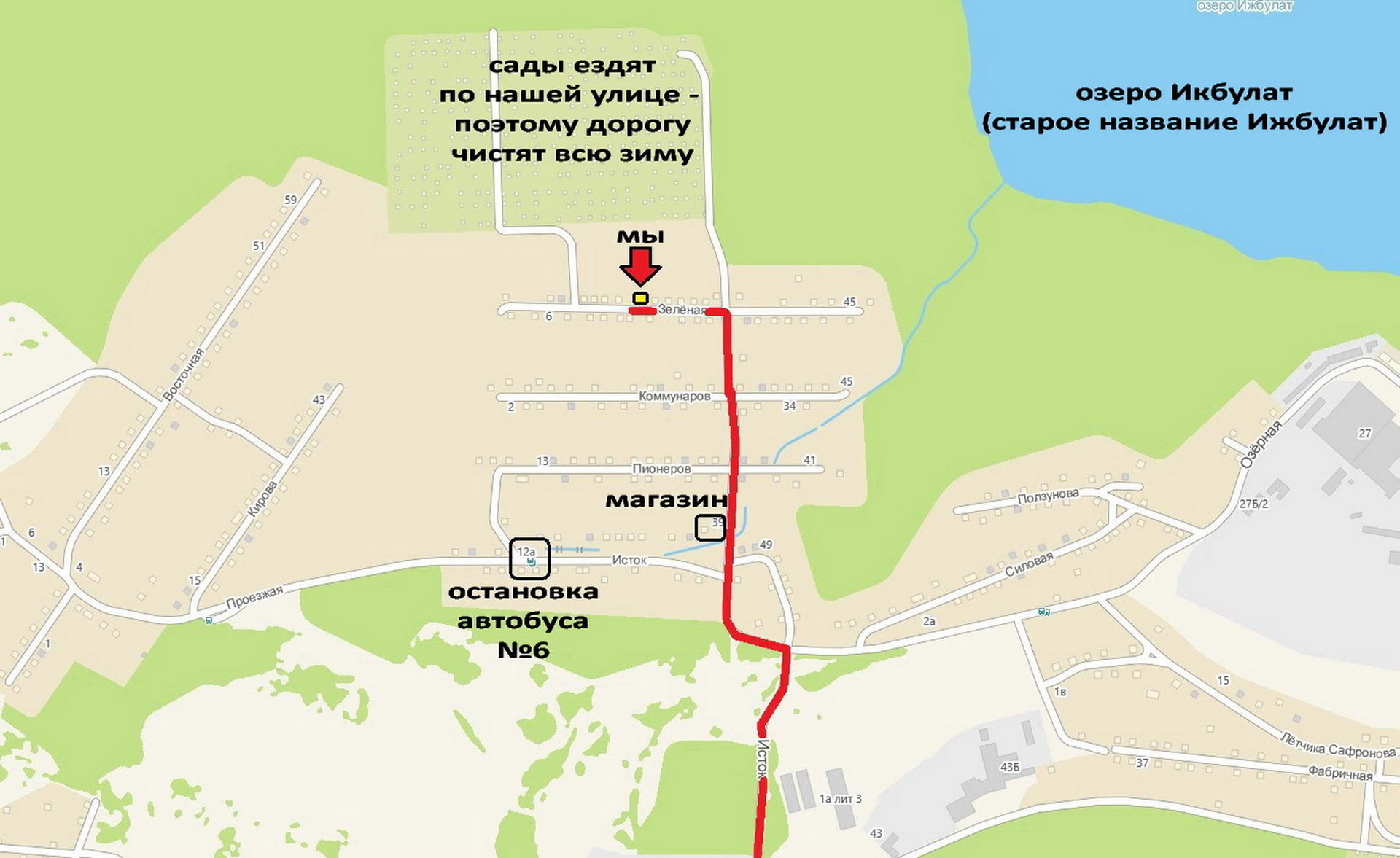 Недалеко магазин и остановка автобуса, наша улица крайняя, за нами домов/участков нет, на отдалении через пустырь расположены сады.